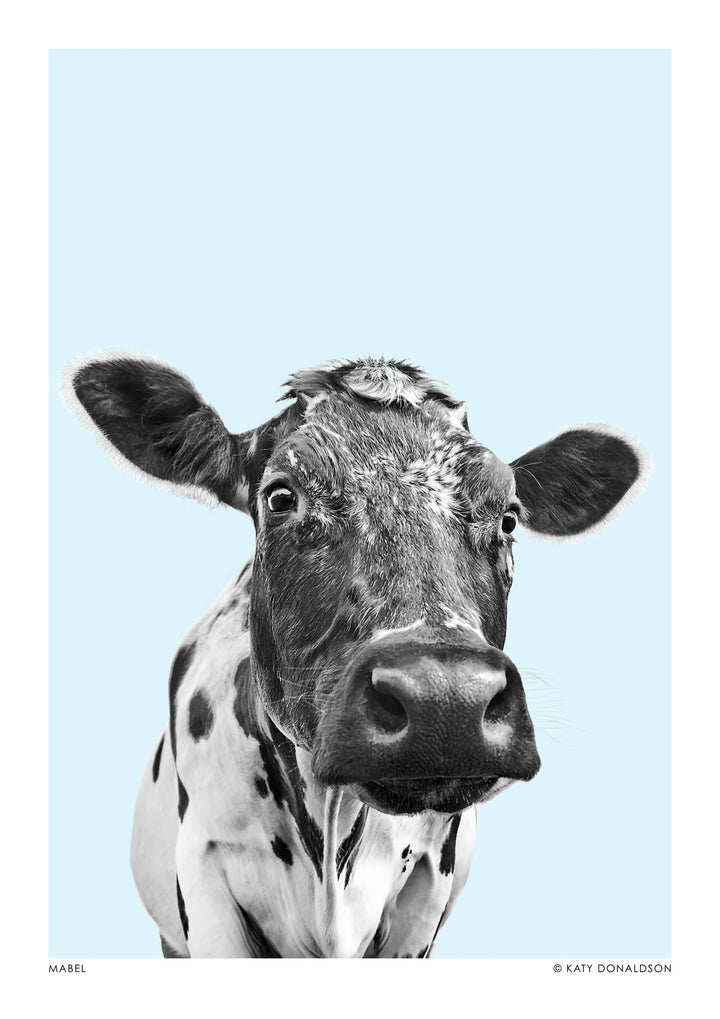 "Mabel" by Katy Donaldson is a playful photographic portrait showcasing a black-and-white cow against a soft blue background. This modern, cute animal poster captures the cow's curious expression in stunning detail, making it a perfect addition for those who appreciate rural charm and contemporary photography. Ideal for adding a touch of nature to any space.