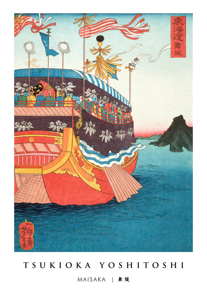 This "Maisaka" poster by Tsukioka Yoshitoshi captures a vibrant Ukiyo-E woodblock scene. Featuring a traditional Japanese boat adorned with flags and a lively crowd set against a tranquil water backdrop, it portrays the cultural richness of Japan. Highlighted by a distant mountain, this piece embodies the elegance and detailed craftsmanship typical of traditional Japanese art.
