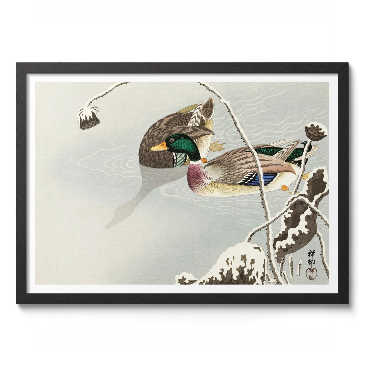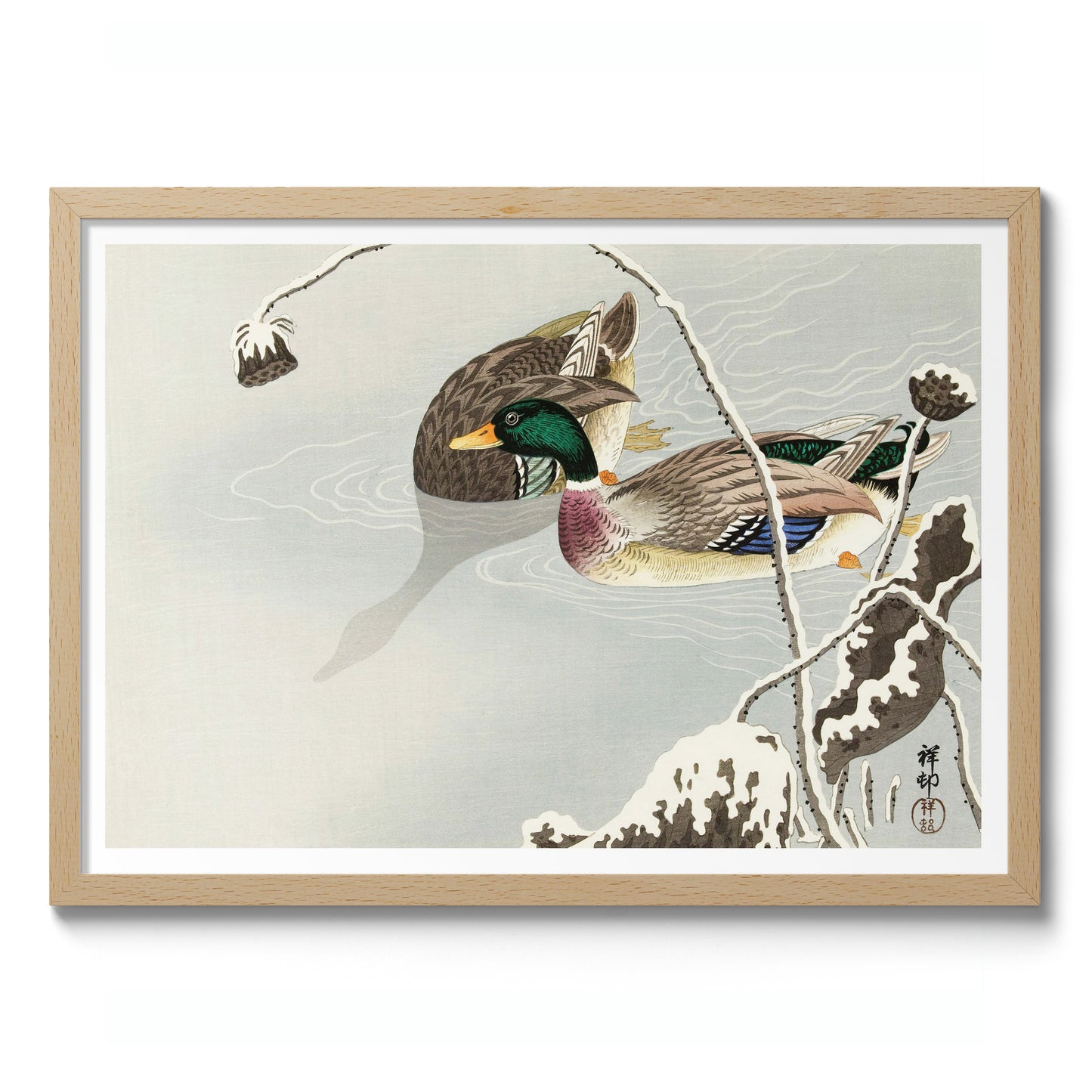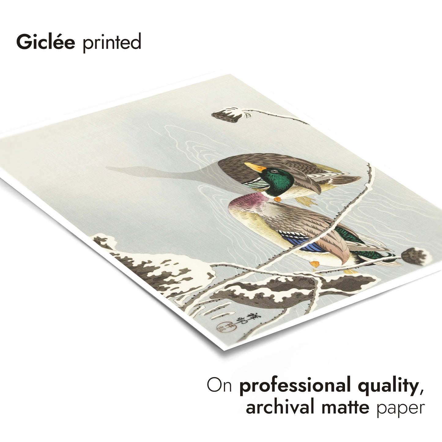 This elegant woodblock print poster by Ohara Koson features two striking mallards swimming gracefully on a serene winter lake. The delicate illustration showcases traditional Japanese Ukiyo-E style with intricate details of the ducks and surrounding branches. The subtle whites, browns, and beiges capture a tranquil winter scene, perfect for art enthusiasts drawn to nature themes.