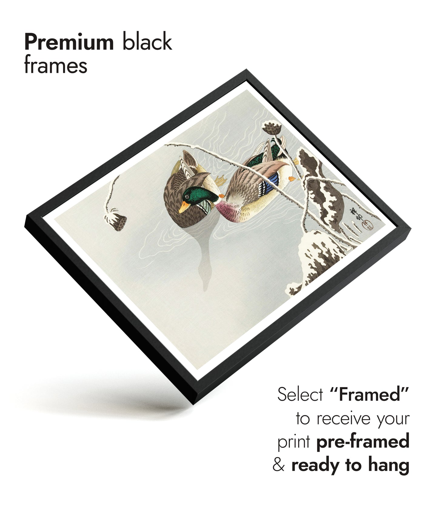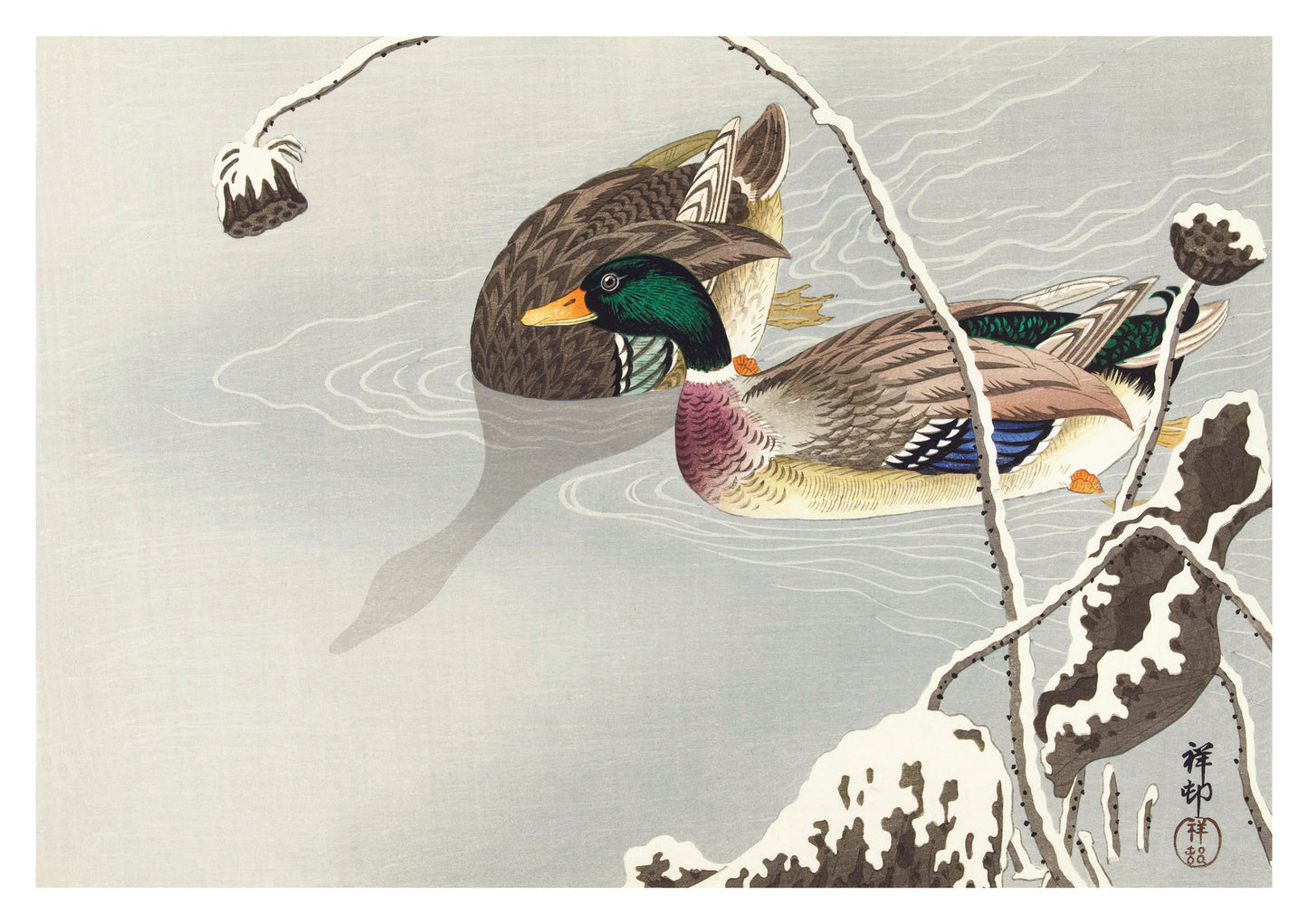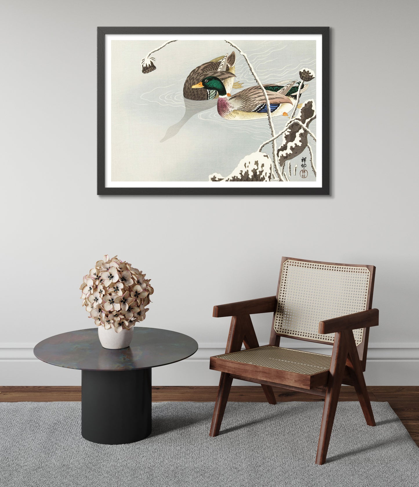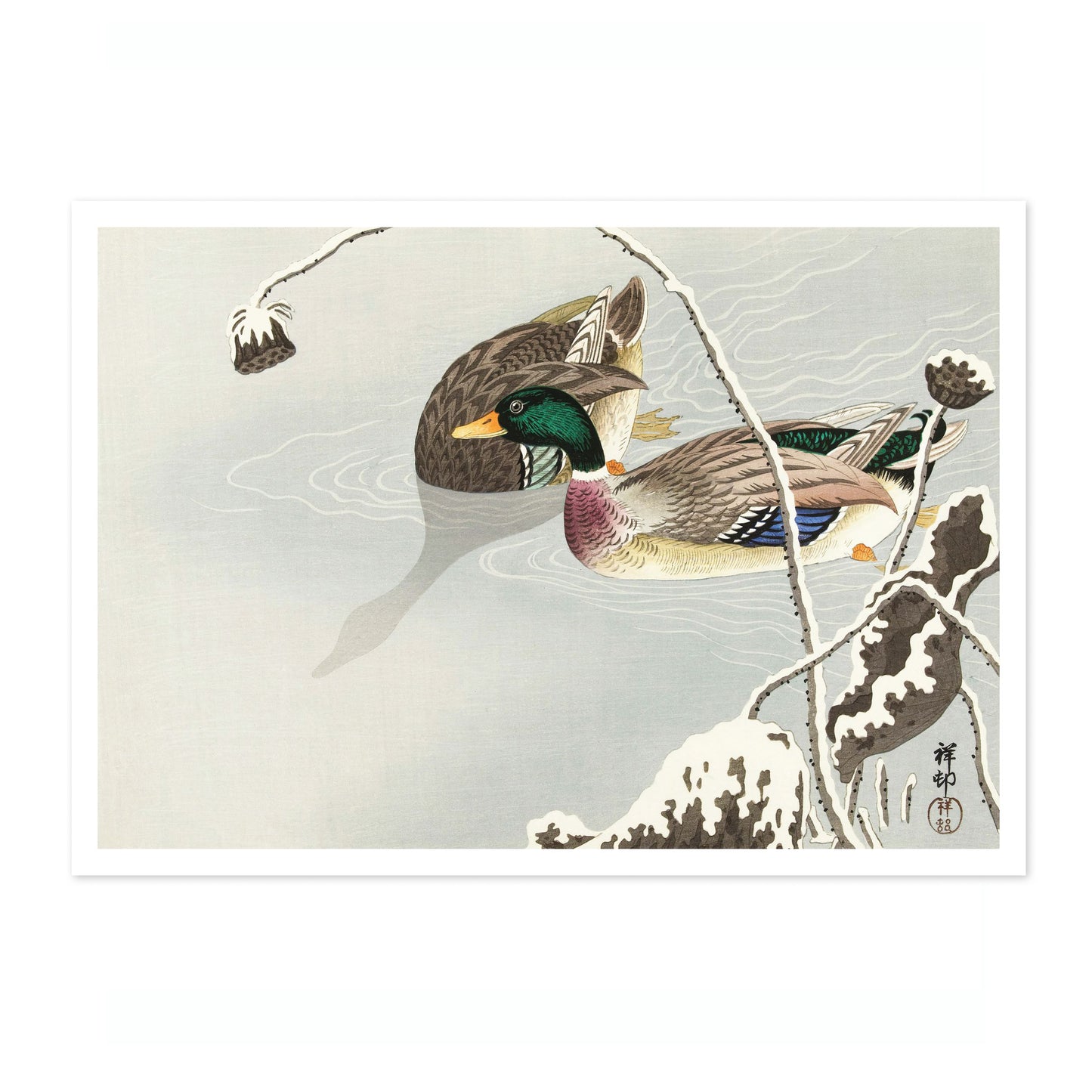 This elegant woodblock print poster by Ohara Koson features two striking mallards swimming gracefully on a serene winter lake. The delicate illustration showcases traditional Japanese Ukiyo-E style with intricate details of the ducks and surrounding branches. The subtle whites, browns, and beiges capture a tranquil winter scene, perfect for art enthusiasts drawn to nature themes.