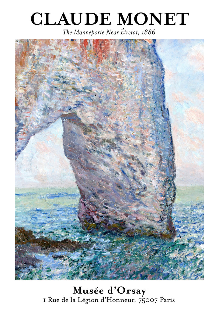 This Claude Monet poster features "The Manneporte Near Étretat, 1886," showcasing the renowned Impressionist's masterful depiction of a grand cliff arch and shimmering waves. The landscape captures the dynamic interplay of light and colour, bringing the coastal scene to life. Ideal for art lovers, this poster adds a touch of classic beauty to any space. Museum-quality reproduction.