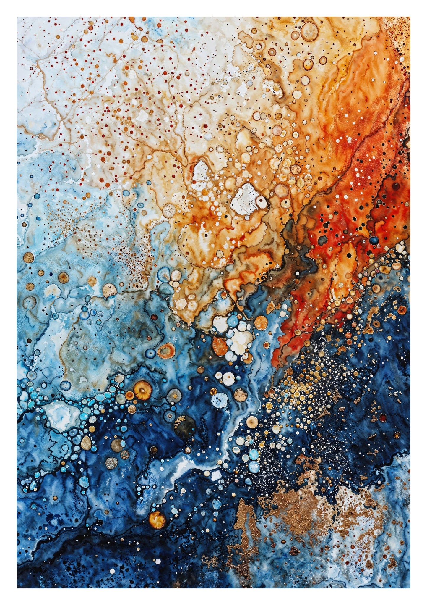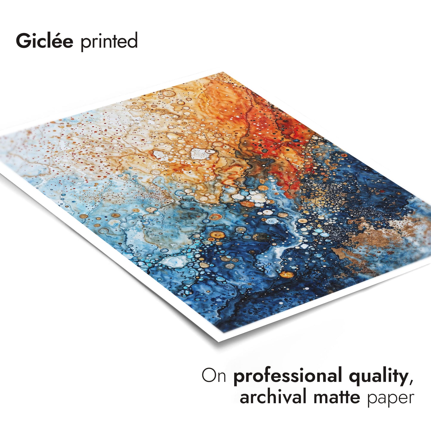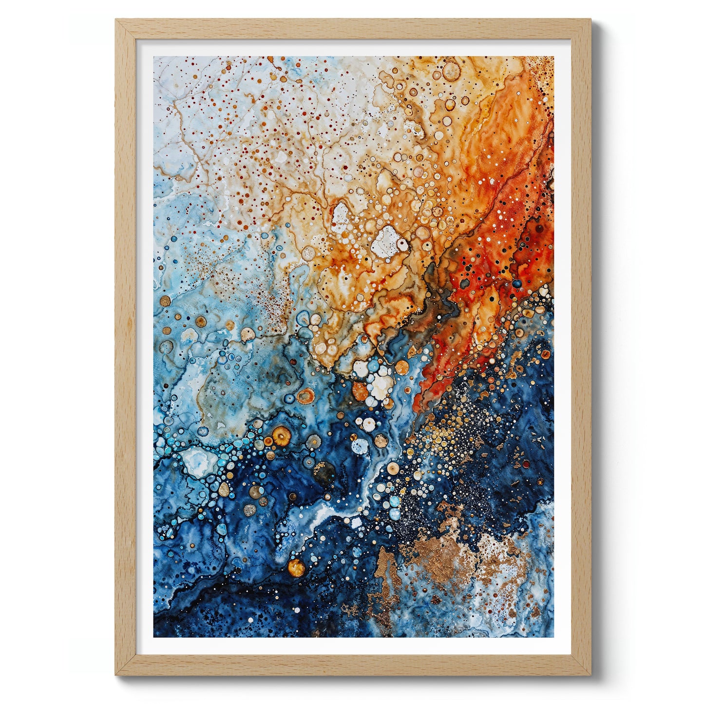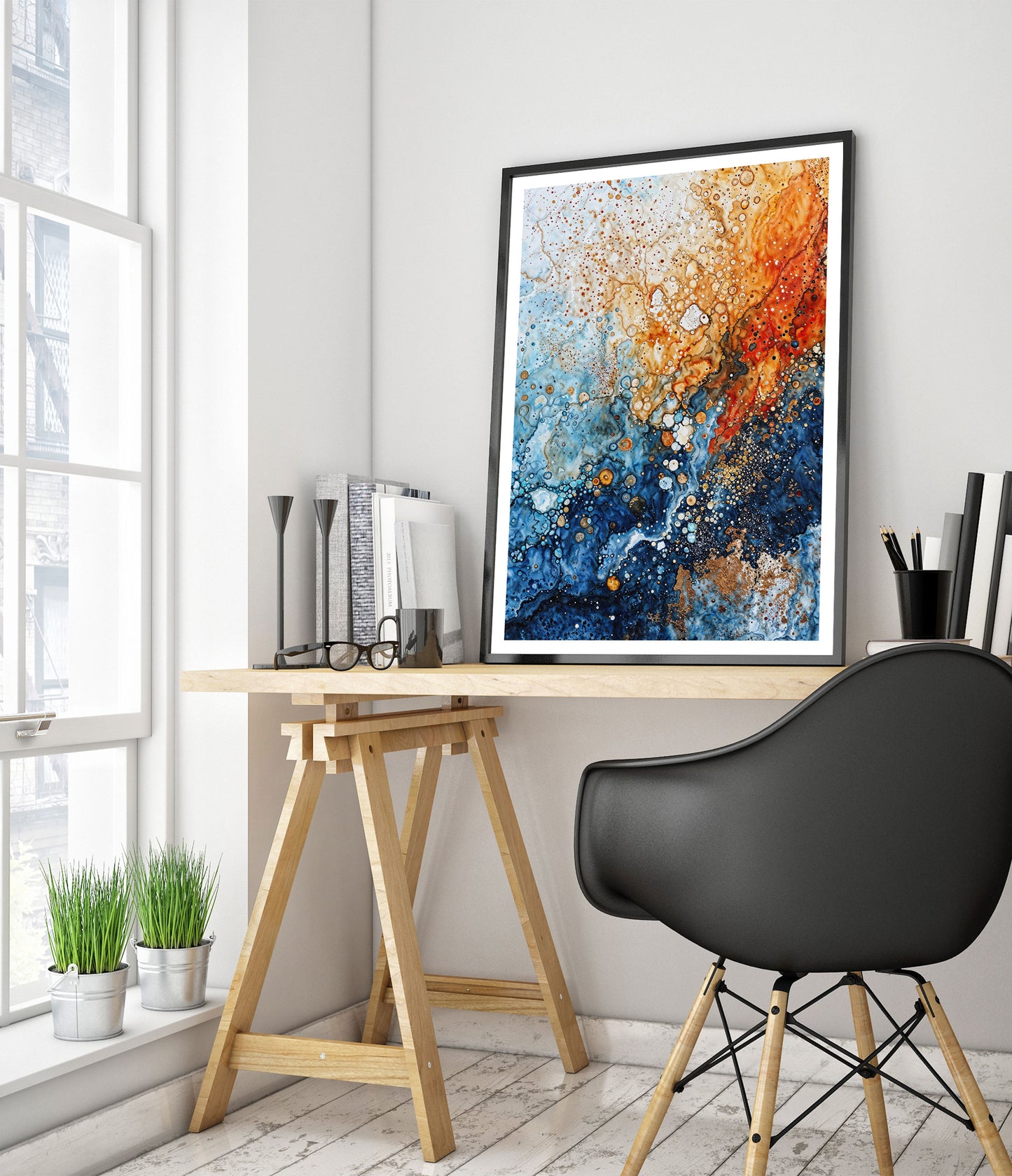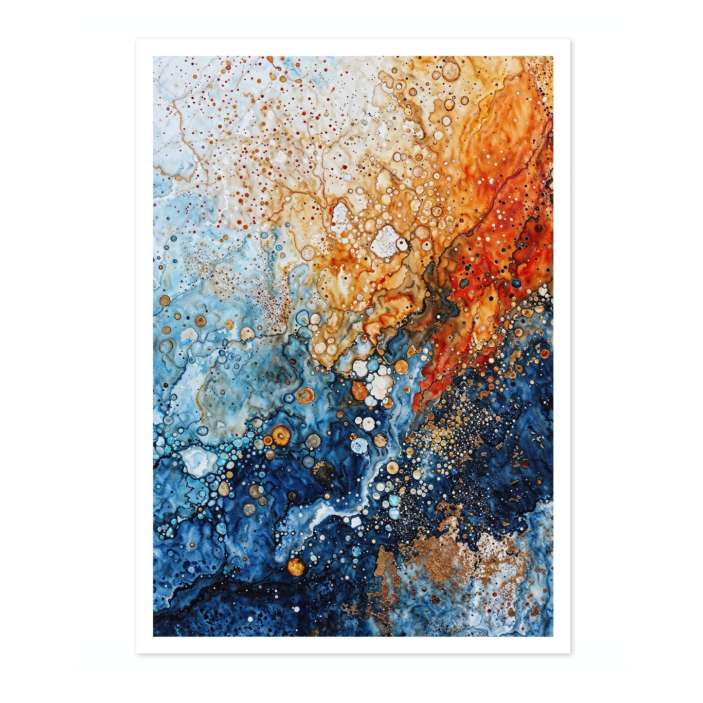 "Marble, Portrait II" abstract art poster showcases a mesmerizing blend of vibrant blue, orange, and white hues. The intricate marble-like patterns create dynamic, fluid movements, evoking a sense of depth and complexity. This stunning abstract painting poster is perfect for adding a touch of contemporary elegance and artistic flair to any space.