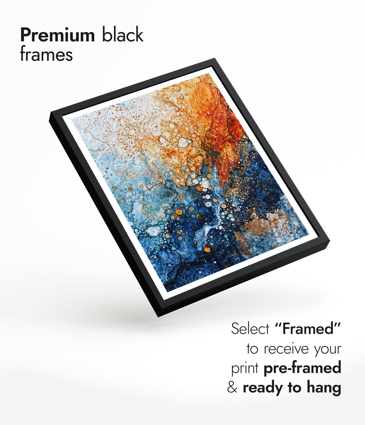 Solid wood frames available in black stained or natural finishes, with UV resistant acrylic glass. Framed orders arrive pre-installed with your choice of print, ready to hang. Available in all print sizes.