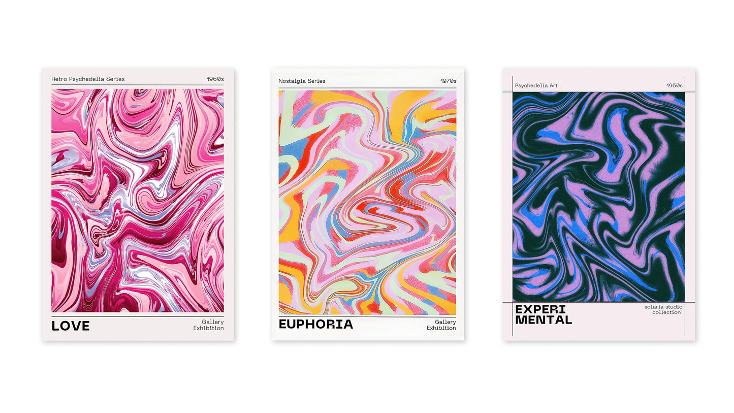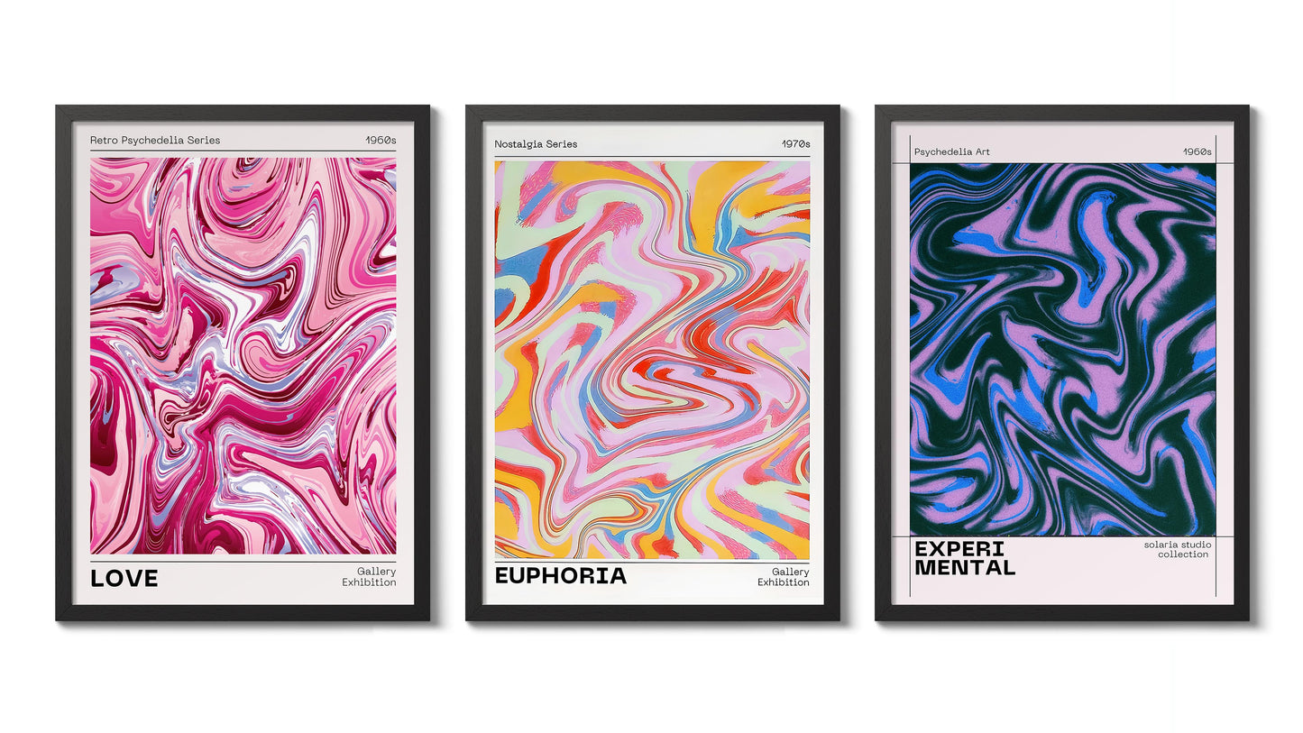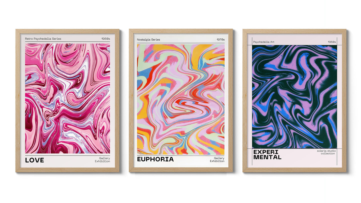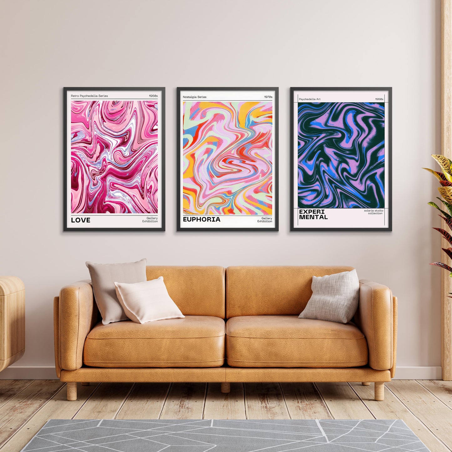 The "Marbled Affirmations" poster set features vibrant abstract designs with psychedelic swirls in pink, purple, and teal. Each piece is a modern, graphic representation evoking dynamic emotions. Perfect for adding a burst of color and movement to any space, these abstract posters highlight themes of shapes and vibrant vibes, ideal for those seeking an expressive art display.