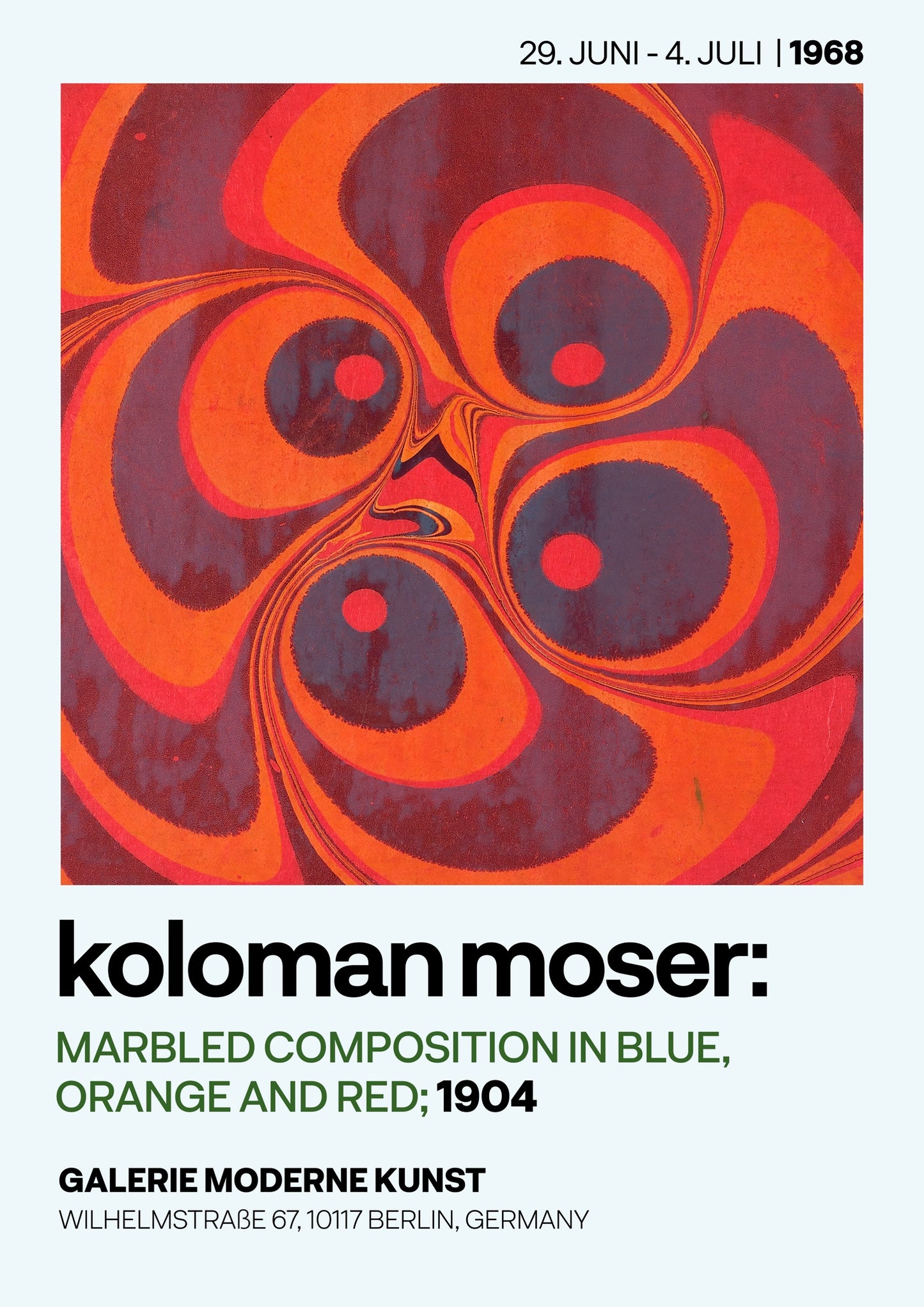 This art print poster titled "Marbled Composition in Blue, Orange & Red" by Koloman Moser, showcases swirls of vibrant colours forming intricate floral and circular patterns. Inspired by abstract and exhibition art styles, this 1904 piece offers a captivating visual experience. Ideal for adding a touch of artistic flair to any space, this beautifully crafted portrait embodies dynamic movement and bold hues.