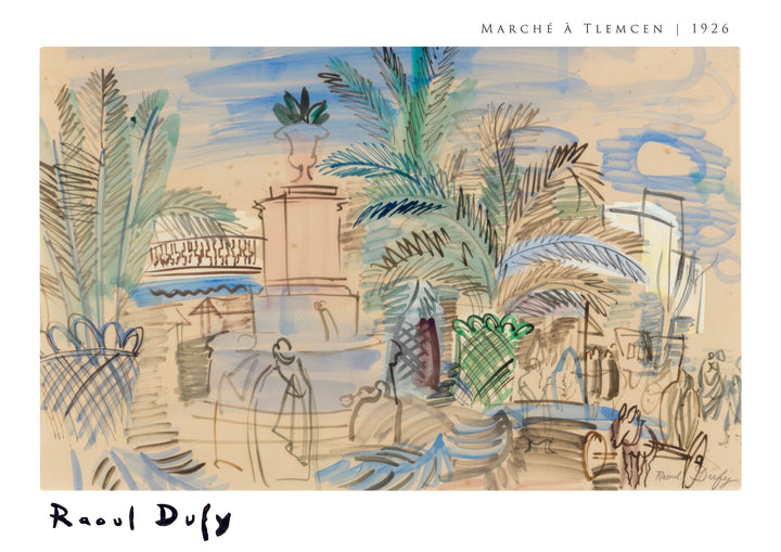 Discover Raoul Dufy's "Marché à Tlemcen" masterpiece. This Fauvist poster features a bustling market scene with palm trees, a horse-drawn carriage, and a lively crowd. Rendered in delicate watercolours, it captures the vibrant essence and dynamic movement of daily life, making it a timeless addition to any art collection. Perfect for landscape and still-life enthusiasts.