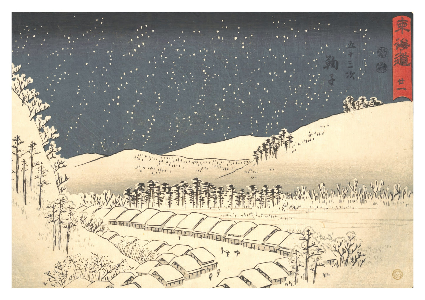 The "Mariko, from the Tokaido Series" poster by Utagawa Hiroshige showcases a serene winter landscape in the traditional woodblock ukiyo-e style. Featuring a snow-covered village nestled in a valley under a starlit sky, this artwork captures the tranquility of rural Japan. The detailed trees and subtle colour palette enhance the peaceful winter scene. Ideal for fans of Japanese traditional art and woodblock prints.
