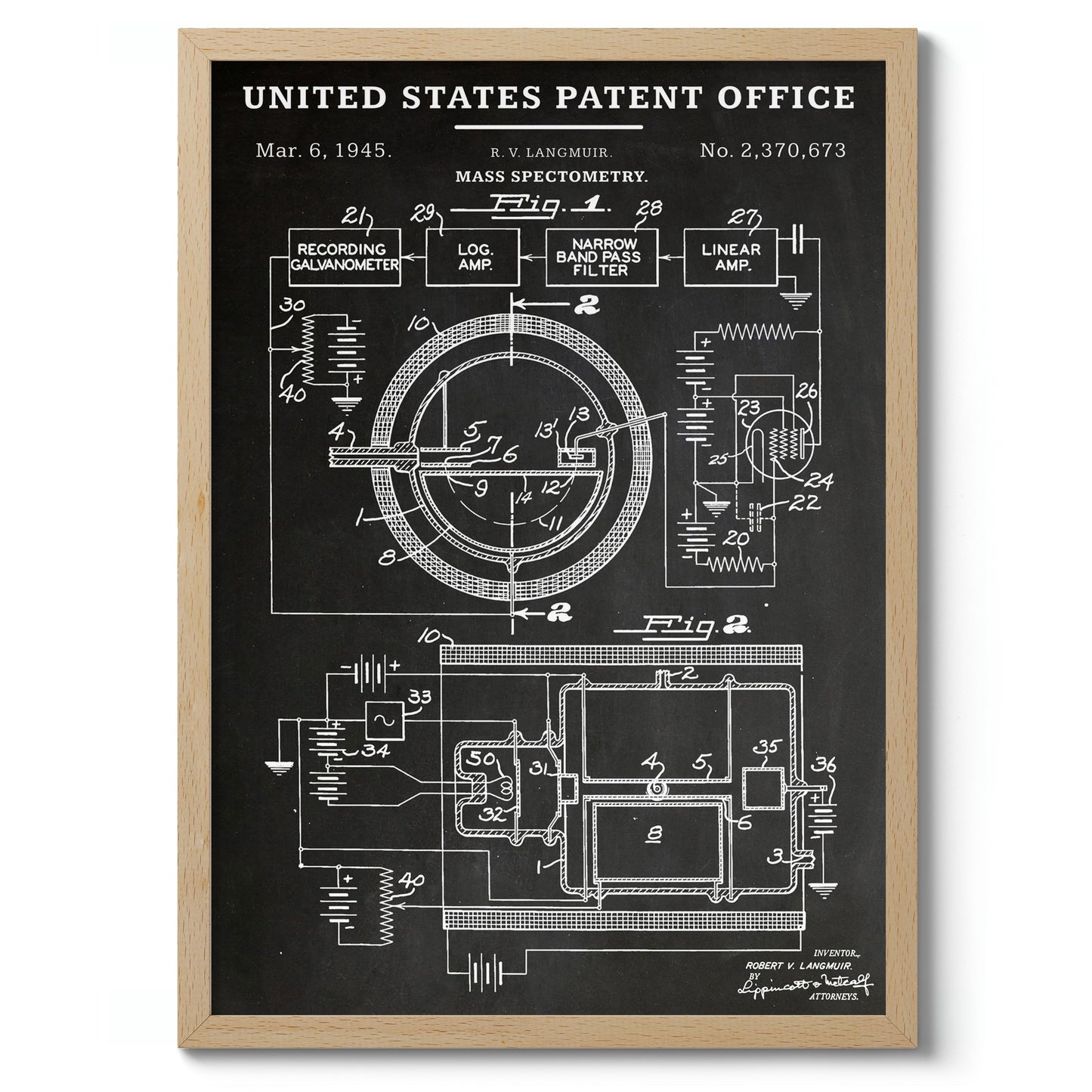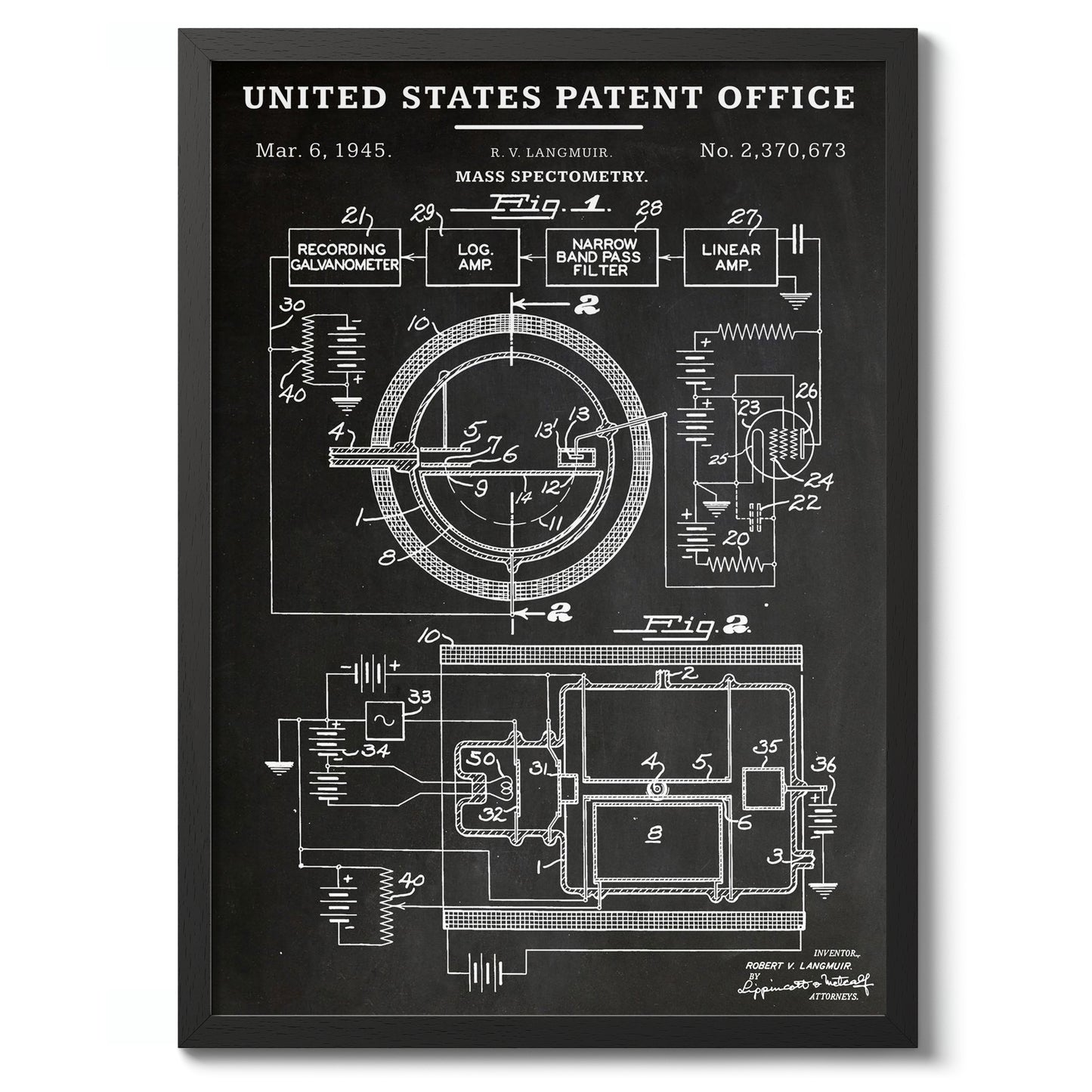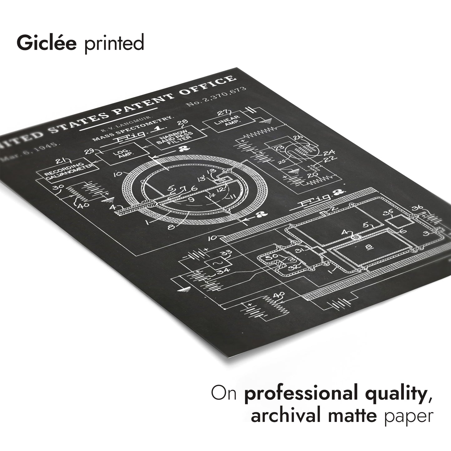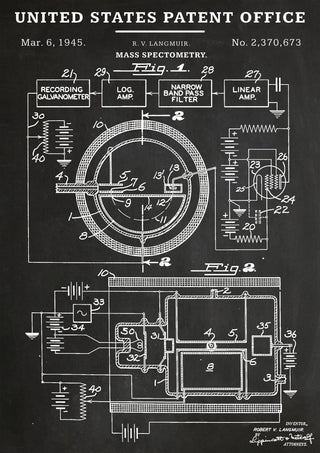 This black and white patent poster illustrates a vintage mass spectrometry design, with detailed schematics and annotations. The depiction highlights intricate scientific components, including galvanometers and amplifiers, typical of early to mid-20th-century engineering. Ideal for enthusiasts of vintage science posters, it captures the historical essence of scientific innovation and invention through precise line art.