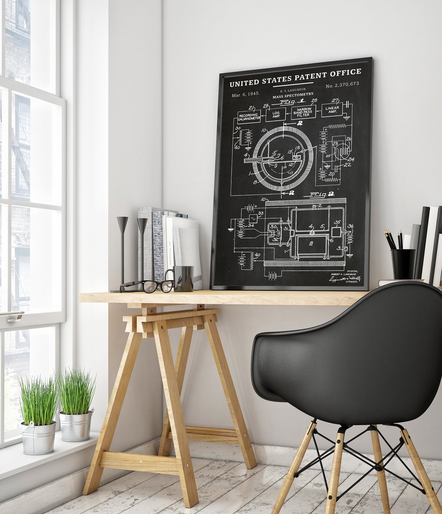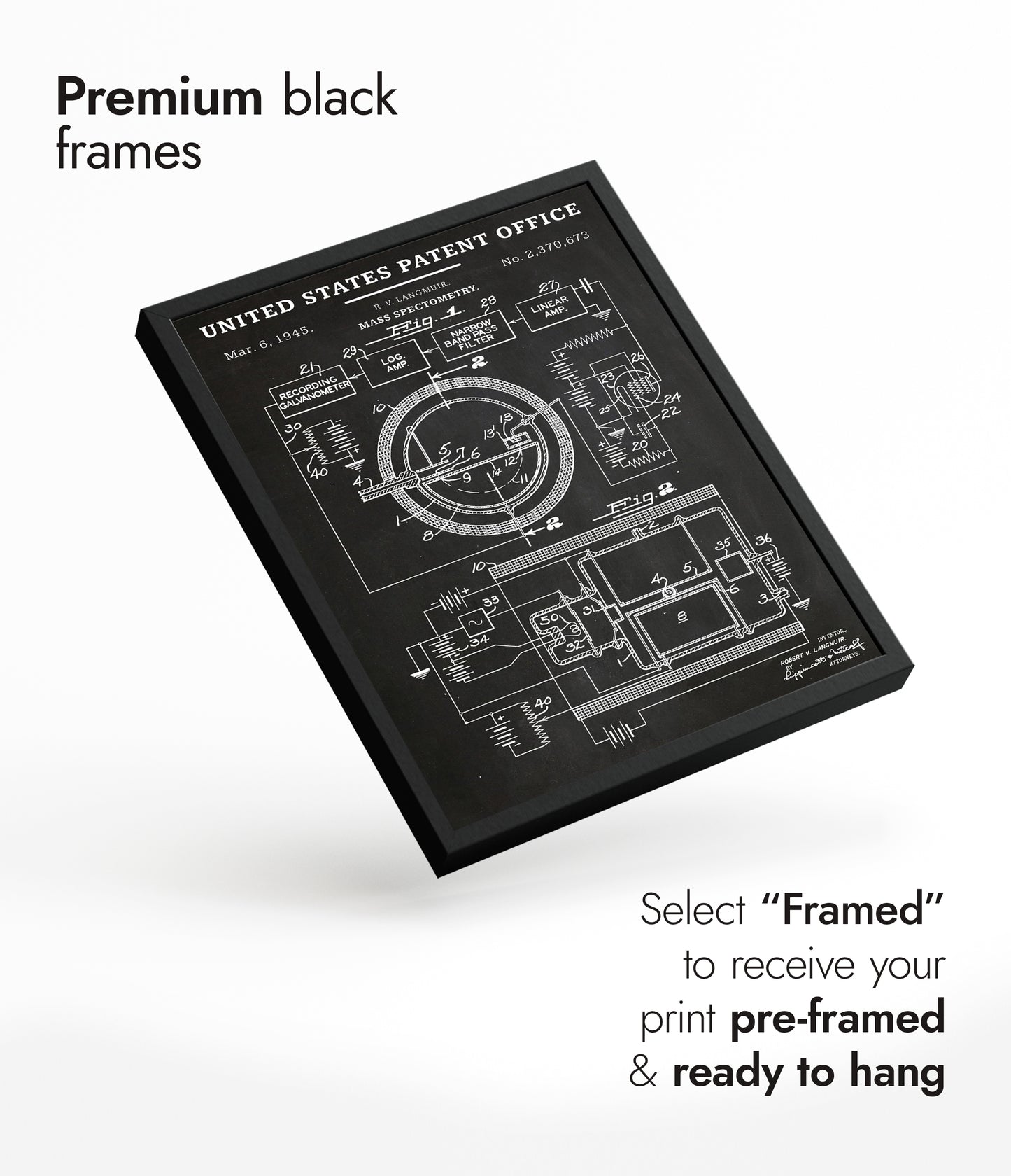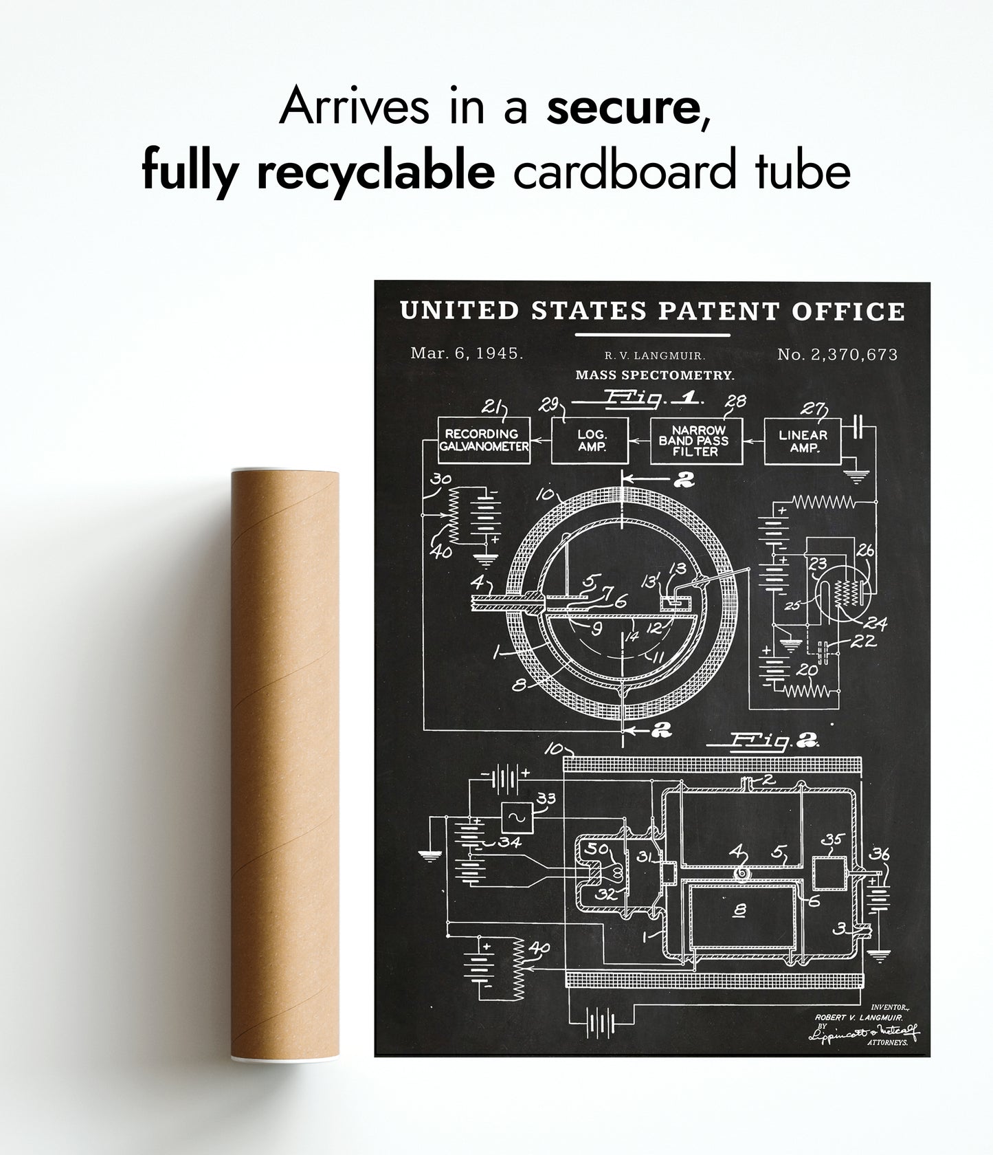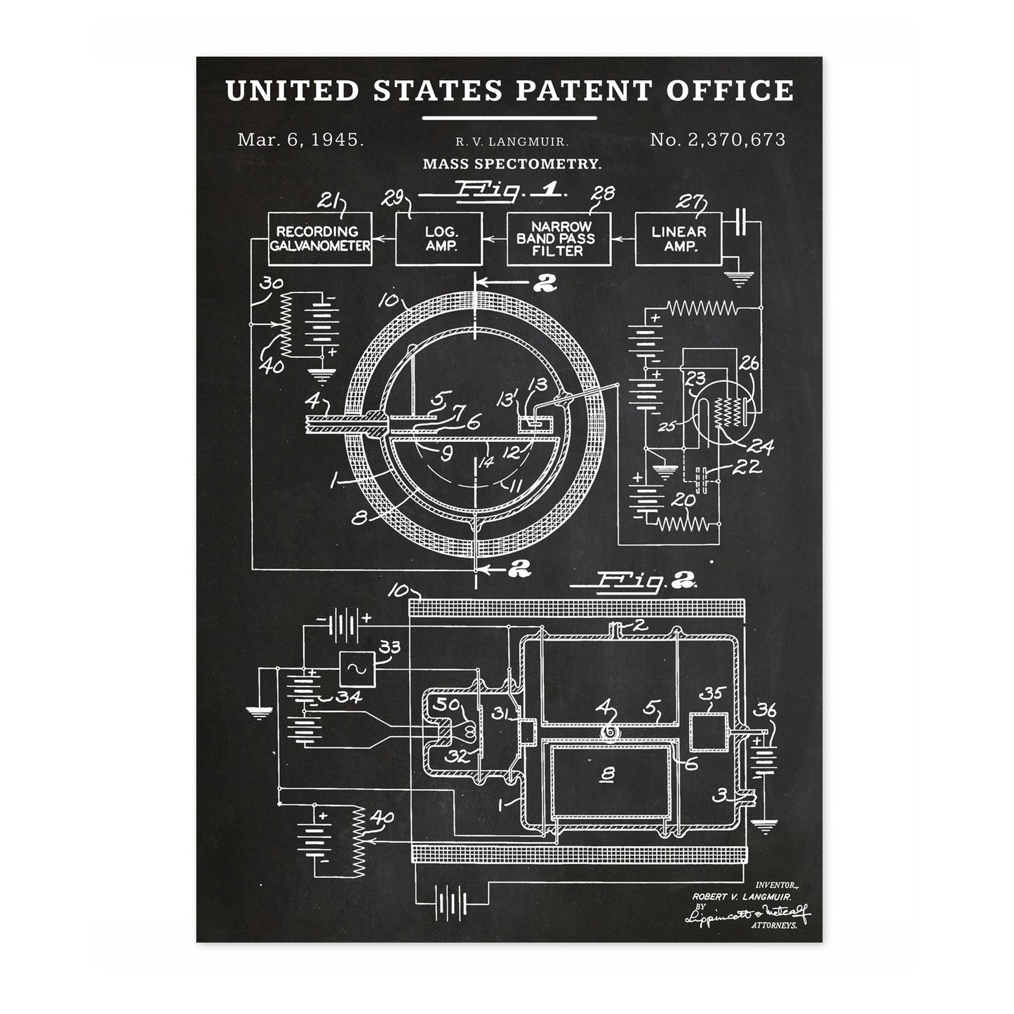 This black and white patent poster illustrates a vintage mass spectrometry design, with detailed schematics and annotations. The depiction highlights intricate scientific components, including galvanometers and amplifiers, typical of early to mid-20th-century engineering. Ideal for enthusiasts of vintage science posters, it captures the historical essence of scientific innovation and invention through precise line art.