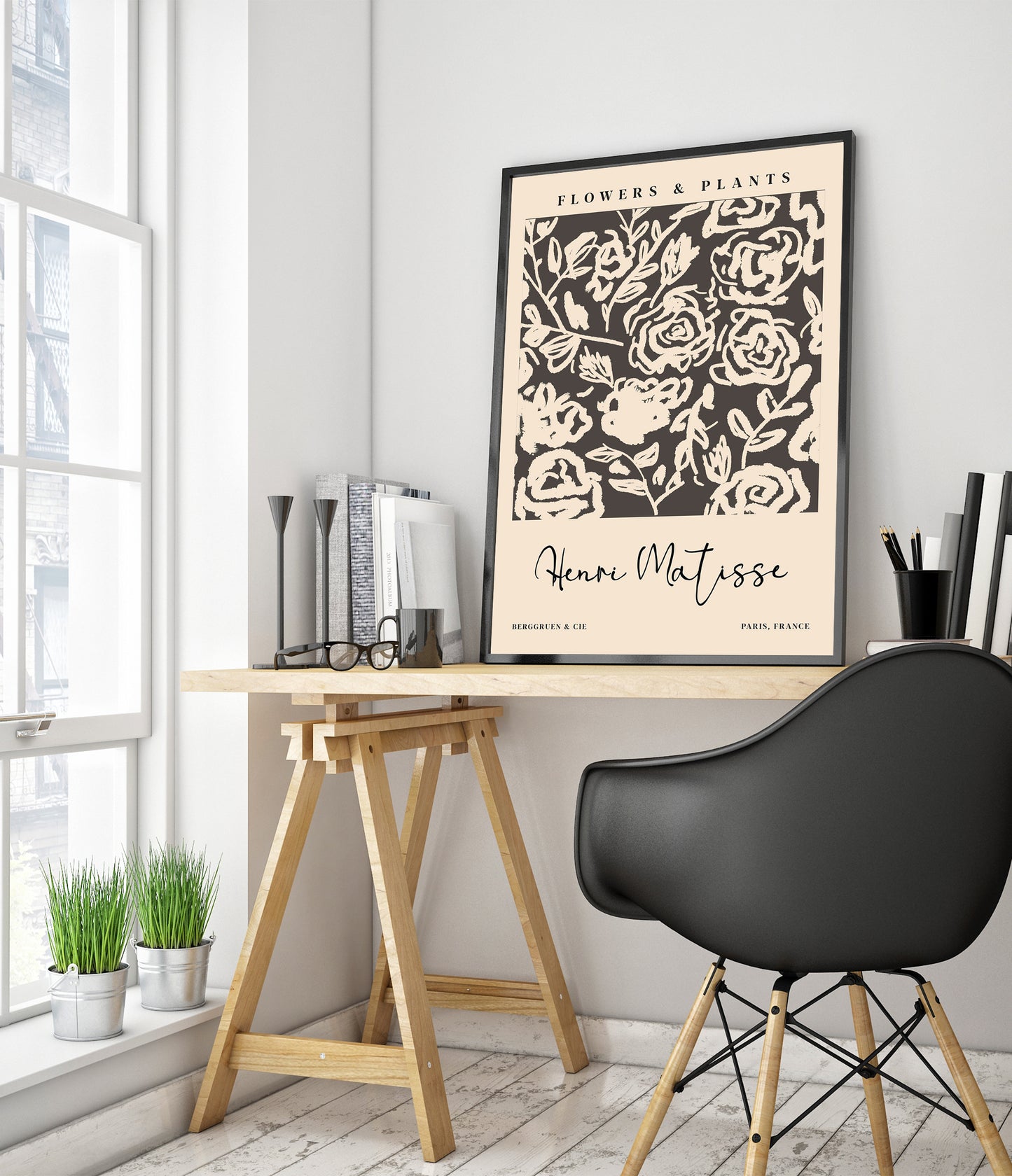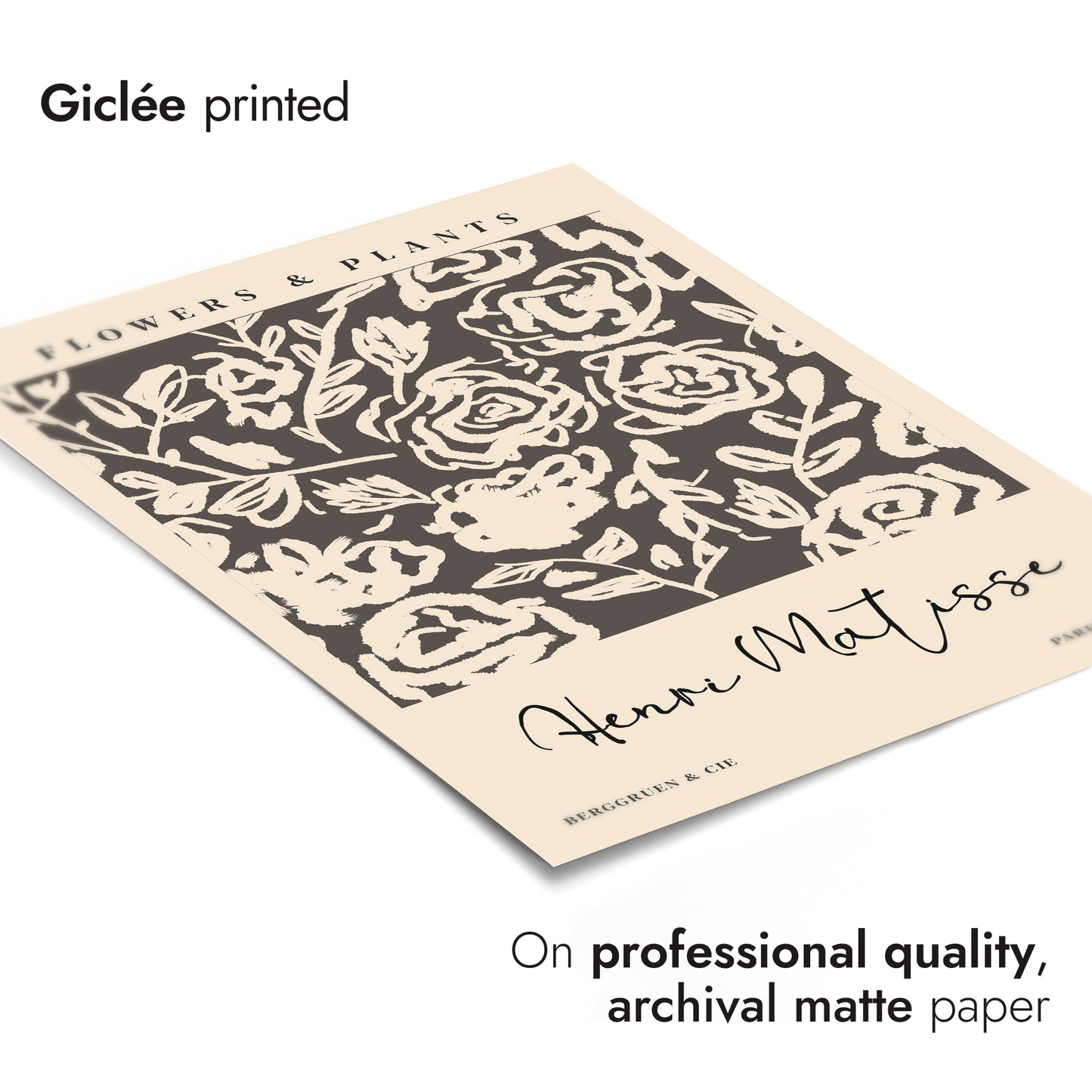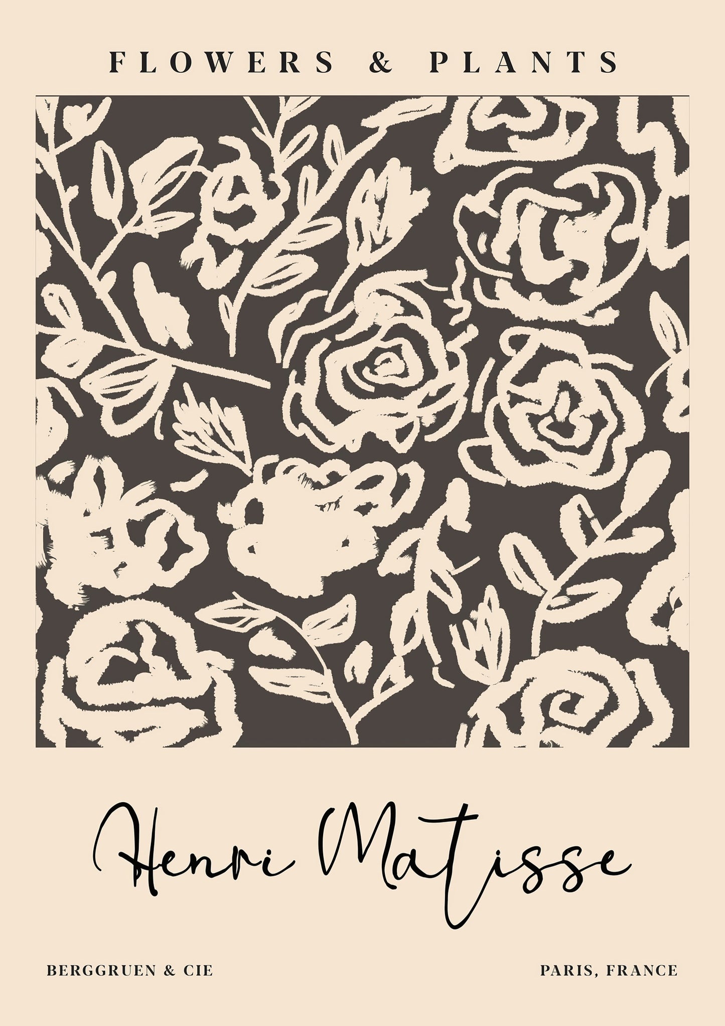 This Henri Matisse floral poster features an intricate beige and black cutout design, showcasing stylized flowers and plants. Emphasizing graphic and collage elements, the piece embodies Matisse's signature artistic style. Ideal for lovers of floral and exhibition themes, this striking artwork adds sophistication and elegance to any space with its bold patterns and classic aesthetic.