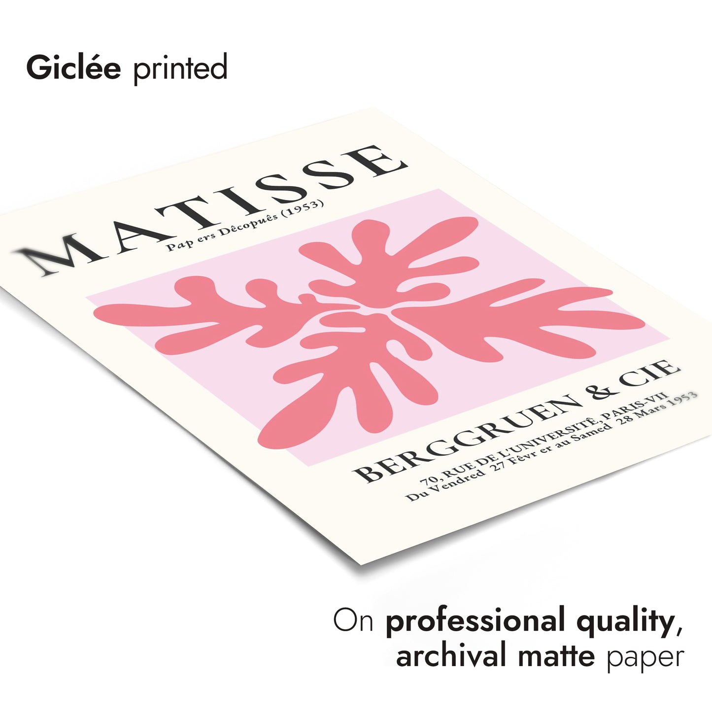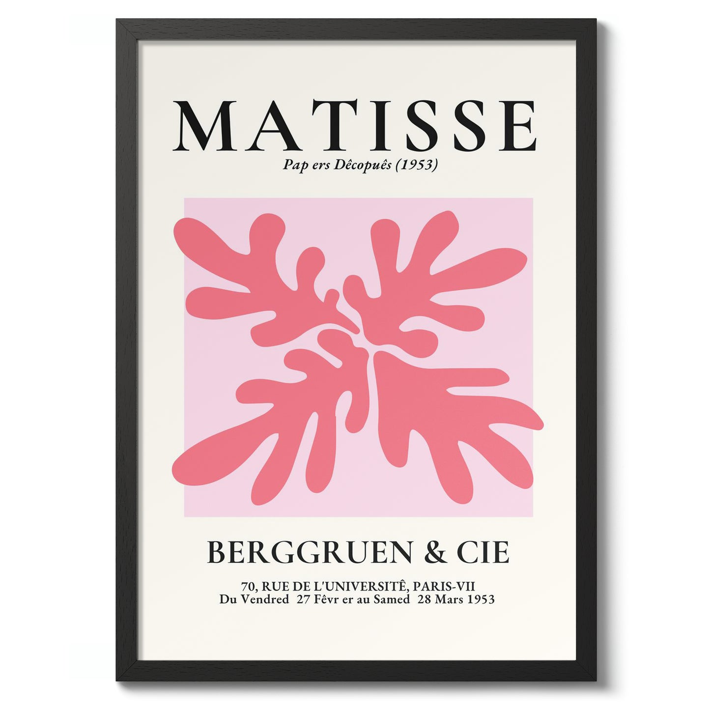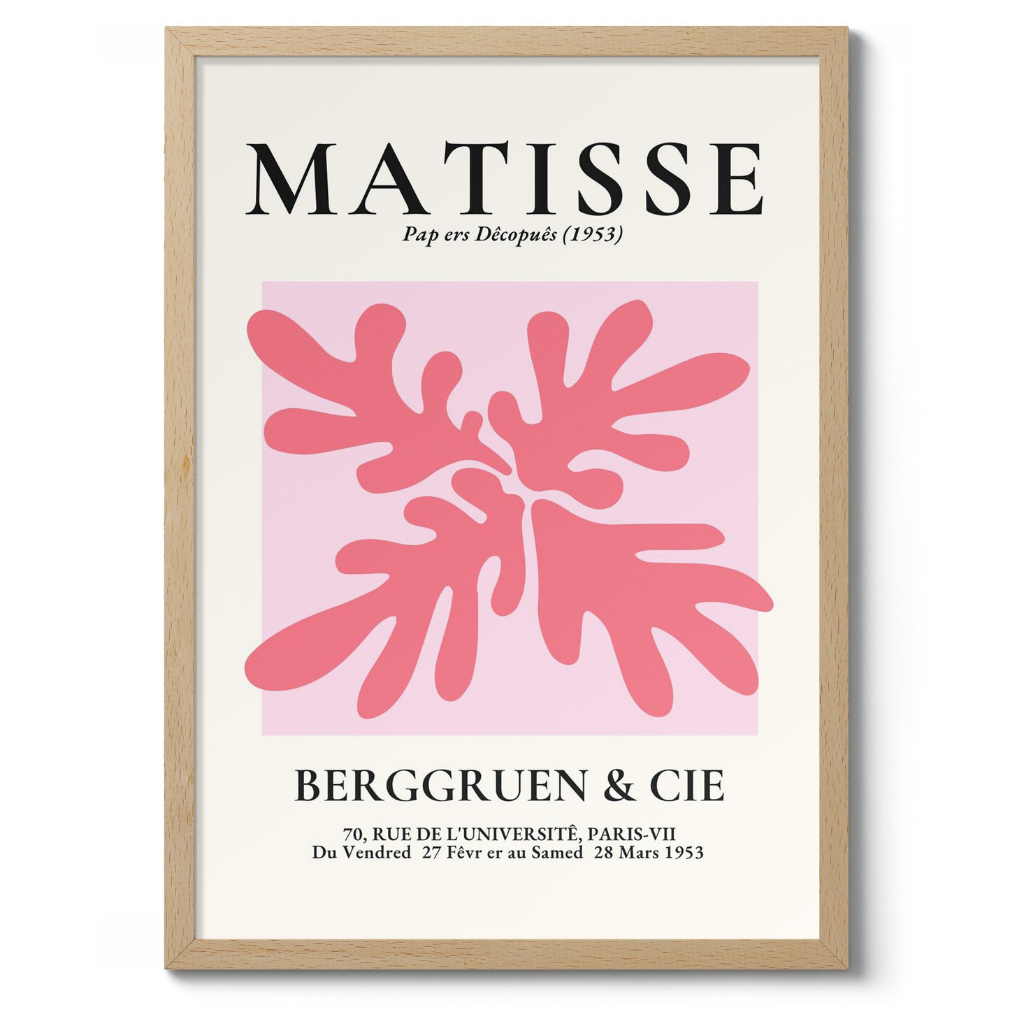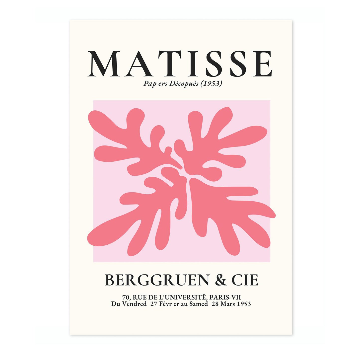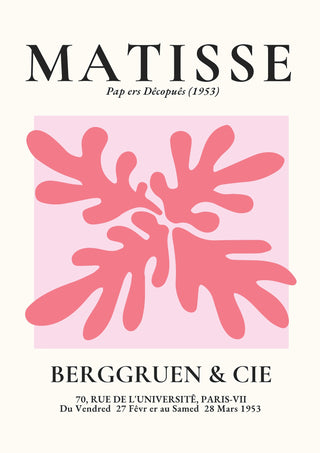 The "Matisse Pink Cut-Out" poster showcases an abstract arrangement of pink cut-out shapes against a white background, emblematic of Henri Matisse's renowned paper cutout style. The coral-like forms resemble a floral motif, capturing the essence of simplicity and creativity. Perfect for adding a touch of modern art to interiors, this poster pays homage to the vibrant creativity of Matisse.