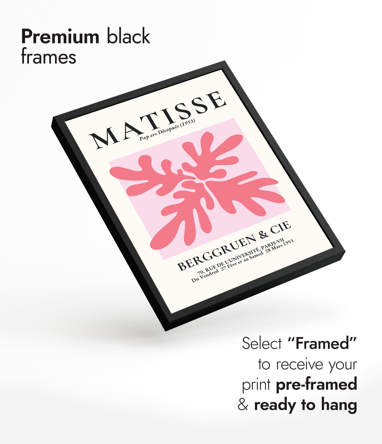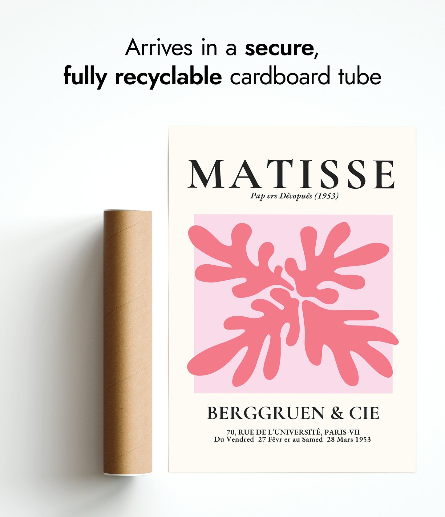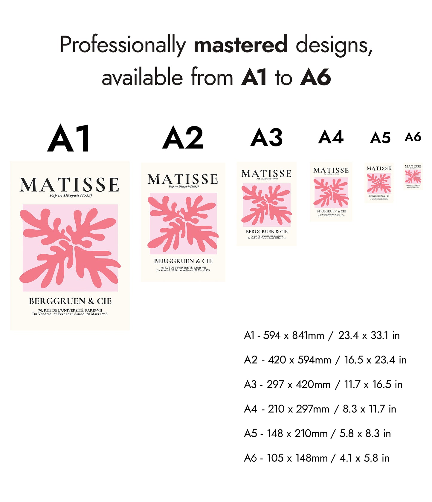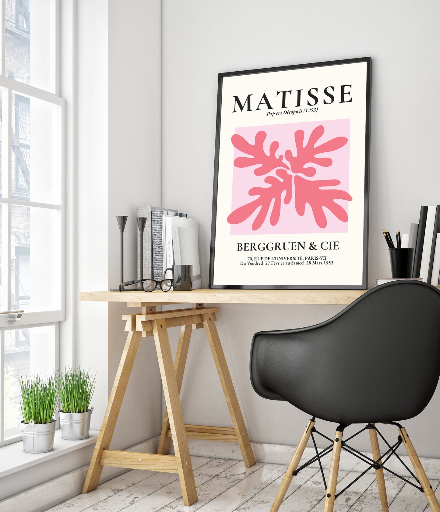 The "Matisse Pink Cut-Out" poster showcases an abstract arrangement of pink cut-out shapes against a white background, emblematic of Henri Matisse's renowned paper cutout style. The coral-like forms resemble a floral motif, capturing the essence of simplicity and creativity. Perfect for adding a touch of modern art to interiors, this poster pays homage to the vibrant creativity of Matisse.