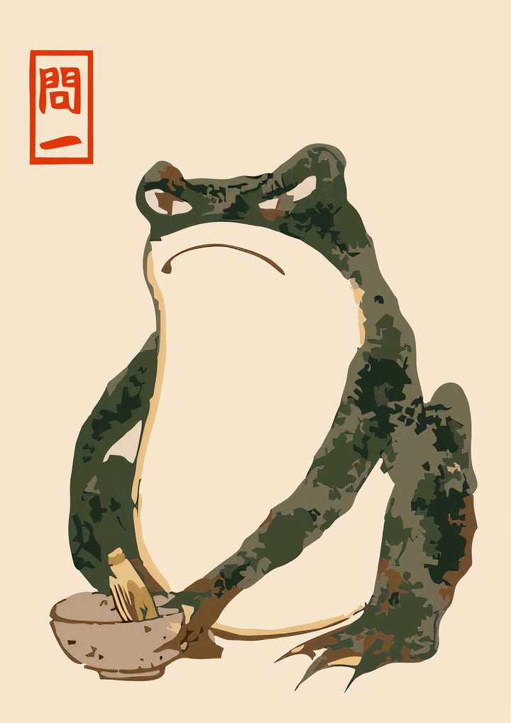 This poster features a captivating portrait of a frog, rendered in traditional Japanese Sumi-E line art by artist Matsumoto Hoji. Highlighting a blend of humor and minimalism, the frog holds a bowl, exuding a sense of serene contemplation. The delicate brushstrokes and muted natural tones capture the essence of nature and animal life in an elegant, timeless manner.