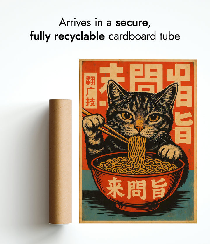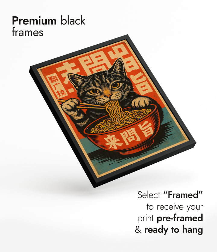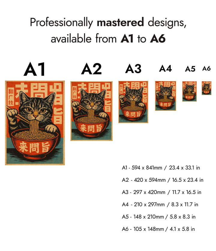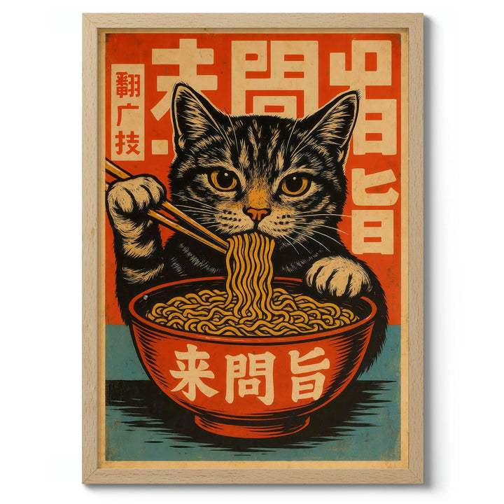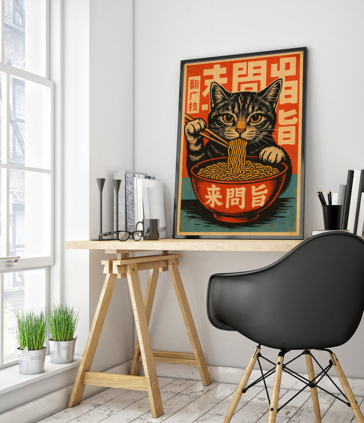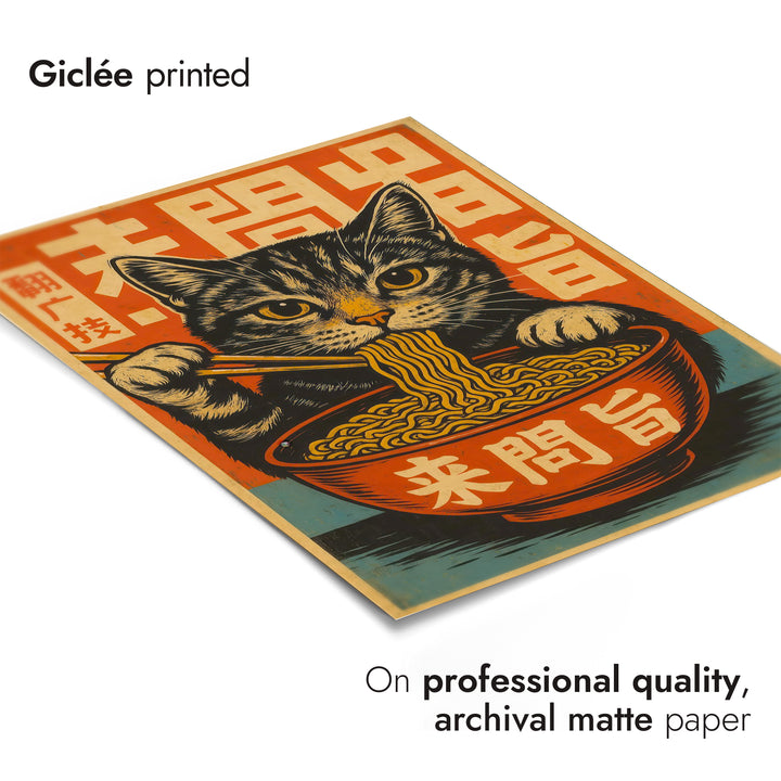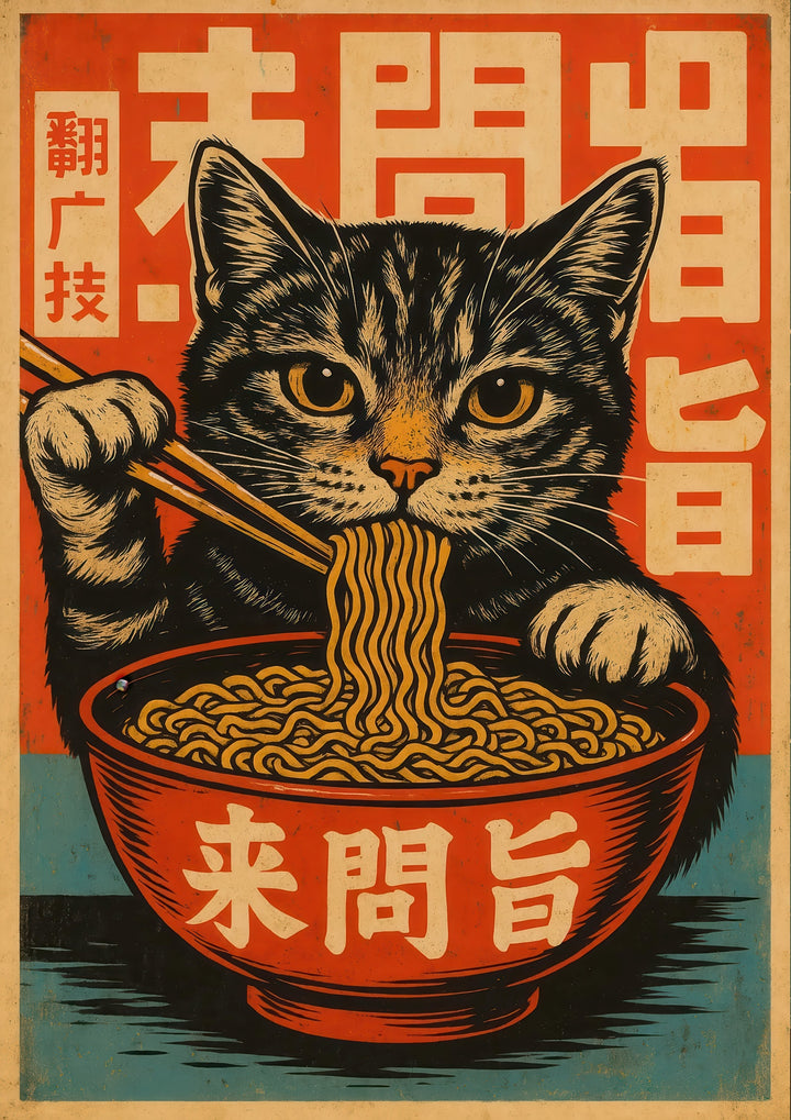 This vibrant anime poster features a playful cat savoring ramen noodles with chopsticks, set against a bold Japanese graphic background. The eye-catching design incorporates stylized Japanese characters, blending themes of food, culture, and feline charm. Perfect for Japanese art enthusiasts, this illustration captures the whimsical essence of a cat immersed in a culinary delight. Ideal for any anime or food-themed decor.
