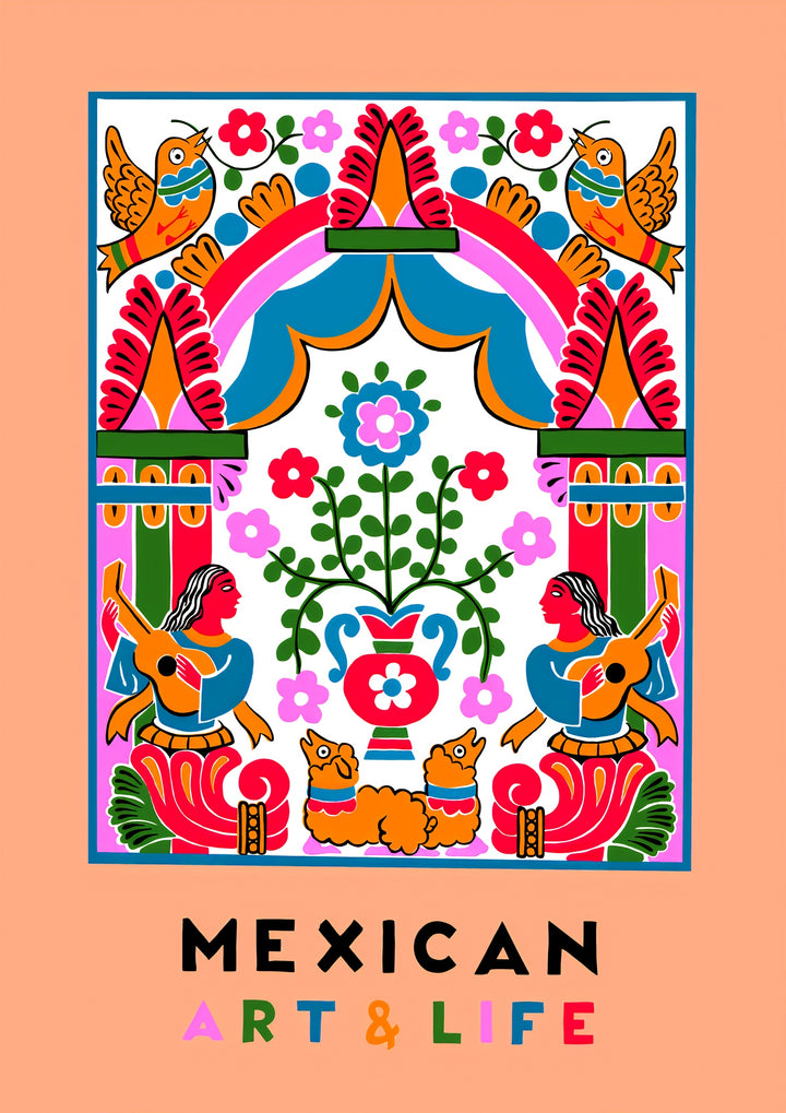 This vibrant Mexican Art & Life poster features intricate floral and bird designs alongside traditional Mexican motifs. The bold, colourful illustration captures the essence of Mexican culture, making it a lively addition to any space. Ideal for those seeking a vintage-style portrait showcasing Central American themes, particularly focusing on floral and textile design elements.