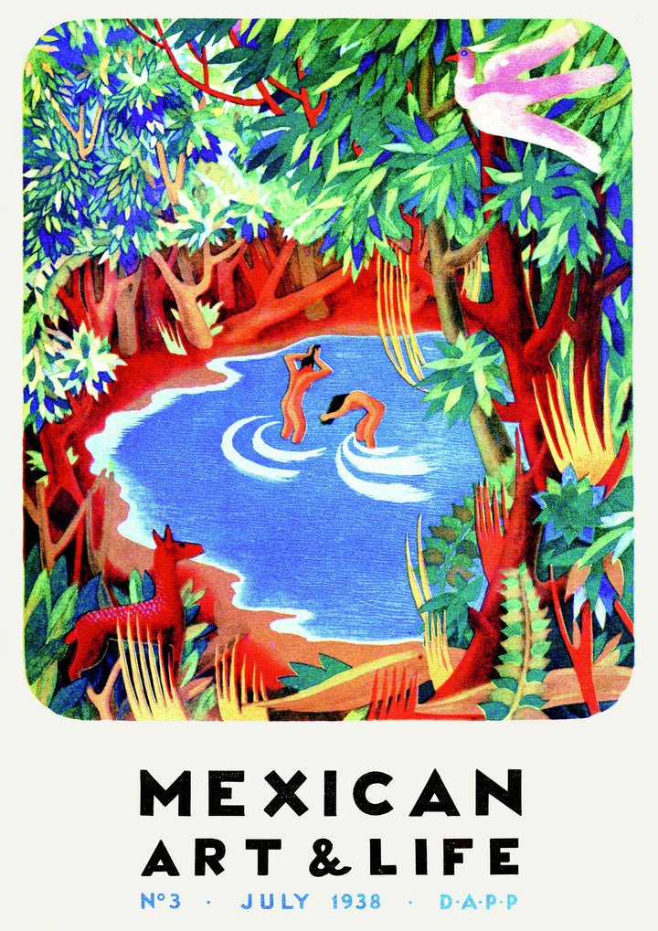This vintage poster titled "Mexican Art & Life" from July 1938 showcases a vibrant illustration of two swimmers in a serene lake surrounded by lush forest vegetation. Radiant colours and dynamic details capture the essence of Mexican nature, incorporating elements of a lively forest teeming with wildlife. A perfect addition for those appreciating vintage travel posters reflecting Central American landscapes.