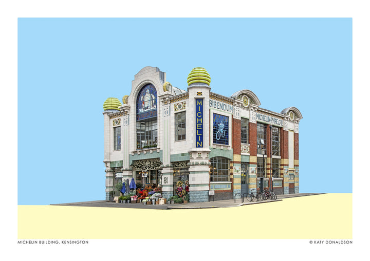 The "Michelin Building" poster by Katy Donaldson captures the iconic architecture of London's Michelin House in Kensington. This minimalist, graphic art print highlights intricate details and vibrant colours, focusing on the Art Deco style and architectural elegance of the landmark building. Perfect for enthusiasts of London architecture and urban scenes.