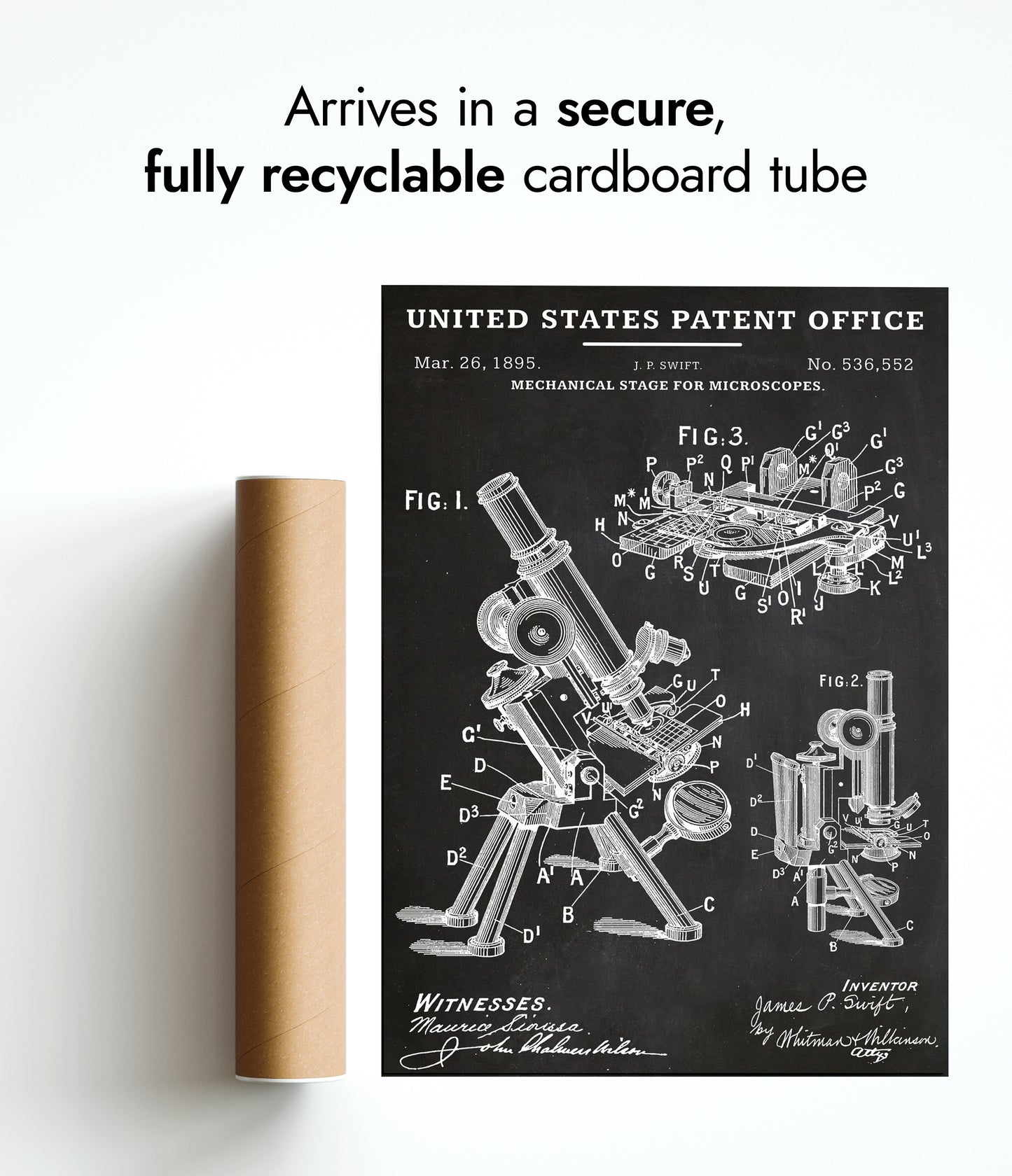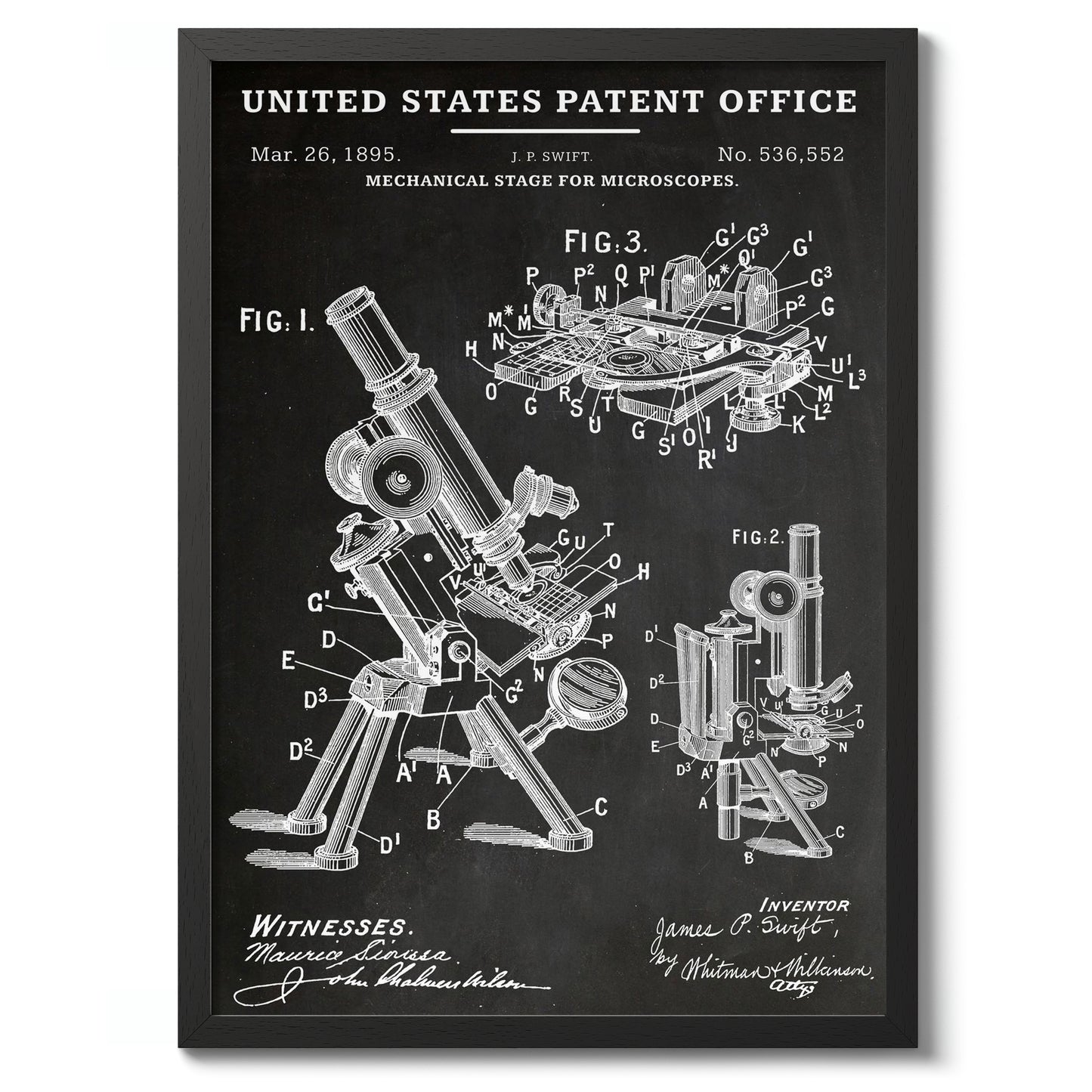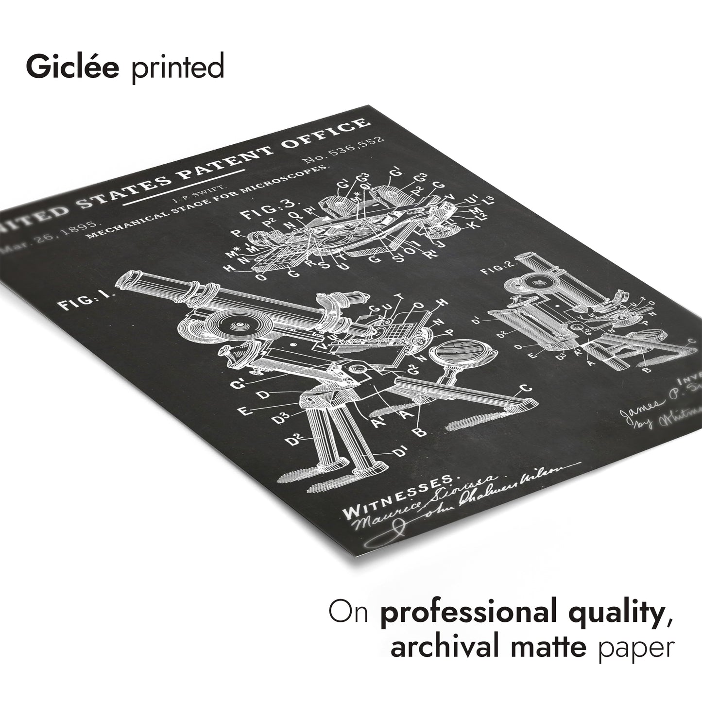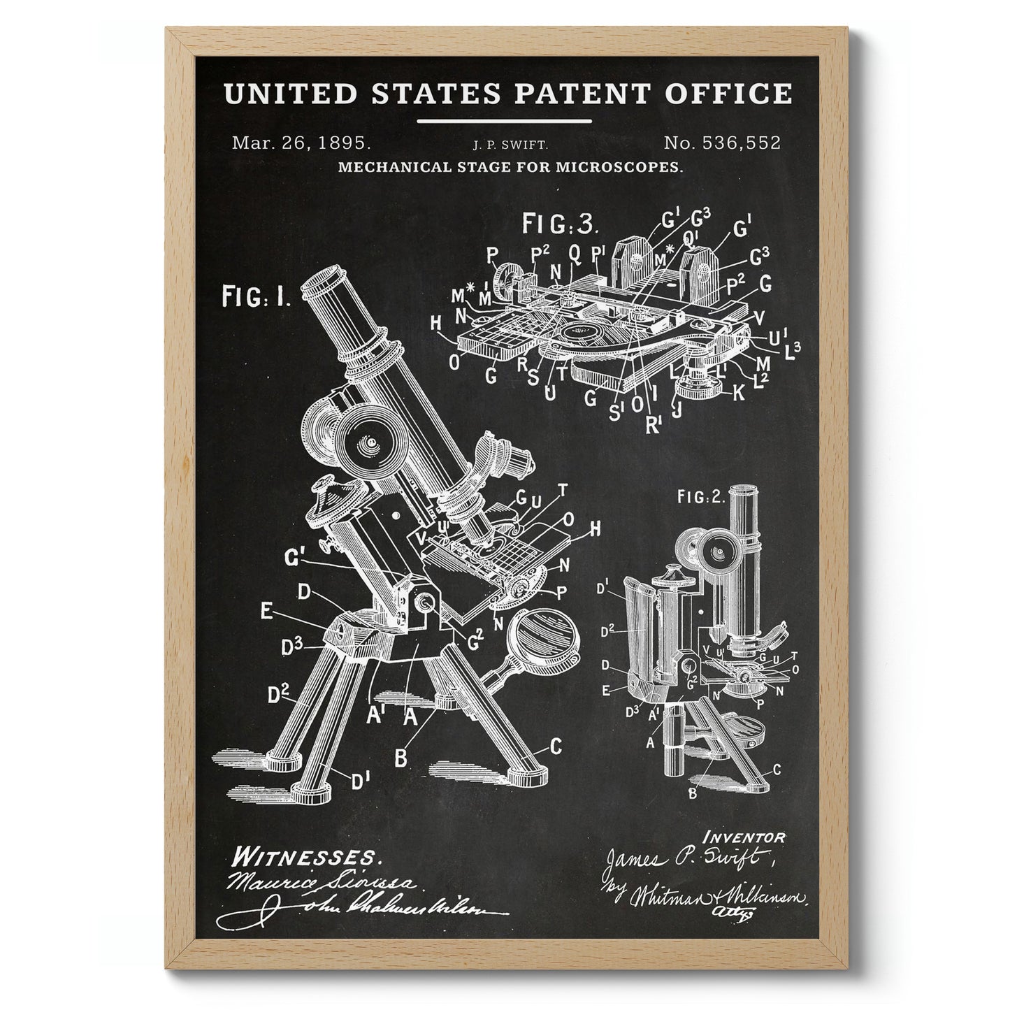 This black and white poster features a meticulously detailed schematic illustration of an 1895 microscope patent by J.P. Swift. Perfect for science enthusiasts, this vintage artwork showcases the mechanical stage for microscopes in a classic line art style. Intricate diagrams and annotations highlight the technical prowess of the era. Ideal for adding a scholarly touch to any space.