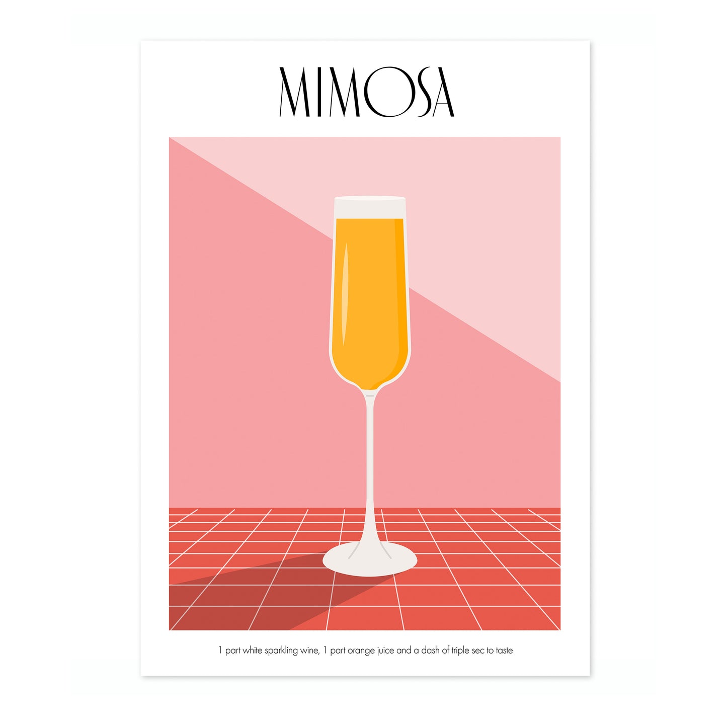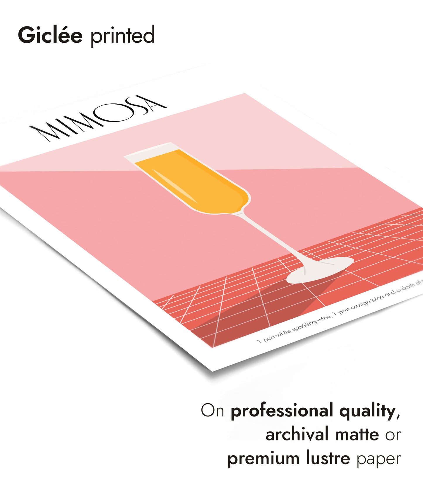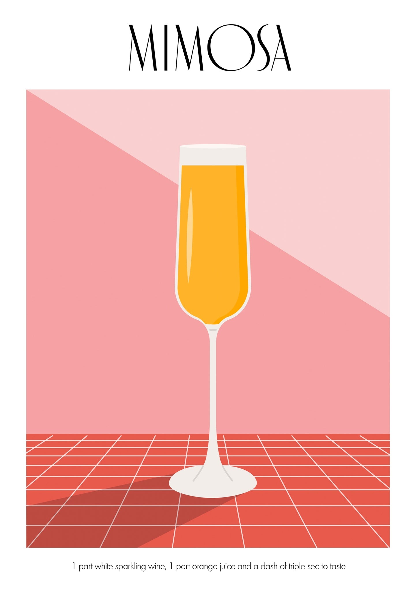This "Mimosa" poster features a chic, graphic illustration of a classic mimosa cocktail set against a stylish, geometric background. With a palette of soft pinks and warm yellows, this modern, mid-century design adds a touch of elegance and vibrancy to any space, making it ideal for kitchens and dining areas. A perfect addition for cocktail enthusiasts and lovers of retro pop art.