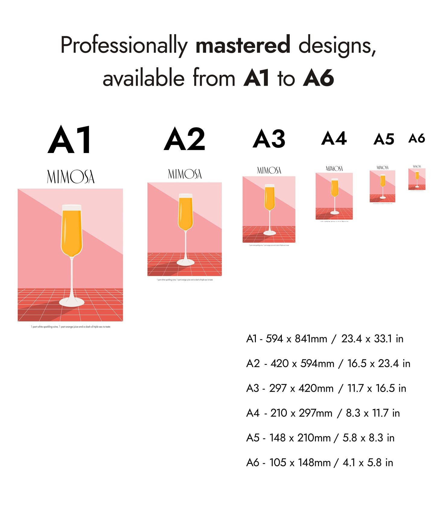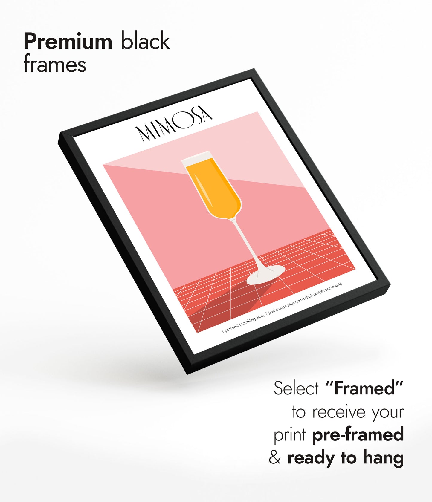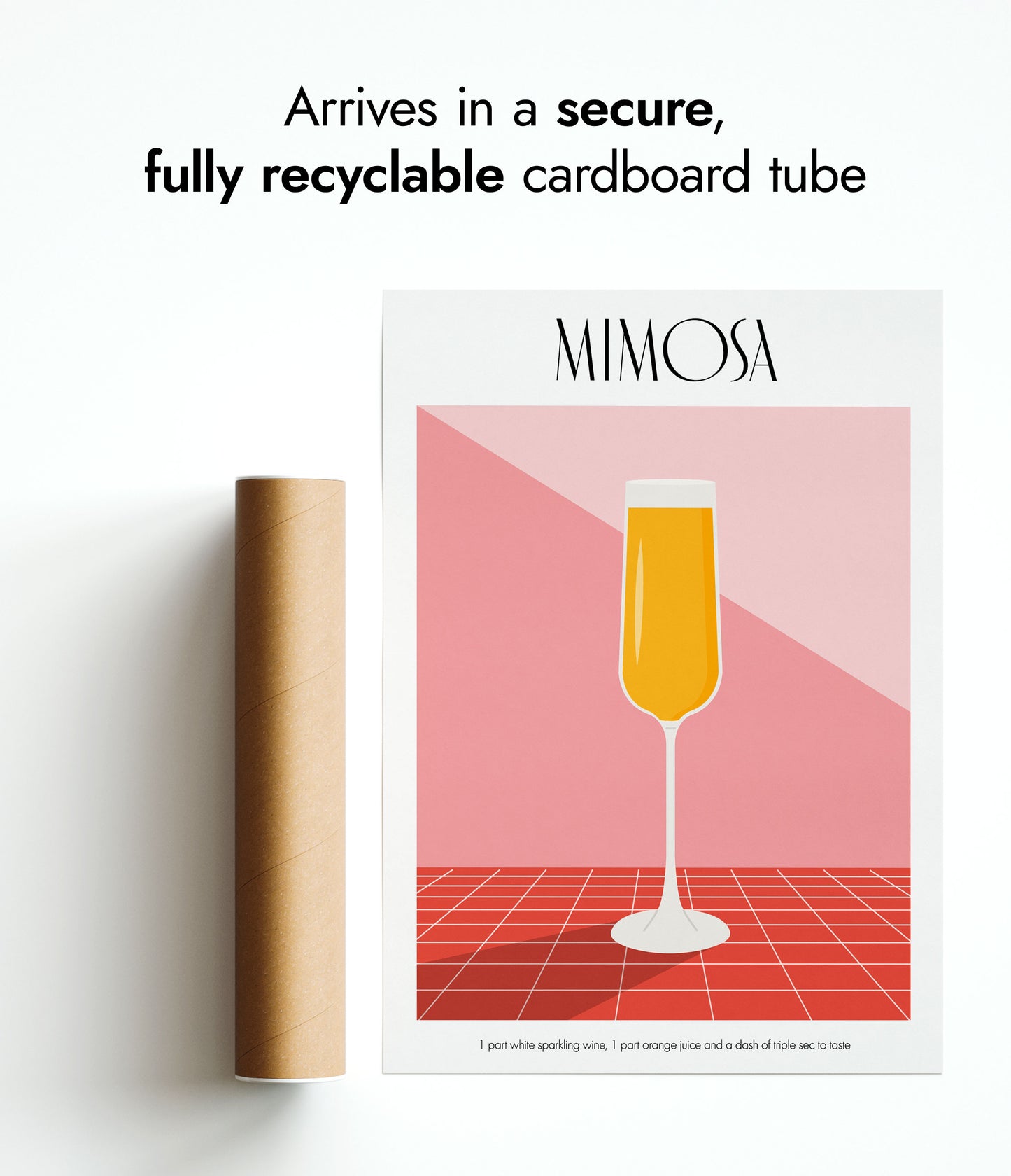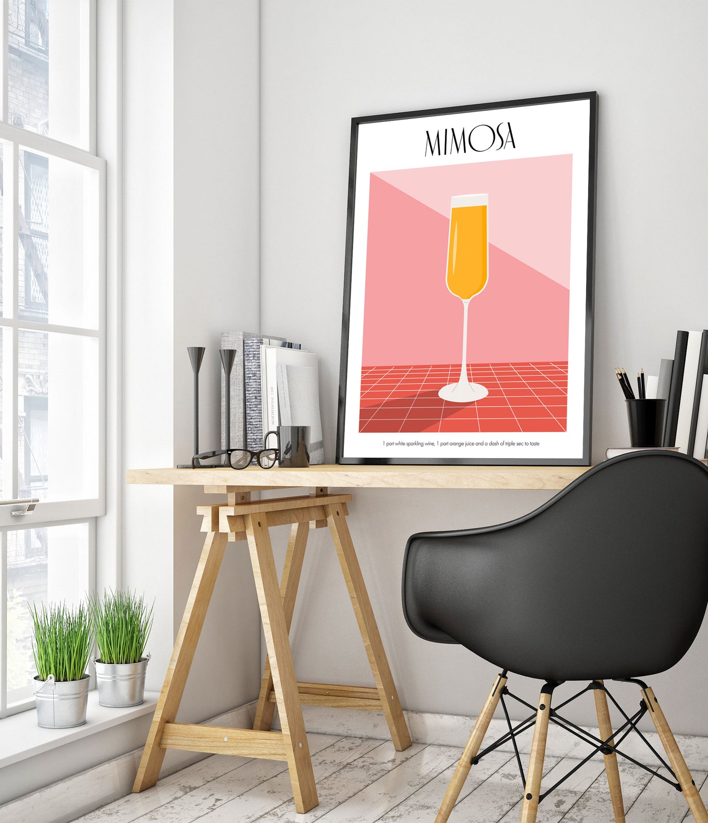 This "Mimosa" poster features a chic, graphic illustration of a classic mimosa cocktail set against a stylish, geometric background. With a palette of soft pinks and warm yellows, this modern, mid-century design adds a touch of elegance and vibrancy to any space, making it ideal for kitchens and dining areas. A perfect addition for cocktail enthusiasts and lovers of retro pop art.