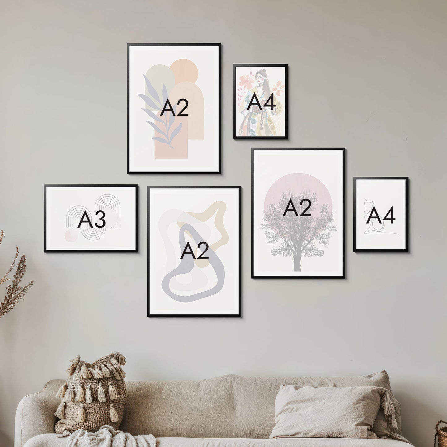 Boho collection gallery wall art features abstract shapes, nature motifs, and a minimalistic cat line drawing. This set of posters and prints combines earthy tones with a modern design, perfect for enhancing any living space. Ideal for contemporary interiors, each piece is crafted to complement diverse decor styles. High-quality prints ensure durability and visual appeal for lasting enjoyment.