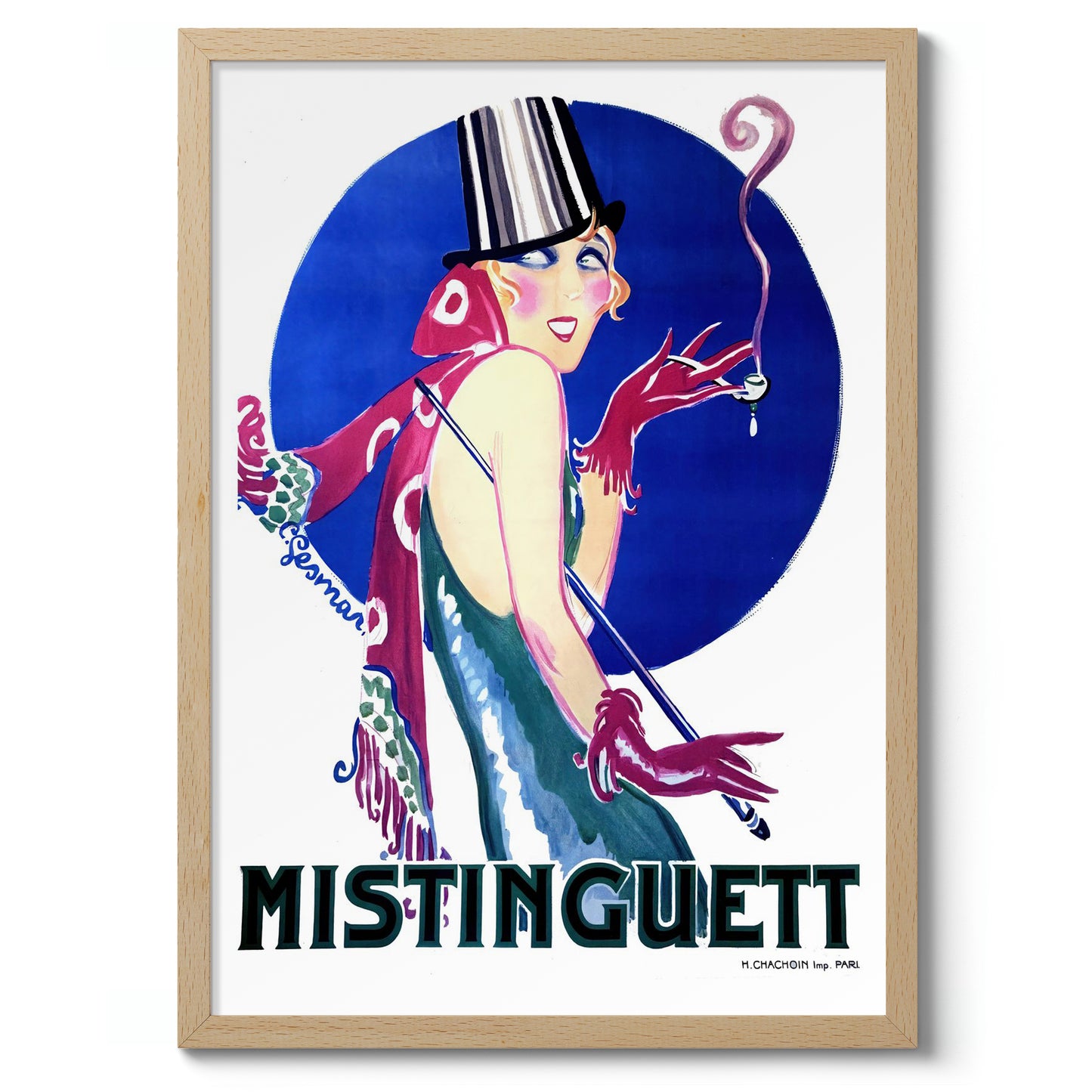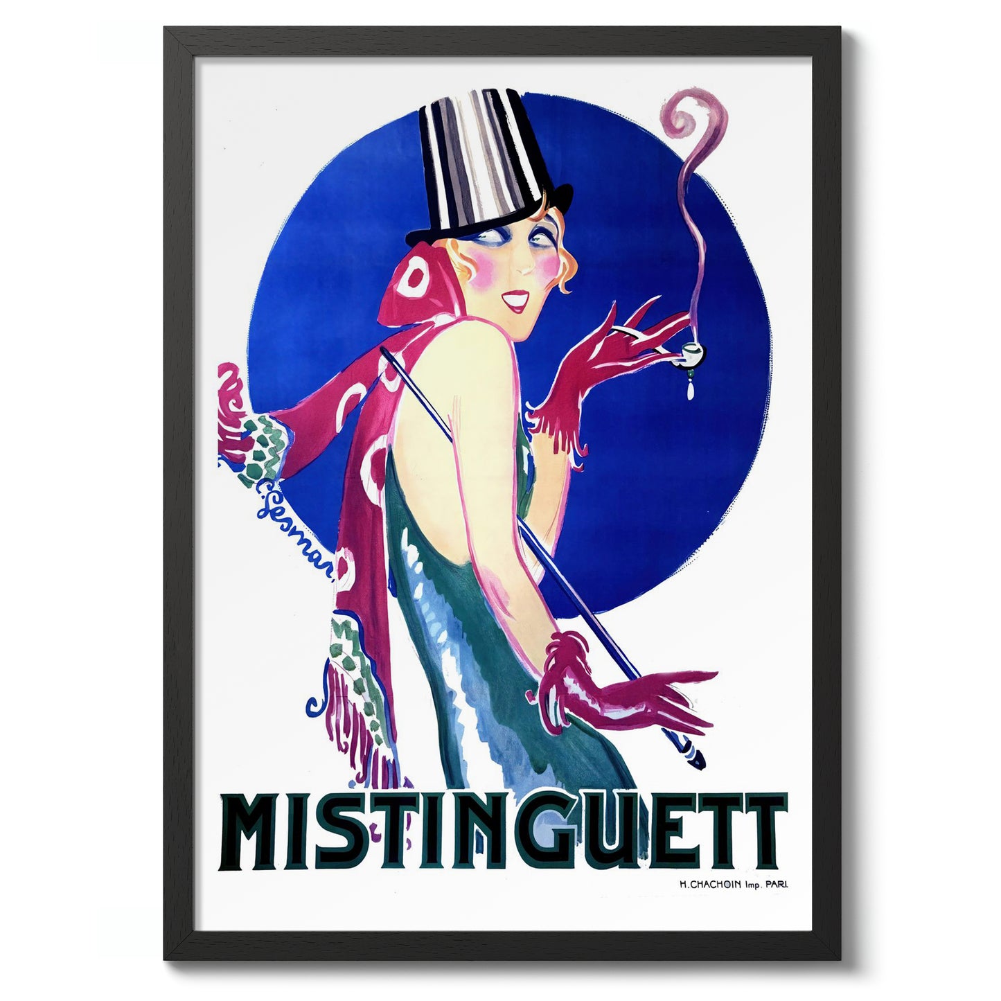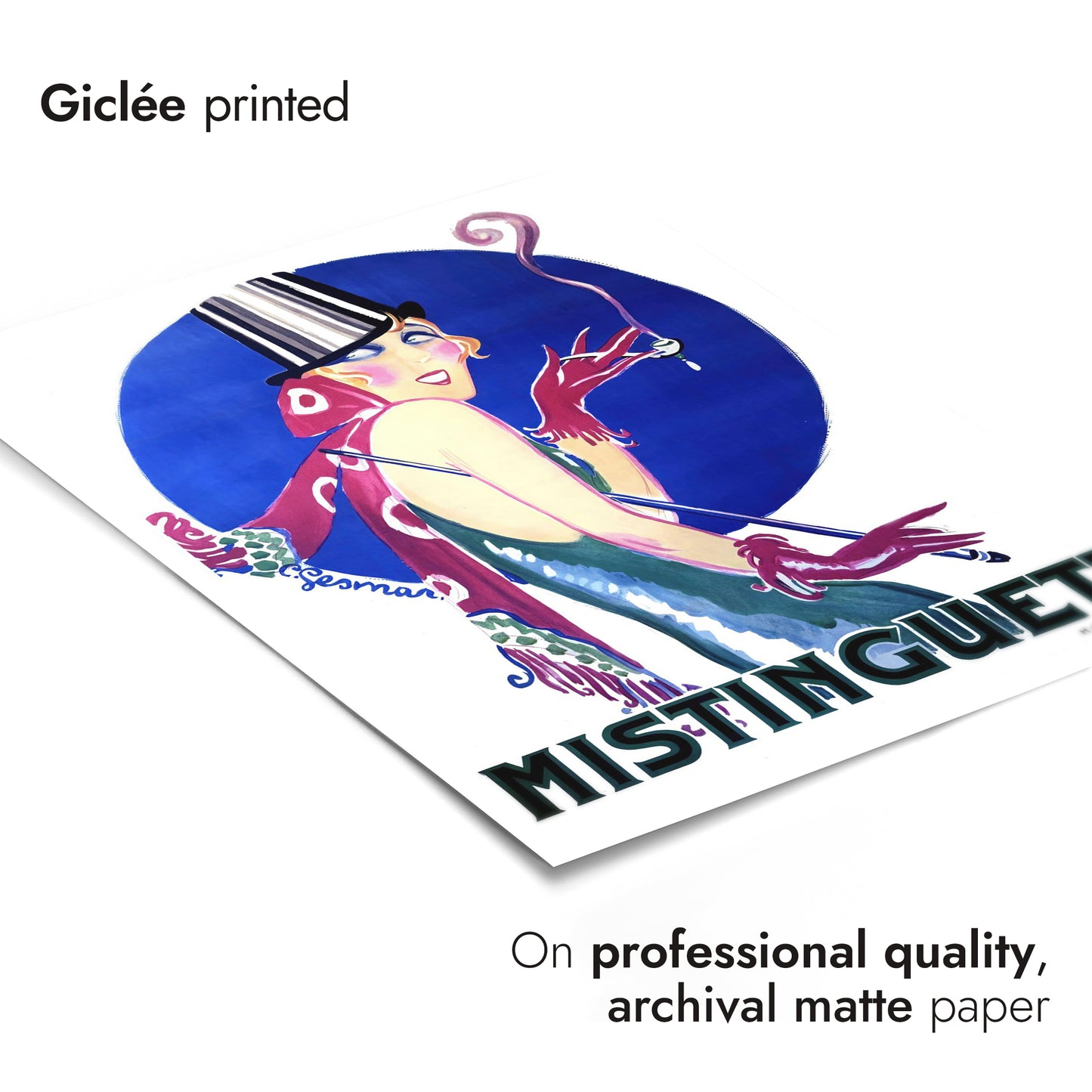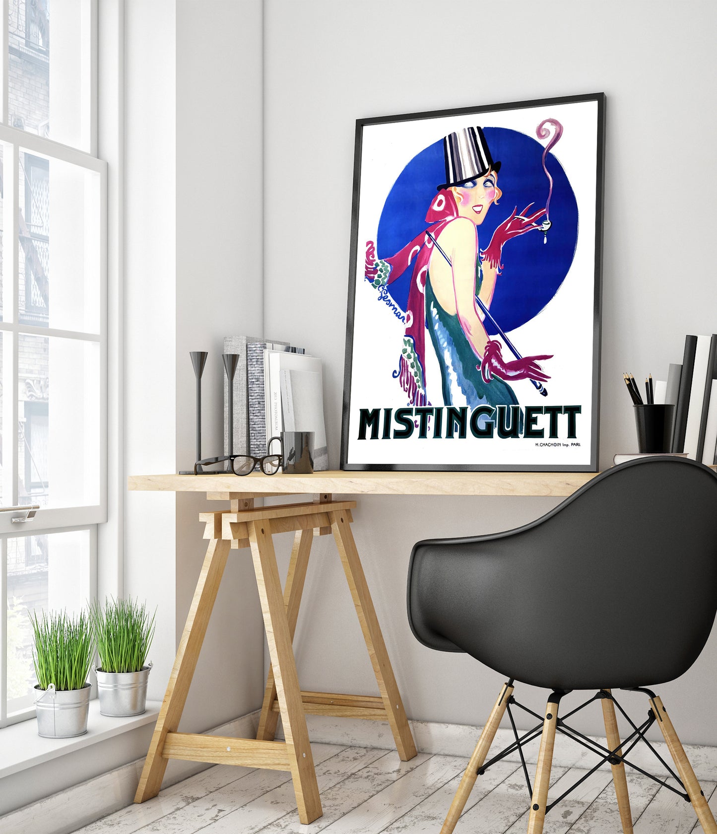 Capture the allure of vintage French cabaret with the "Mistinguett" poster. This vibrant illustration features a glamorous performer in a sequined dress, exuding charm with a striped top hat and long gloves. Dominated by white and blue hues, this eye-catching artwork is a perfect nod to Parisian nightlife, embodying the essence of dance and drama. Ideal for vintage art enthusiasts.