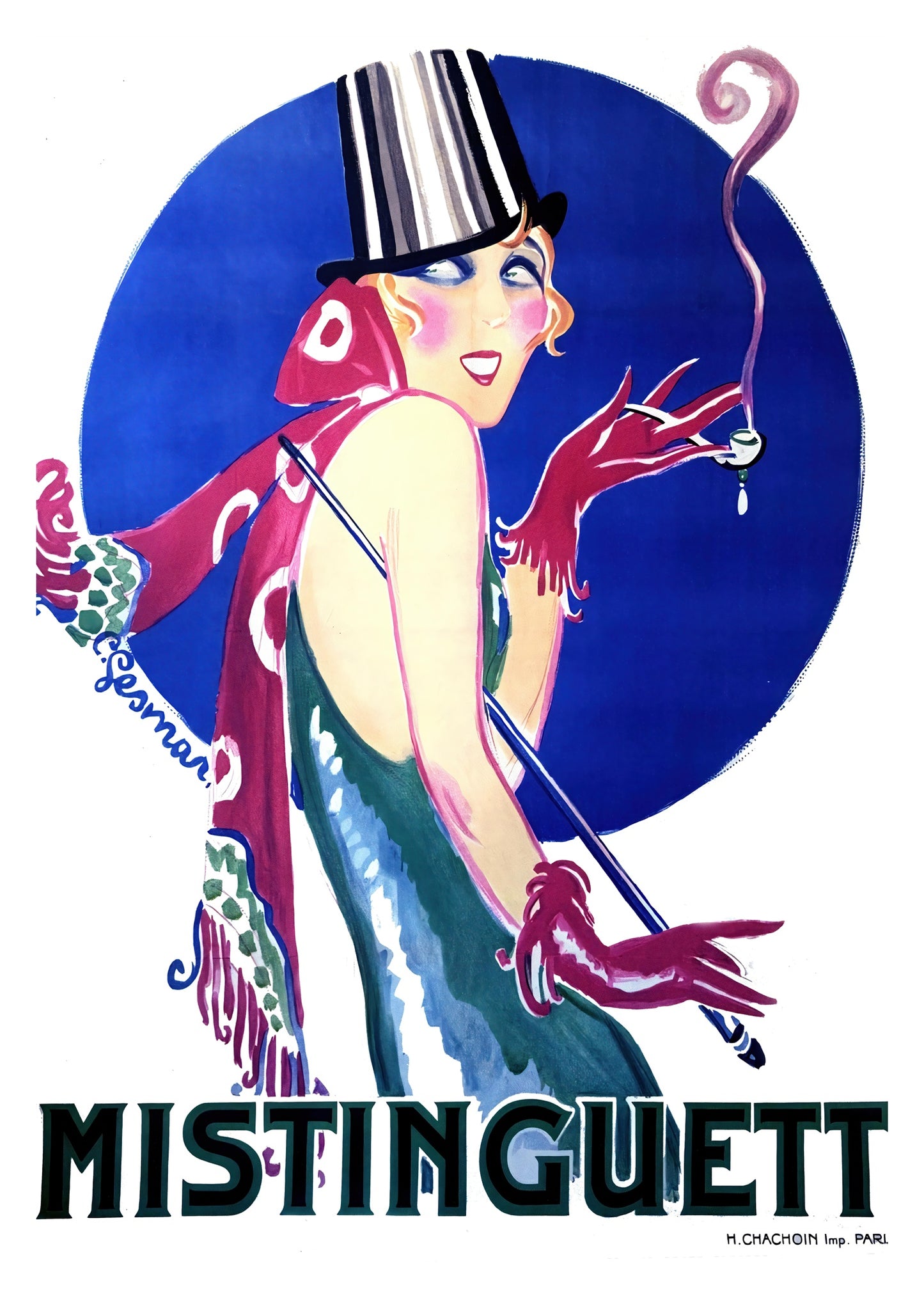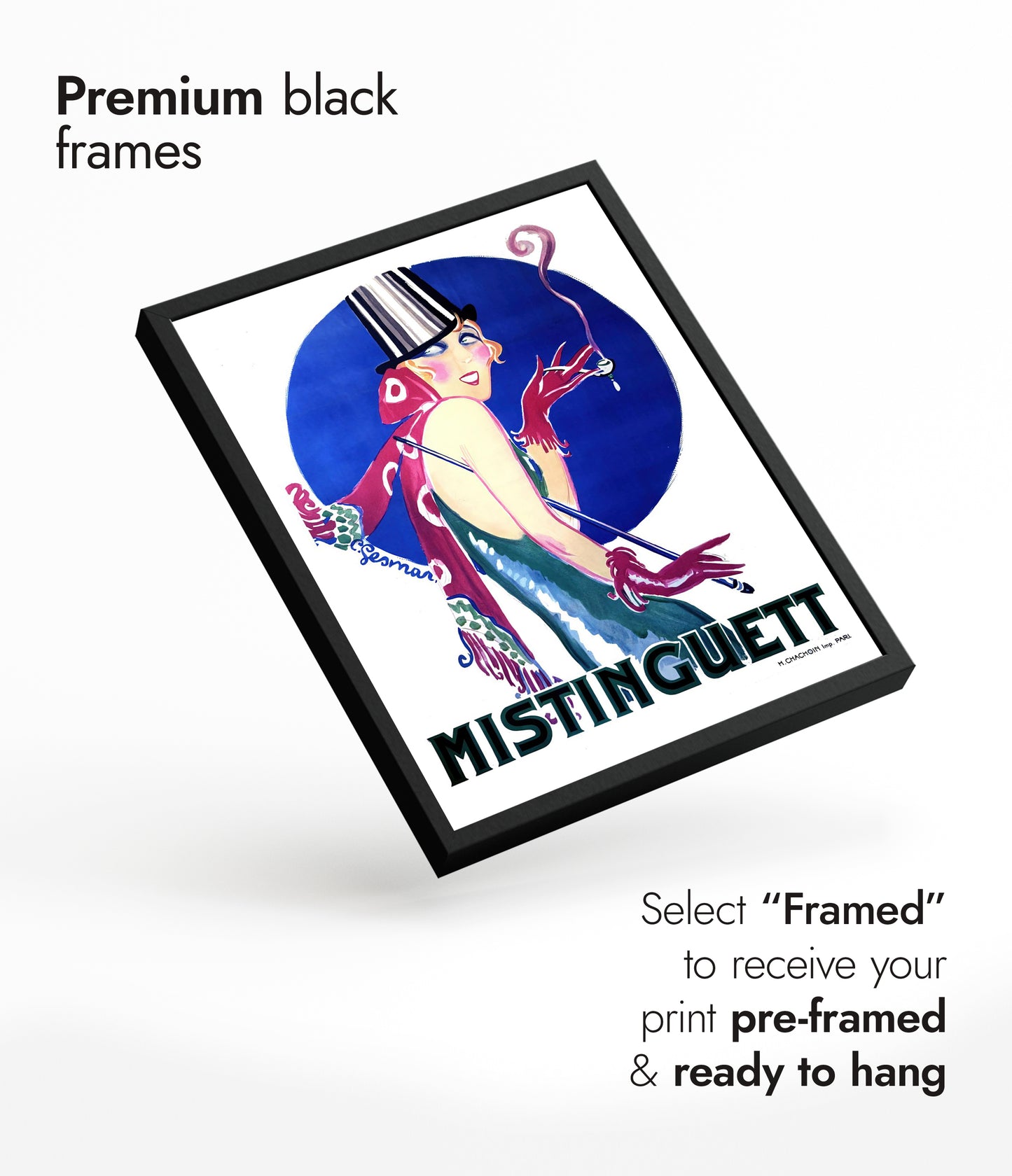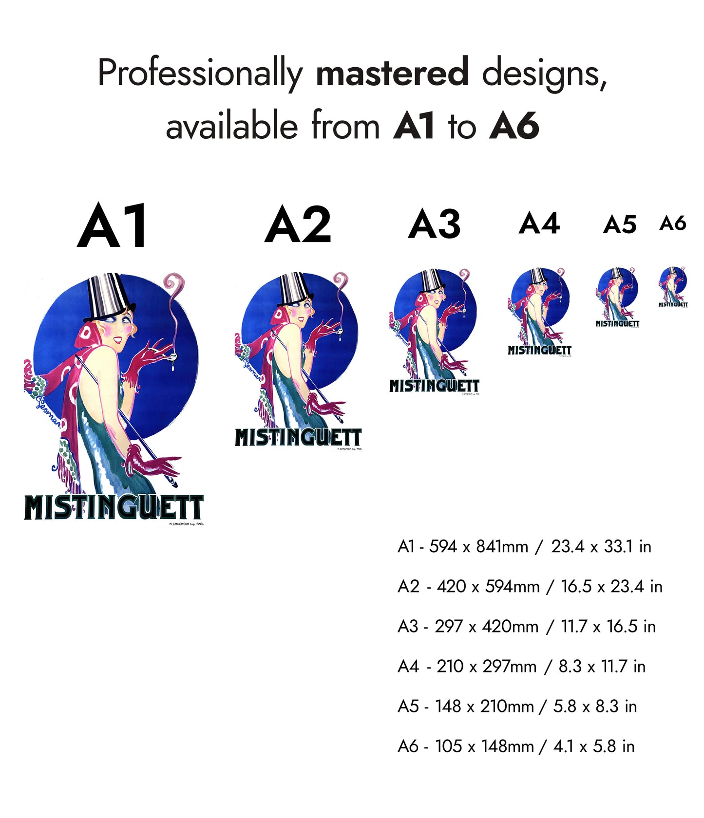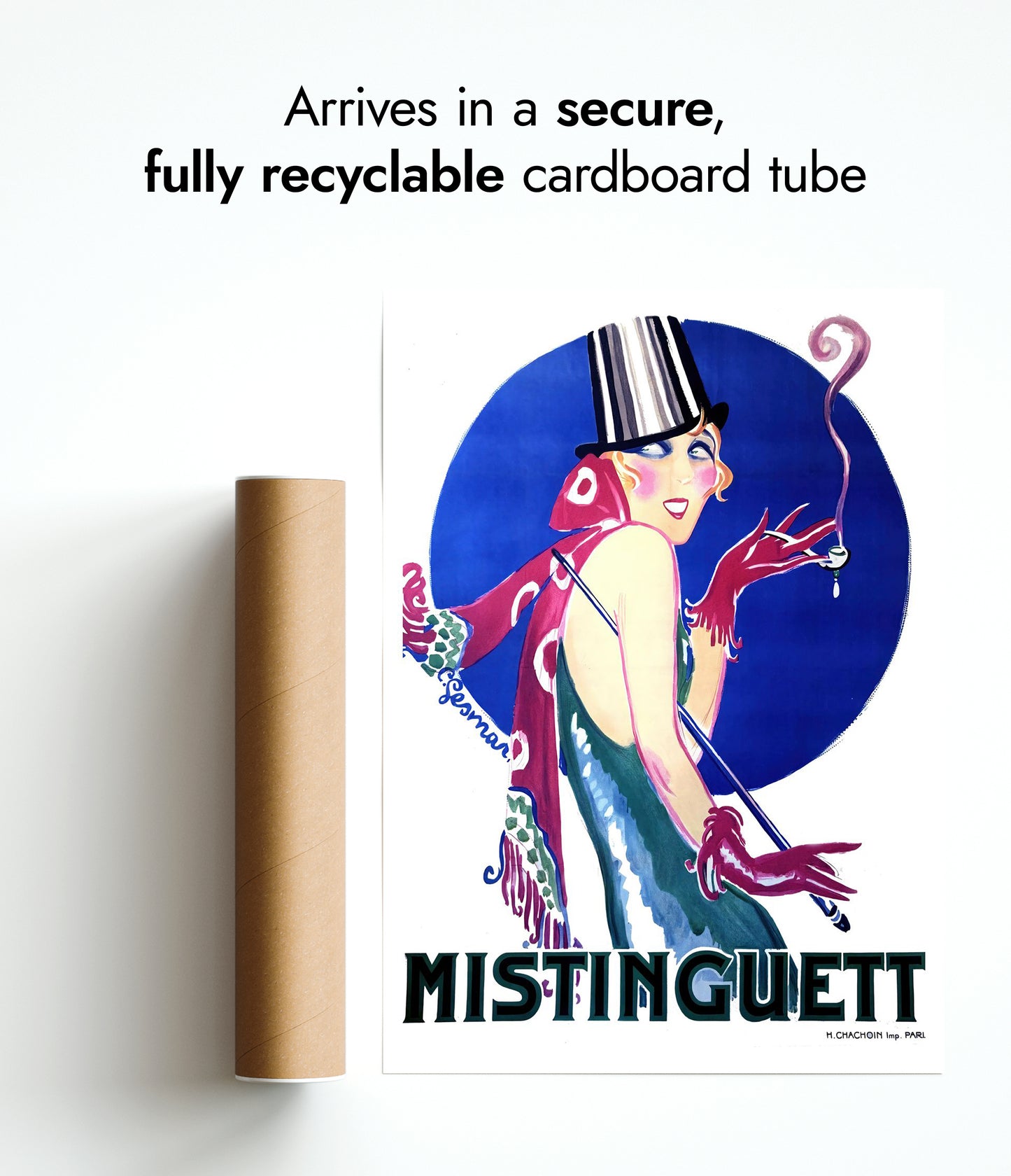 Capture the allure of vintage French cabaret with the "Mistinguett" poster. This vibrant illustration features a glamorous performer in a sequined dress, exuding charm with a striped top hat and long gloves. Dominated by white and blue hues, this eye-catching artwork is a perfect nod to Parisian nightlife, embodying the essence of dance and drama. Ideal for vintage art enthusiasts.