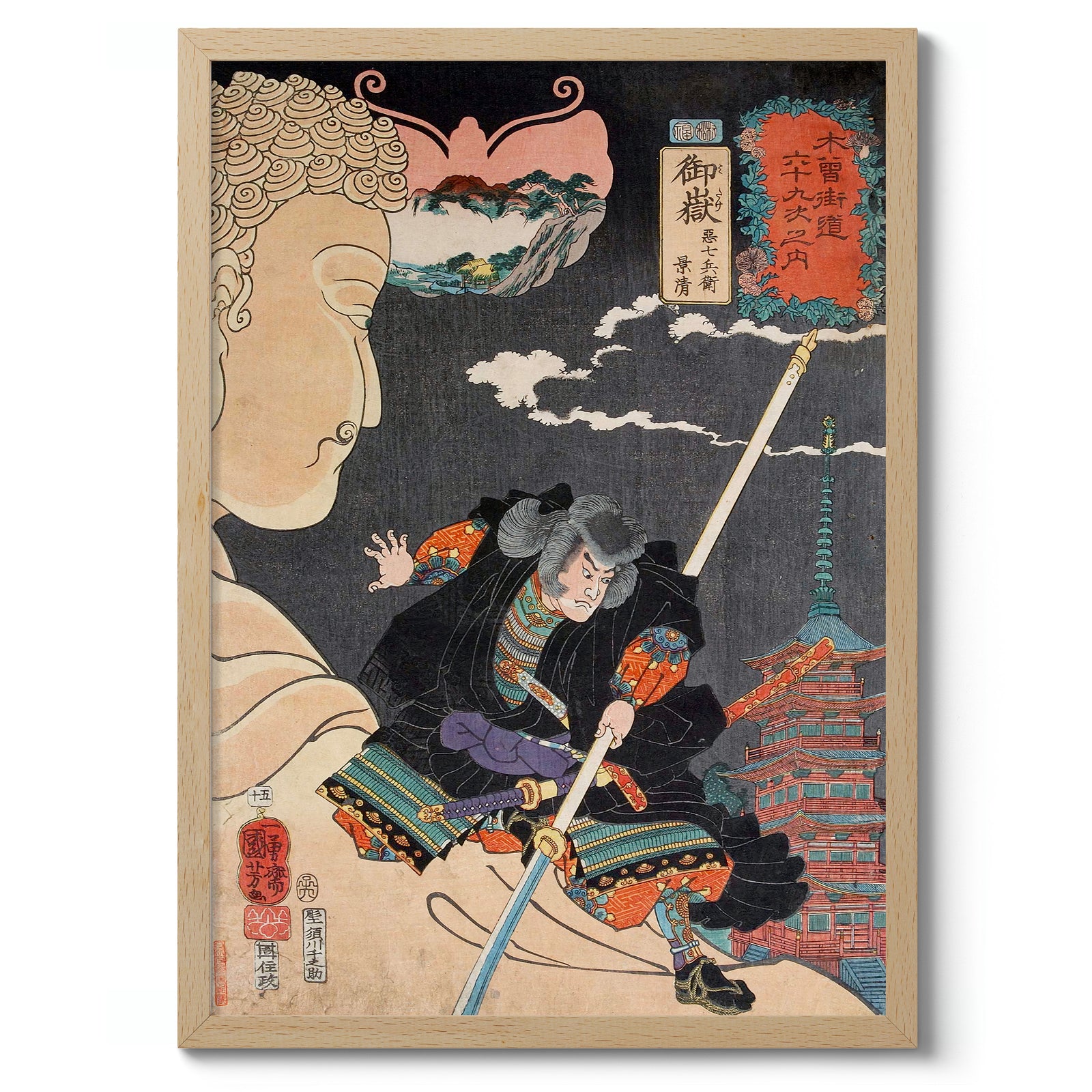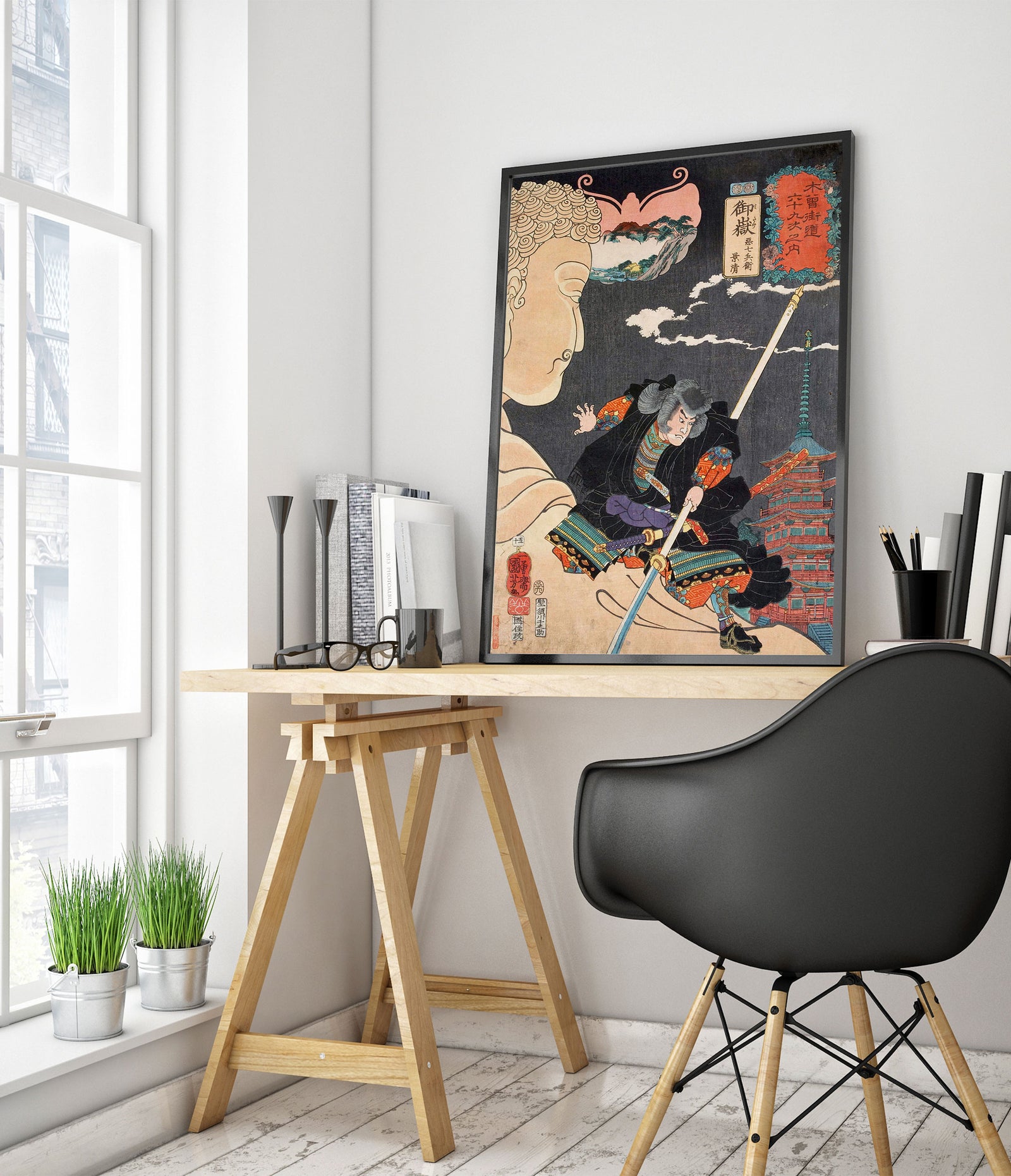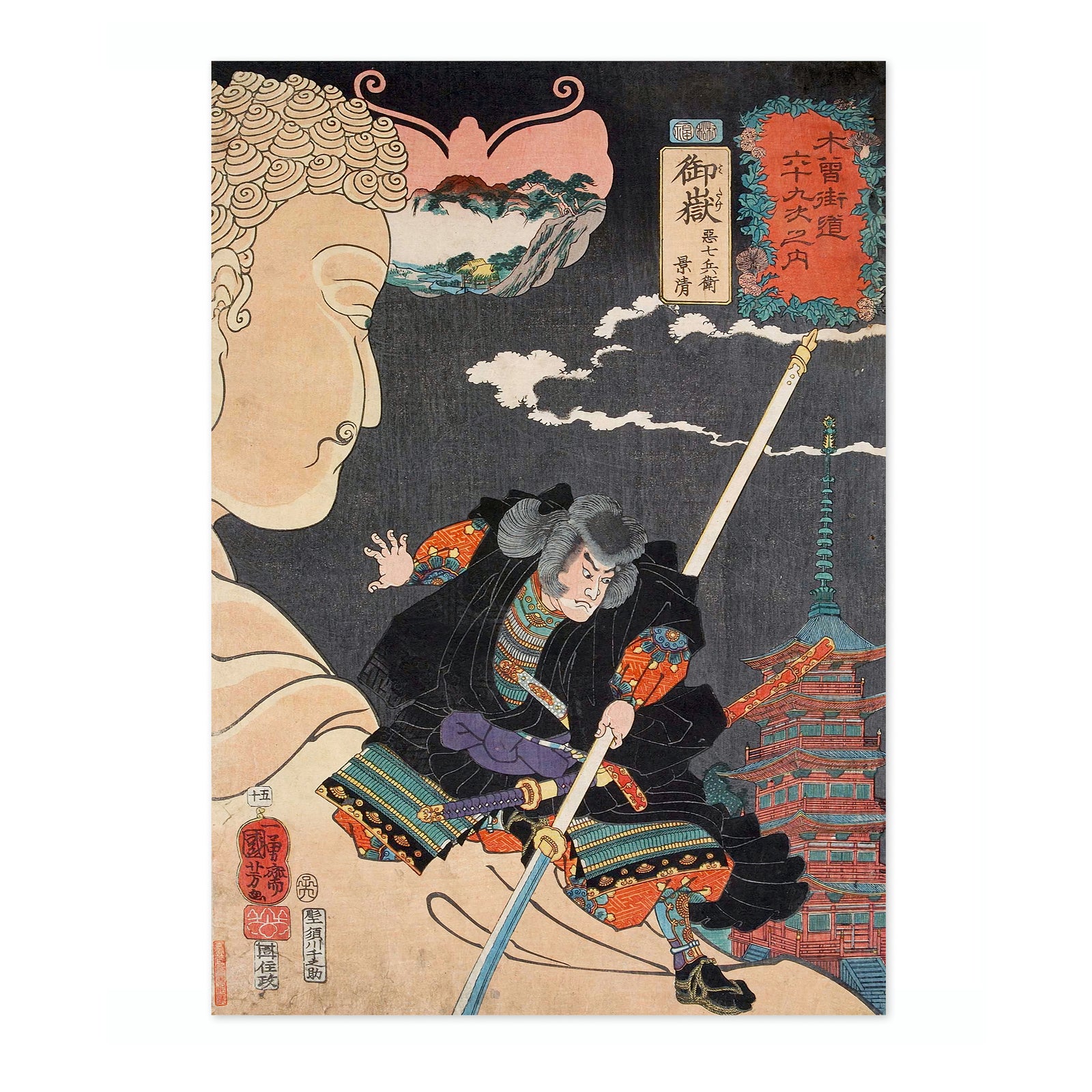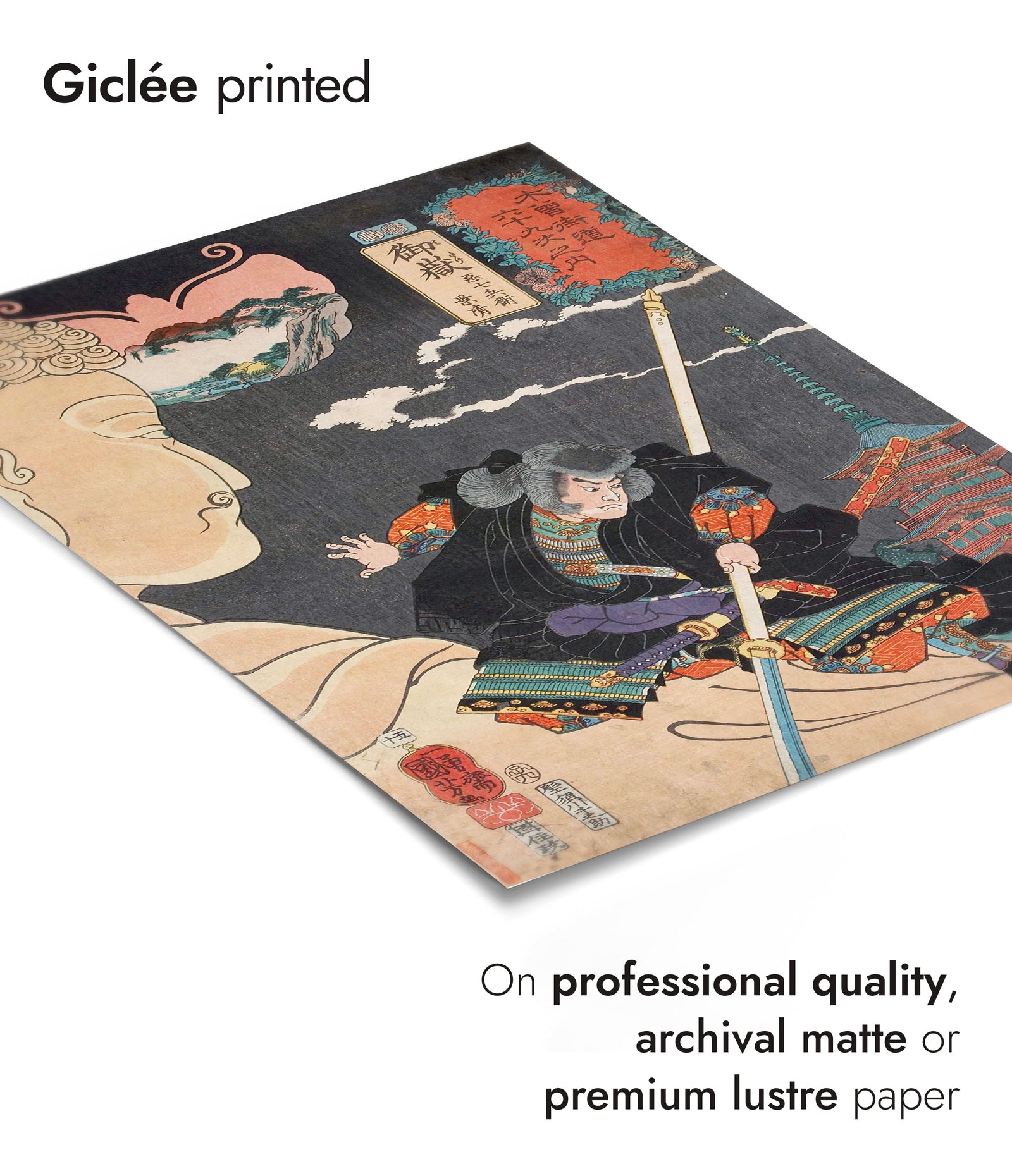 This "Mitake" poster by Utagawa Kuniyoshi, from the Japanese Traditional Woodblock collection, captures a dramatic scene of a samurai warrior atop an enormous Buddha statue's shoulder. The intricately detailed ukiyo-e style highlights the warrior's determination and the mythical aura of the setting. Perfect for enthusiasts of traditional Japanese art and samurai legends.
