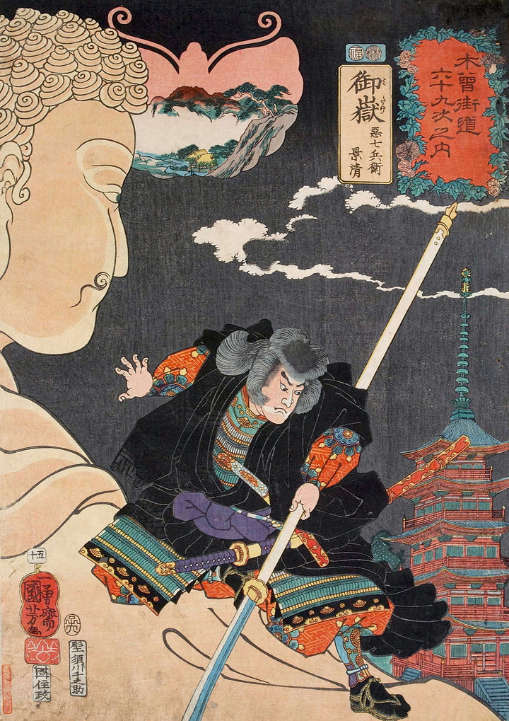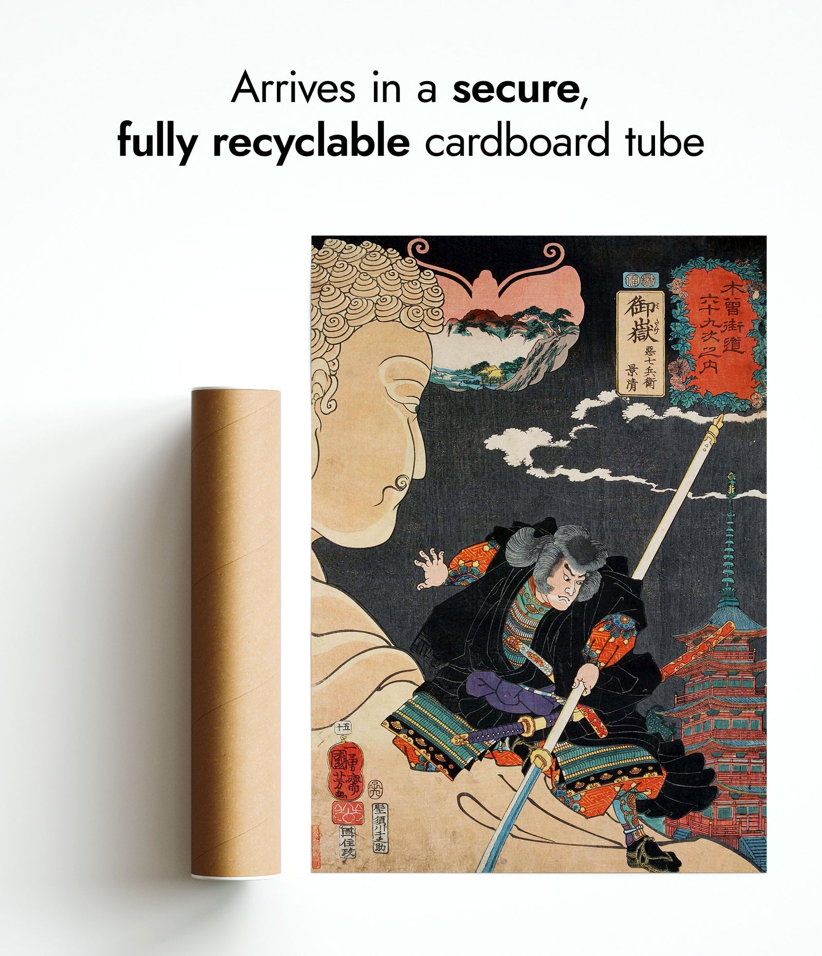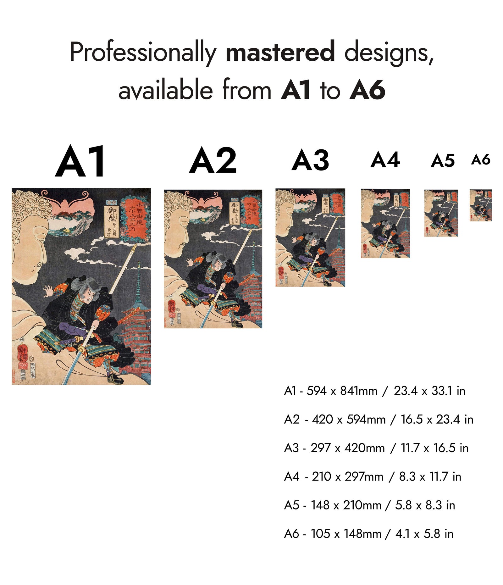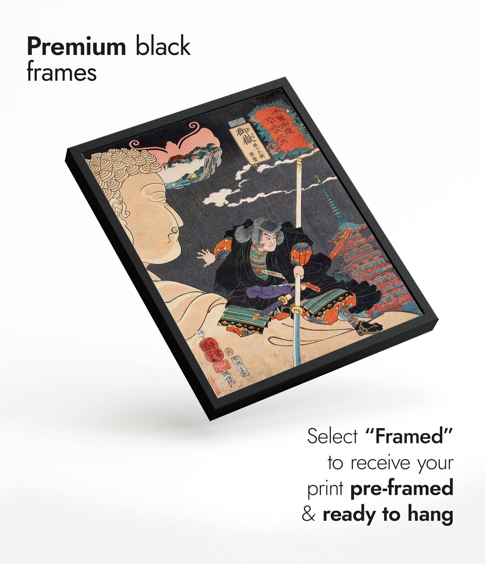 This "Mitake" poster by Utagawa Kuniyoshi, from the Japanese Traditional Woodblock collection, captures a dramatic scene of a samurai warrior atop an enormous Buddha statue's shoulder. The intricately detailed ukiyo-e style highlights the warrior's determination and the mythical aura of the setting. Perfect for enthusiasts of traditional Japanese art and samurai legends.