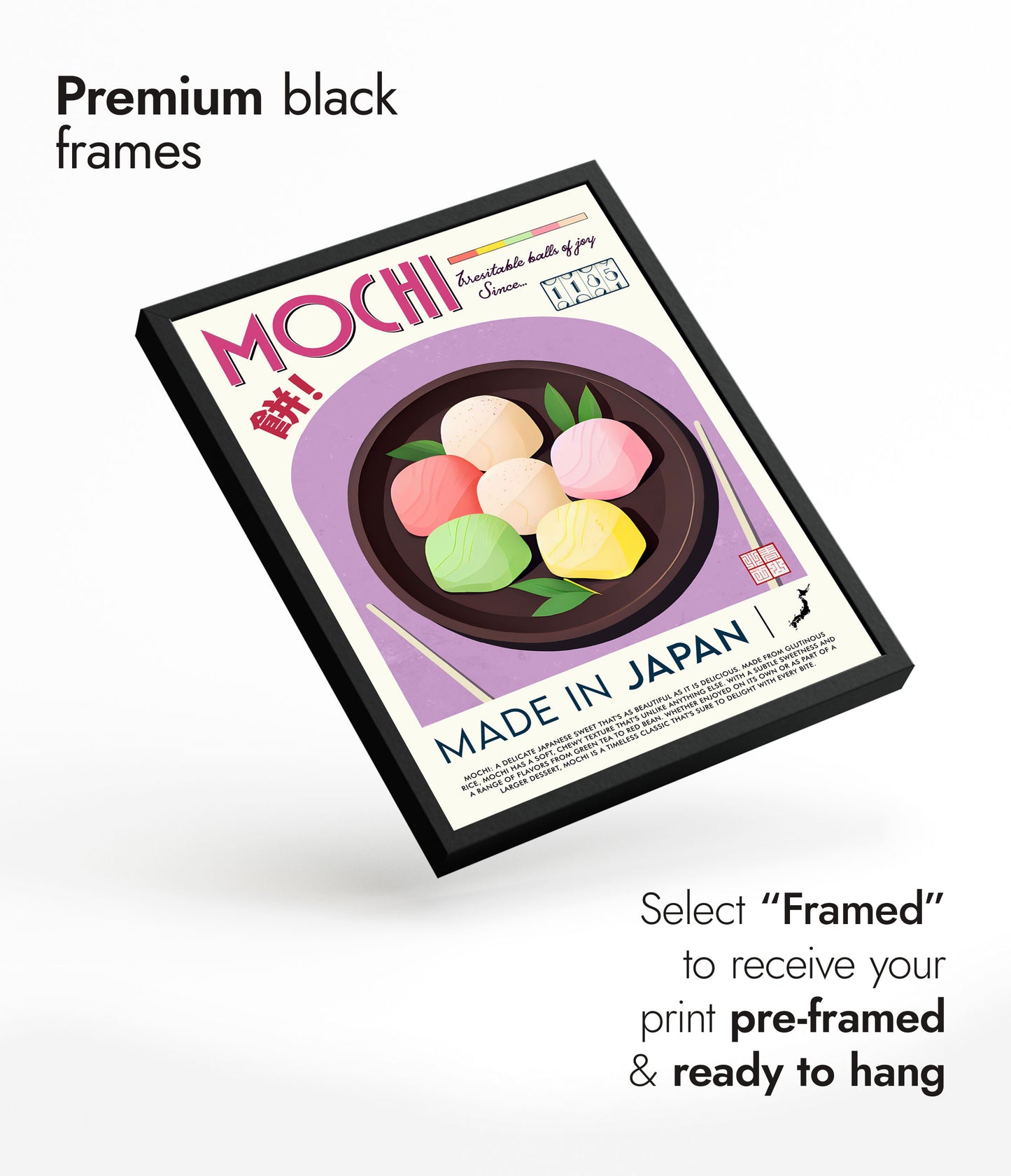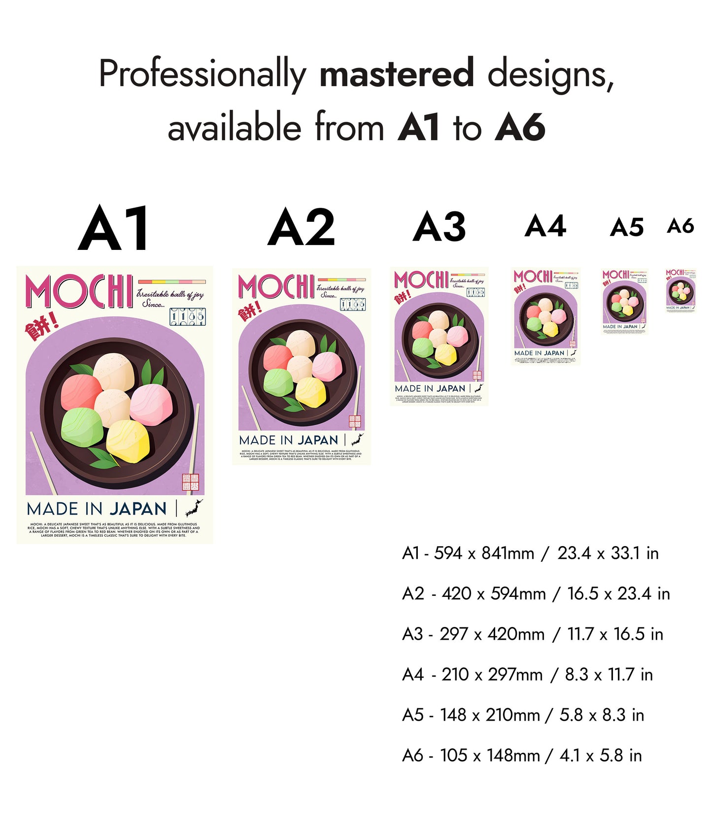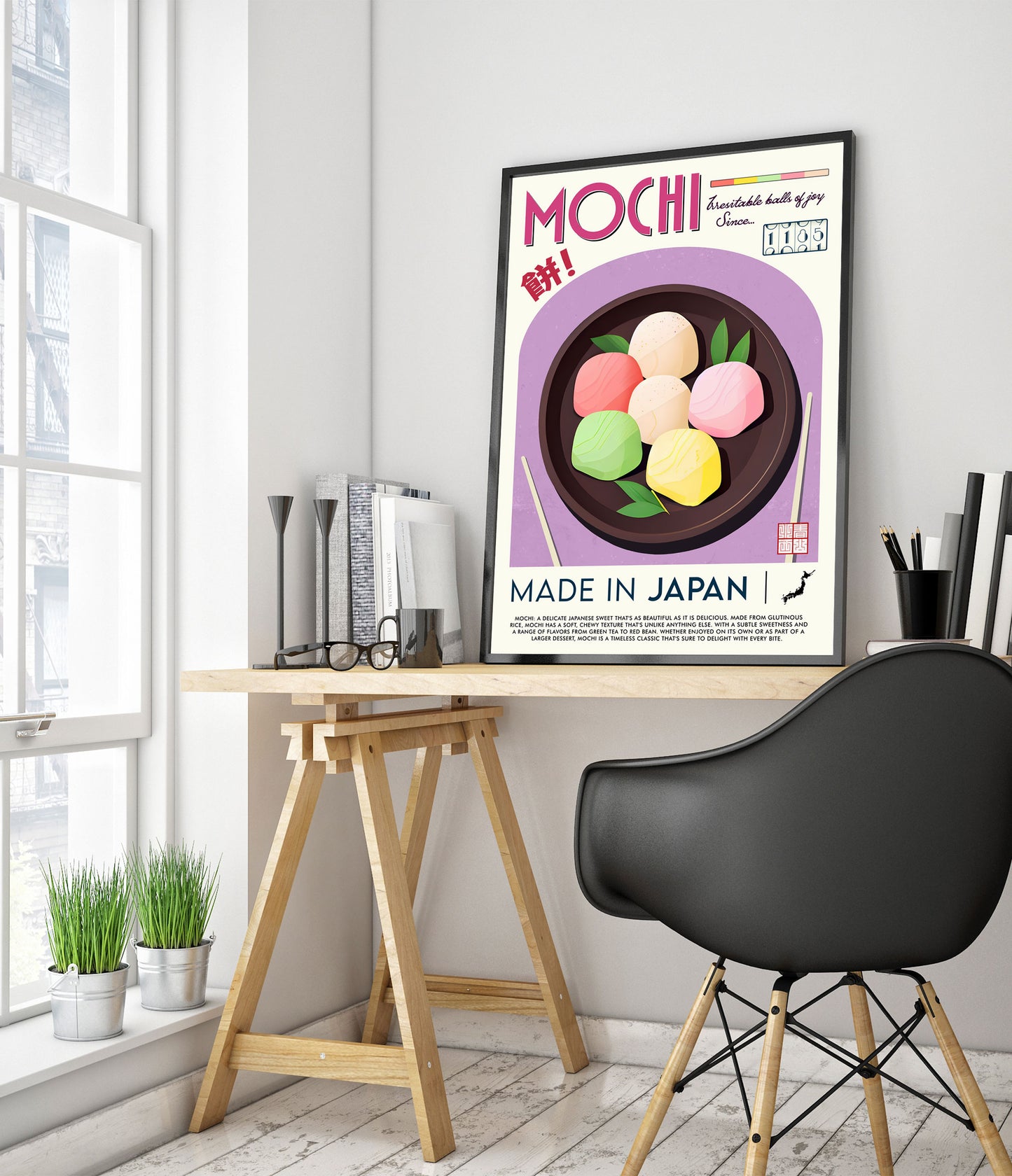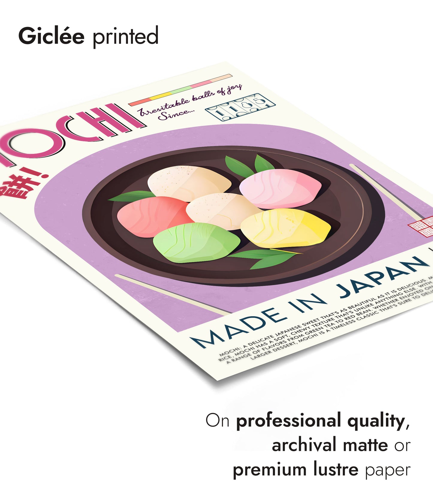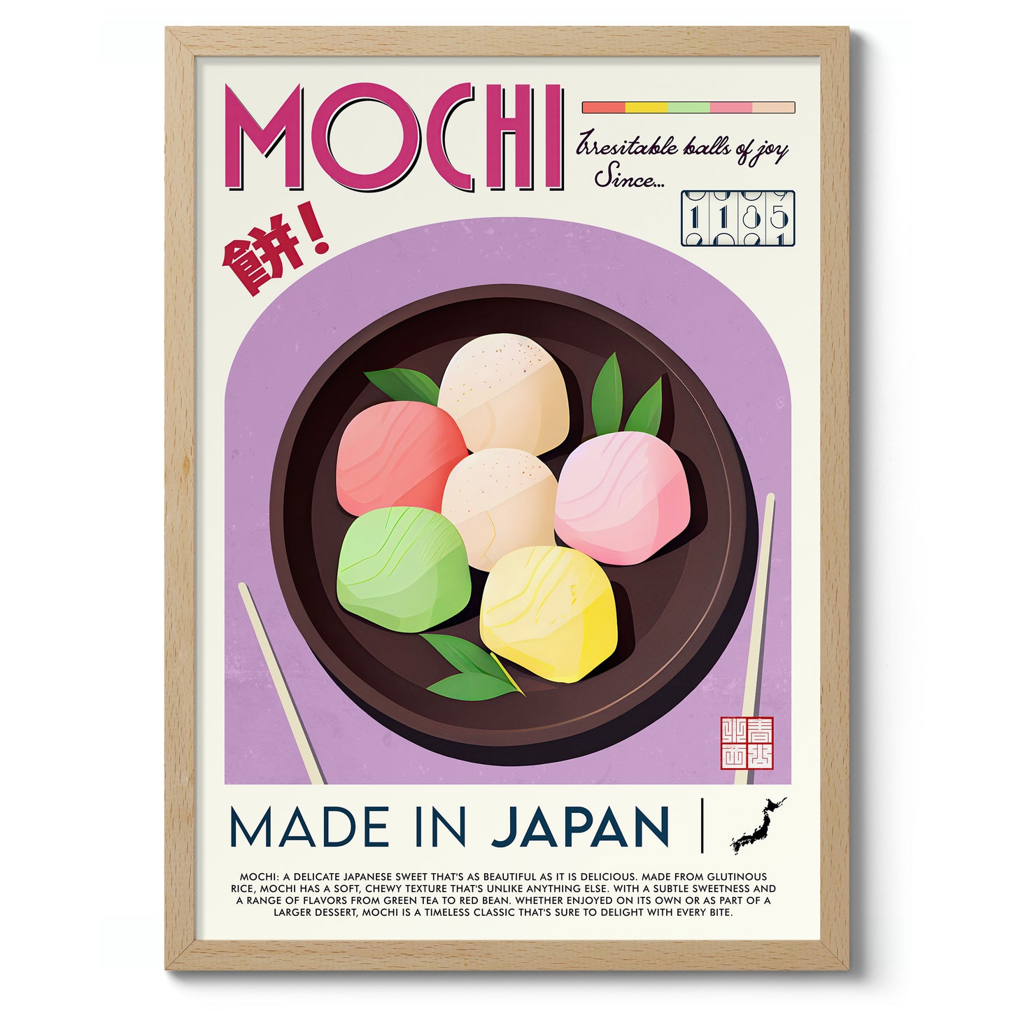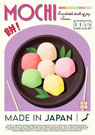This vibrant poster, titled "Mochi," features a delightful illustration of colourful mochi ice cream balls in a wooden bowl. Inspired by vintage Japanese advertisement styles, it includes elements like chopsticks and calligraphy, enhancing its authentic feel. Perfect for food enthusiasts and anime art fans, this graphic print brings a touch of traditional Japanese culture to any space. Made in Japan.