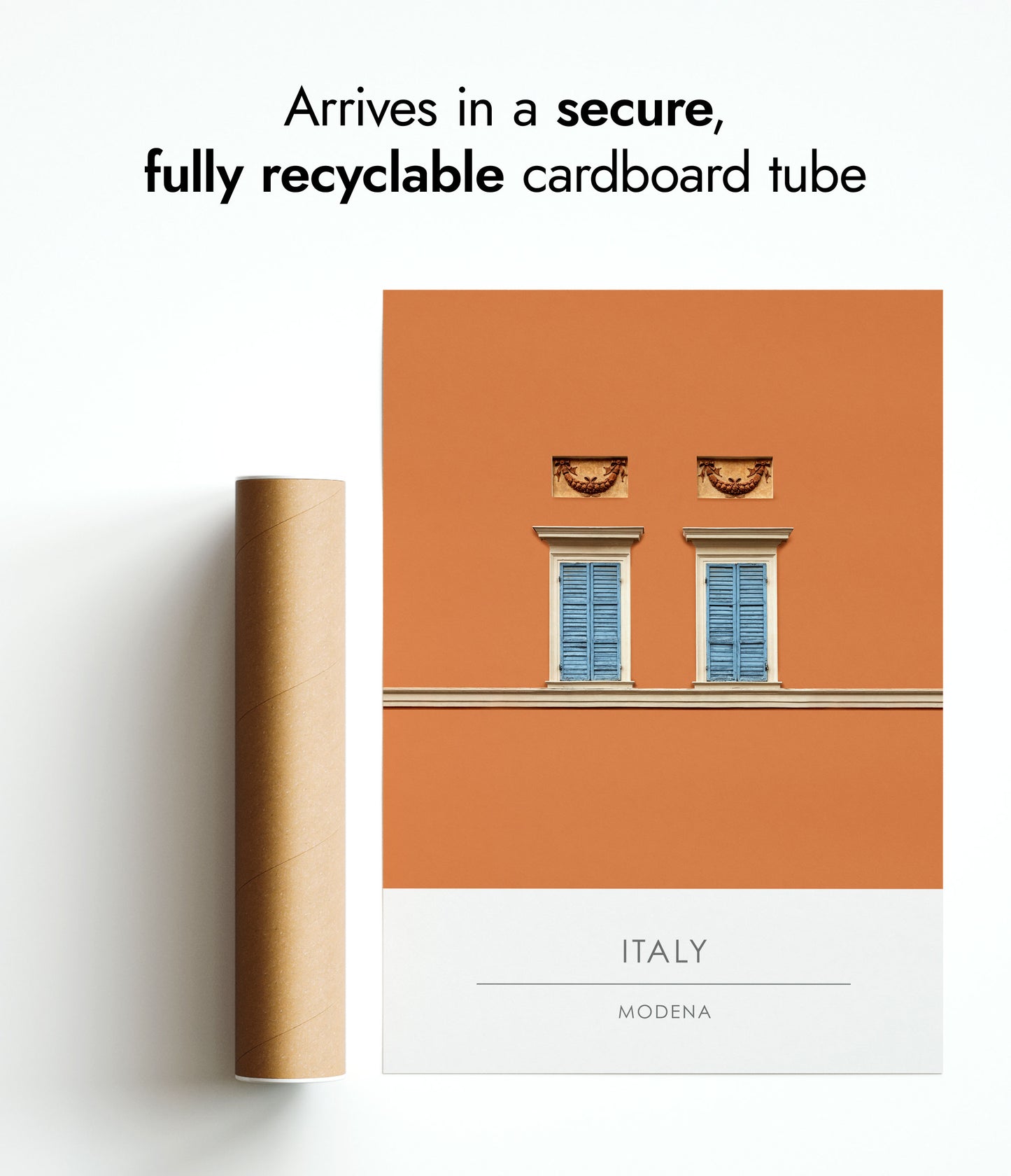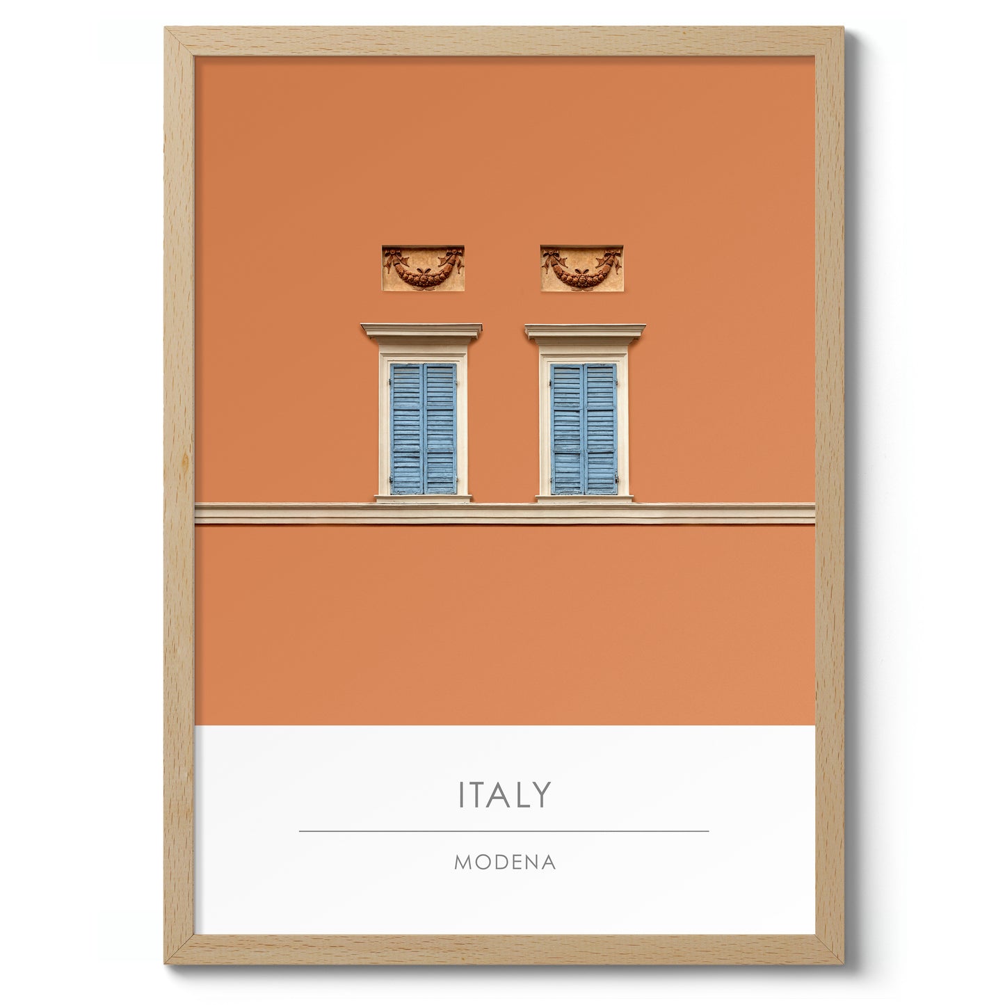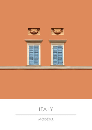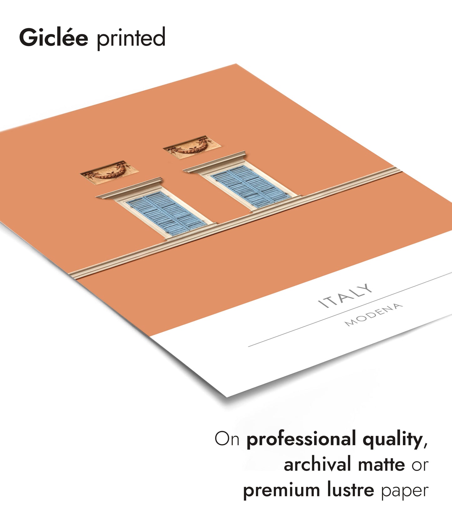 This "Modena, Italy" poster captures the minimalist essence of Italian architecture with its striking orange facade and symmetrical blue windows. Photographed by Katy Donaldson, this modern portrait, featuring clean lines and vibrant colours, adds a stylish touch to any home decor. Ideal for those seeking a contemporary and architectural art print reflecting the charm of European cityscapes.