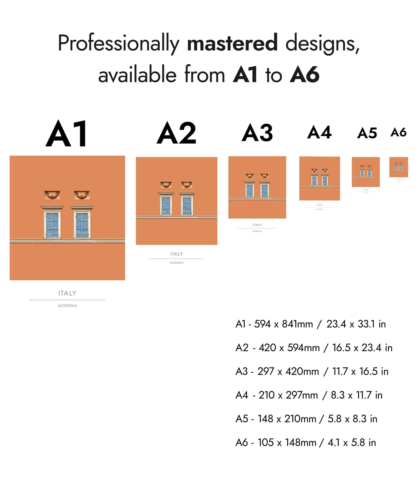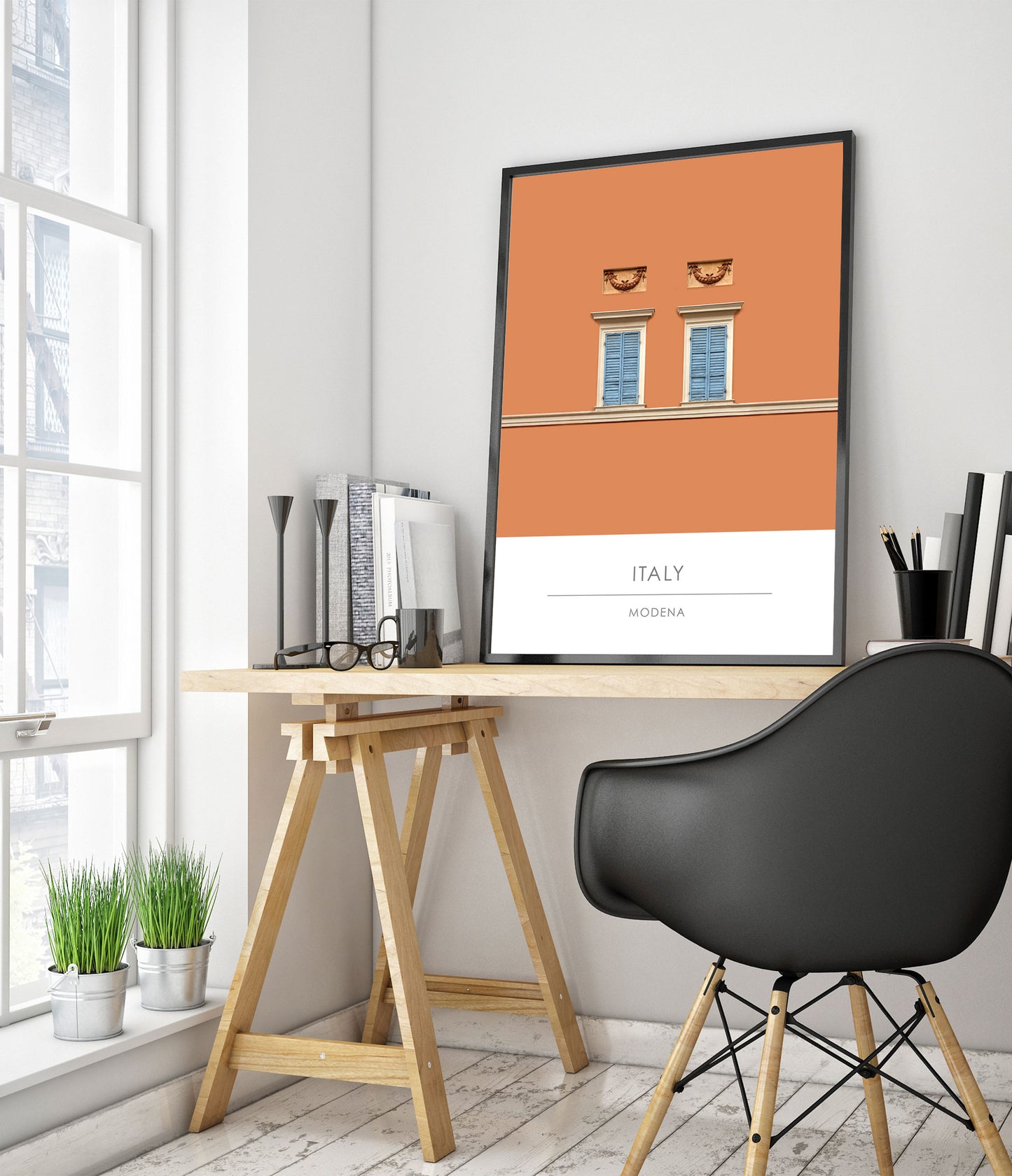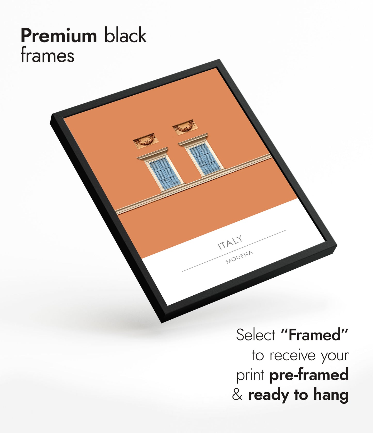 This "Modena, Italy" poster captures the minimalist essence of Italian architecture with its striking orange facade and symmetrical blue windows. Photographed by Katy Donaldson, this modern portrait, featuring clean lines and vibrant colours, adds a stylish touch to any home decor. Ideal for those seeking a contemporary and architectural art print reflecting the charm of European cityscapes.