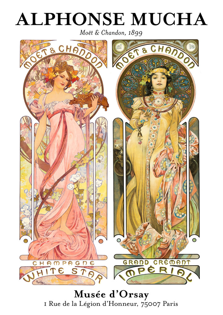 Alphonse Mucha's "Moët & Chandon" poster, an exquisite Art Deco portrayal, features two elegant women personifying the Champagne brands, White Star and Grand Crémant Impérial. The intricate details, vibrant colours, and antique charm showcase Mucha’s iconic style. Ideal for admirers of vintage illustrations and champagne enthusiasts, this art print brings classic sophistication to your space.