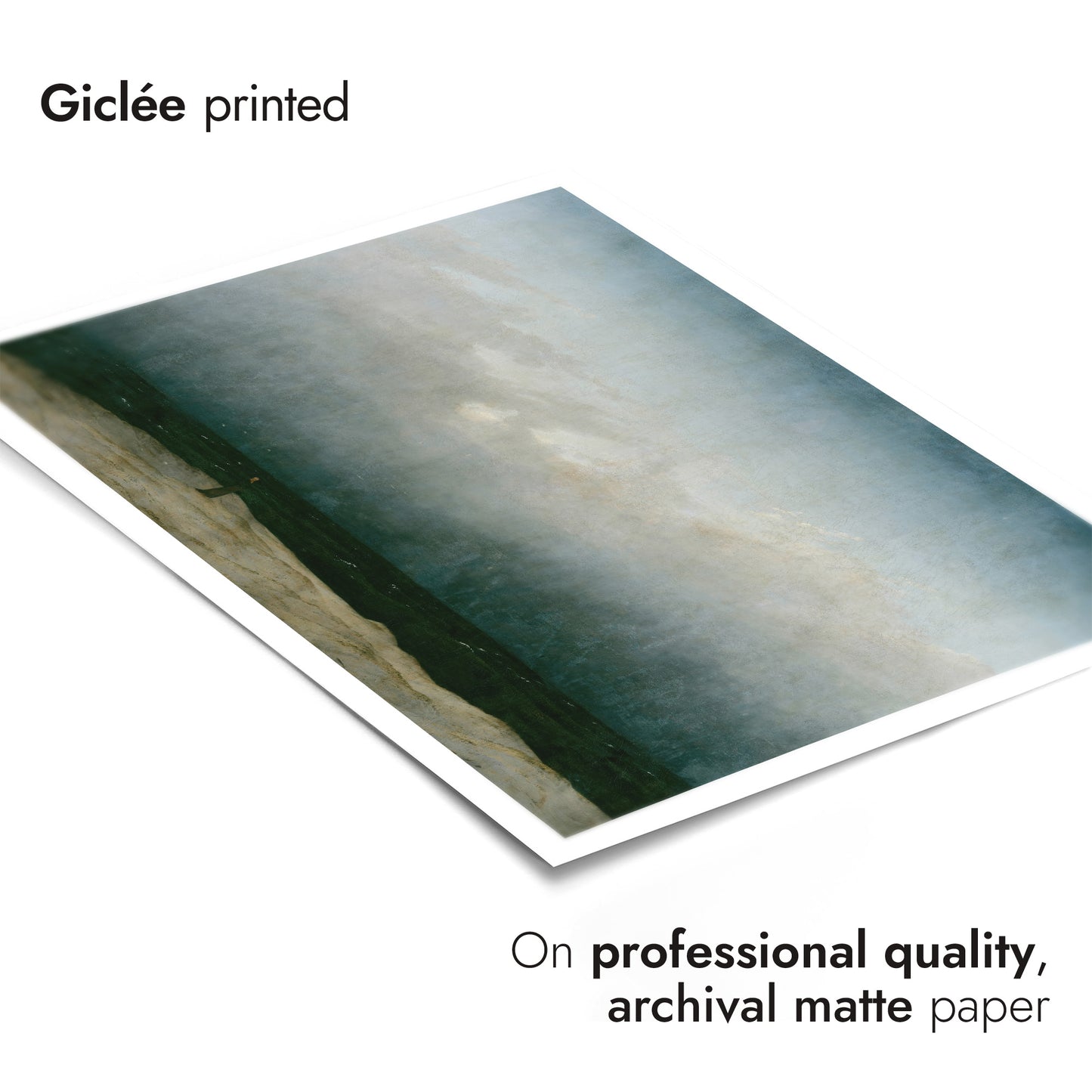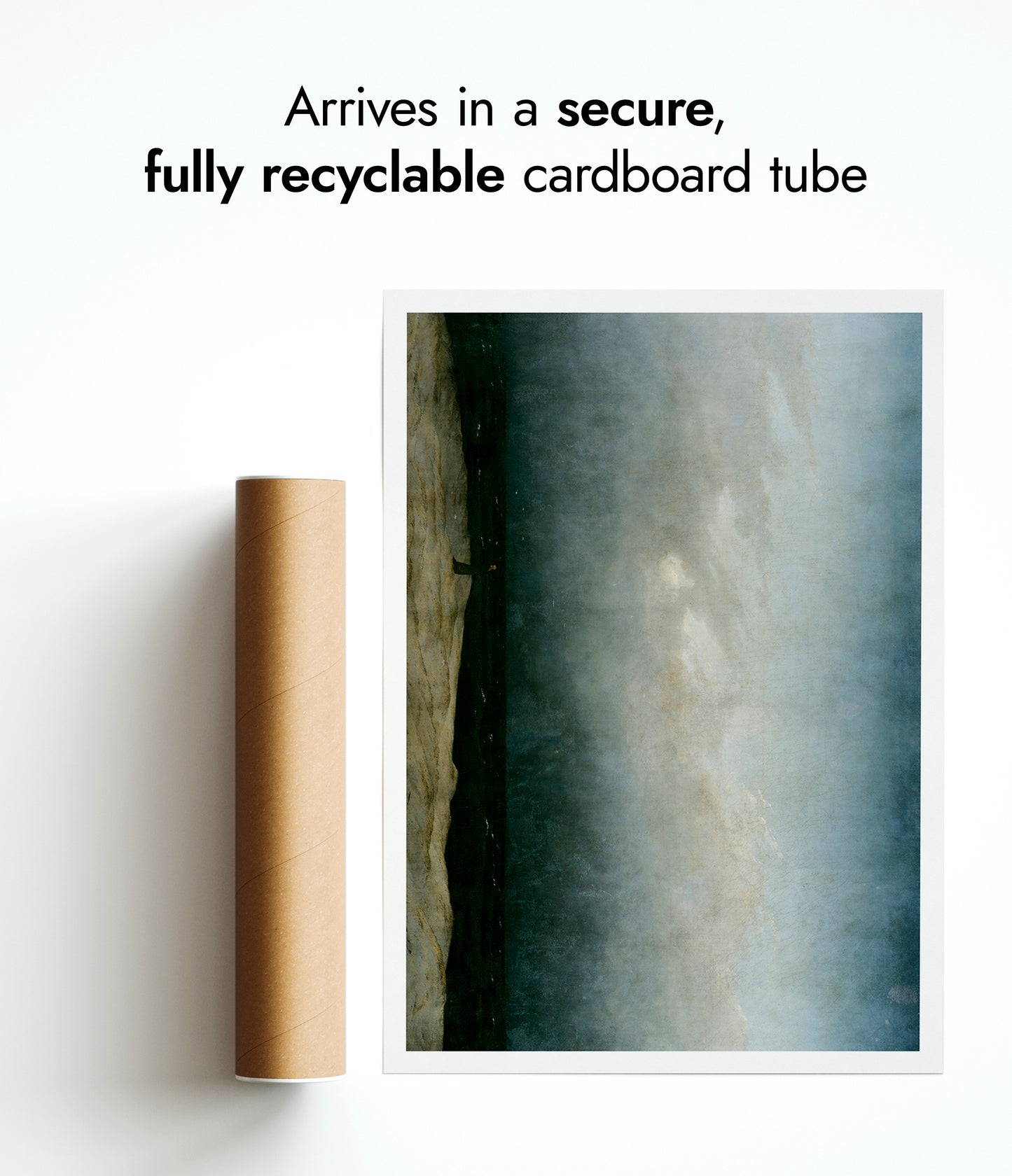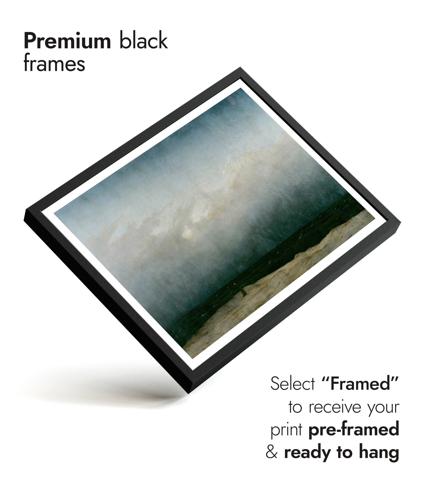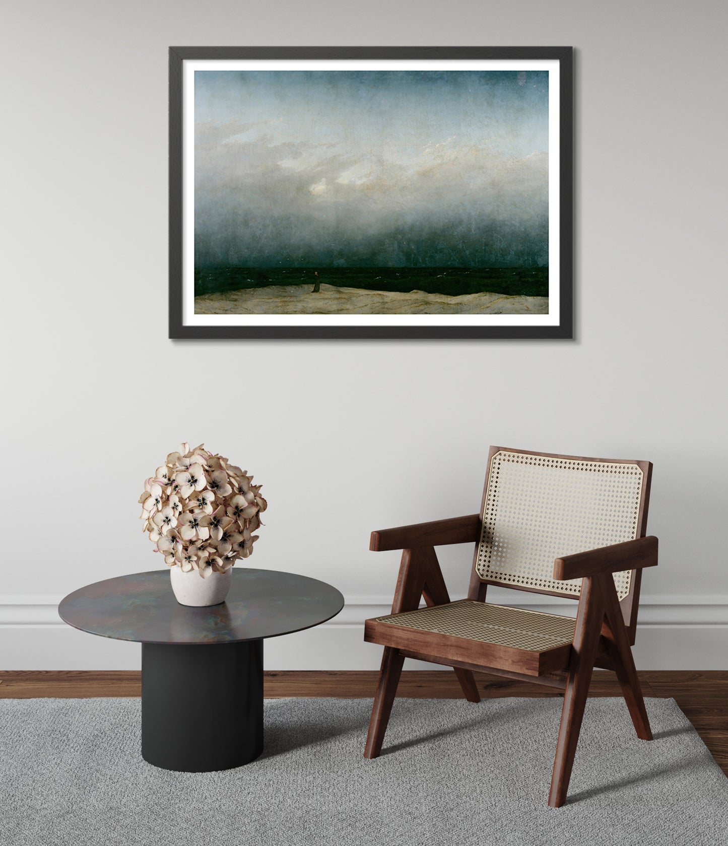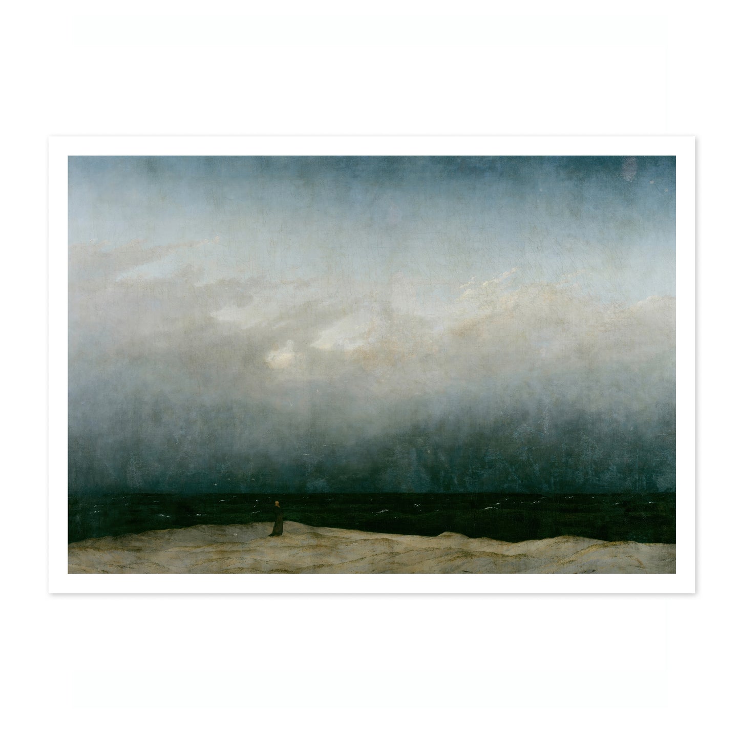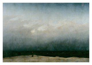 The "Monk by the Sea" poster by Caspar David Friedrich features a solitary monk standing by a rocky cliff, looking out over dark and stormy seascape. With muted colours, impressionistic brush strokes and a broad, contemplative landscape, this German romantic-era piece is perfect for admirers of classic, evocative landscape paintings.