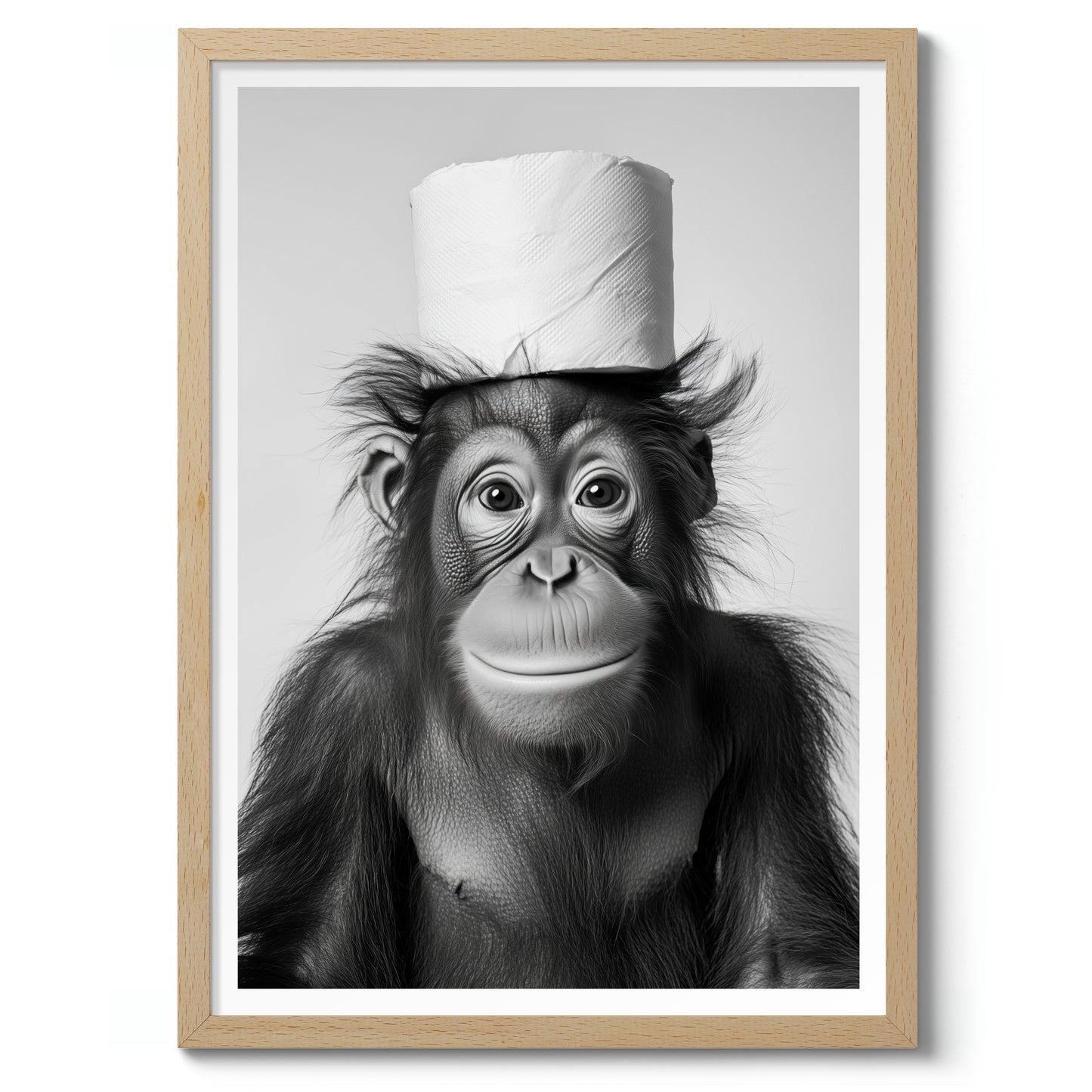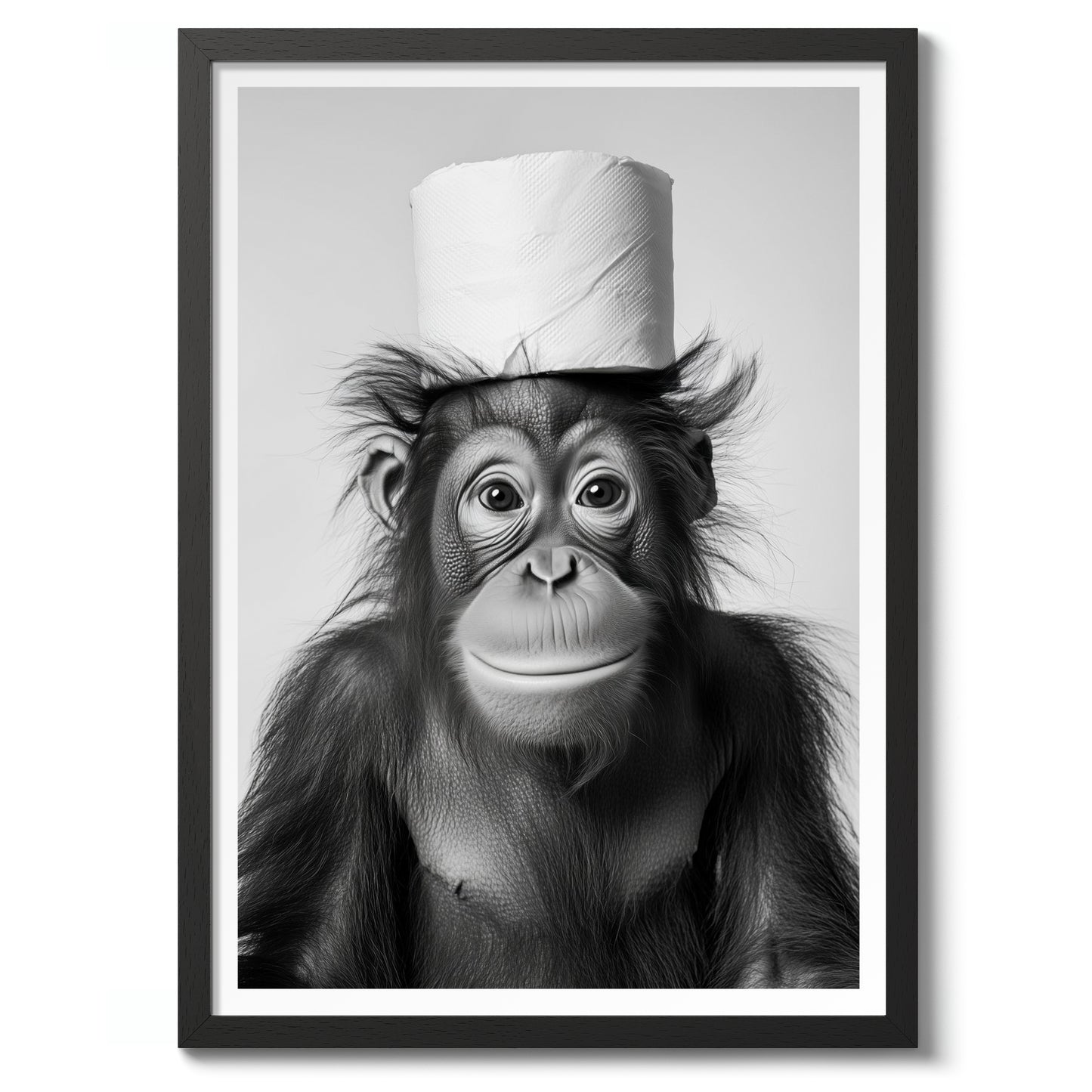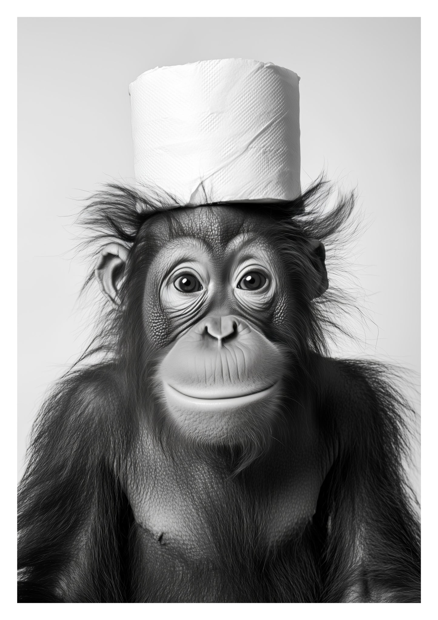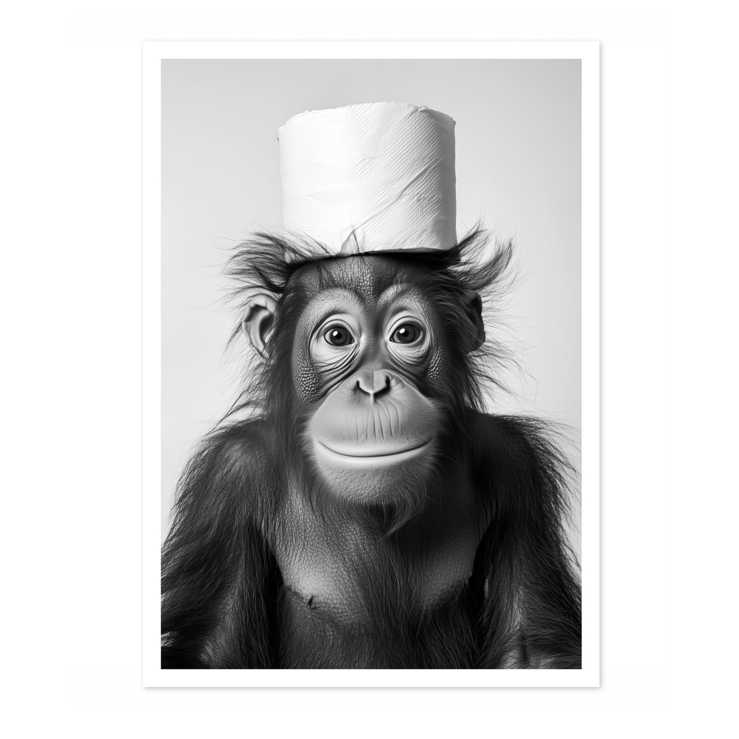This striking black and white monkey poster, titled "Monkey Business," humorously captures a wide-eyed chimpanzee wearing a toilet paper roll as a hat. The playful thematic elements blend nature with light-hearted bathroom humor, making it an intriguing piece for eclectic decor. Ideal for adding a whimsical touch to any space, this photographic artwork invites smiles through its clever visual narrative.