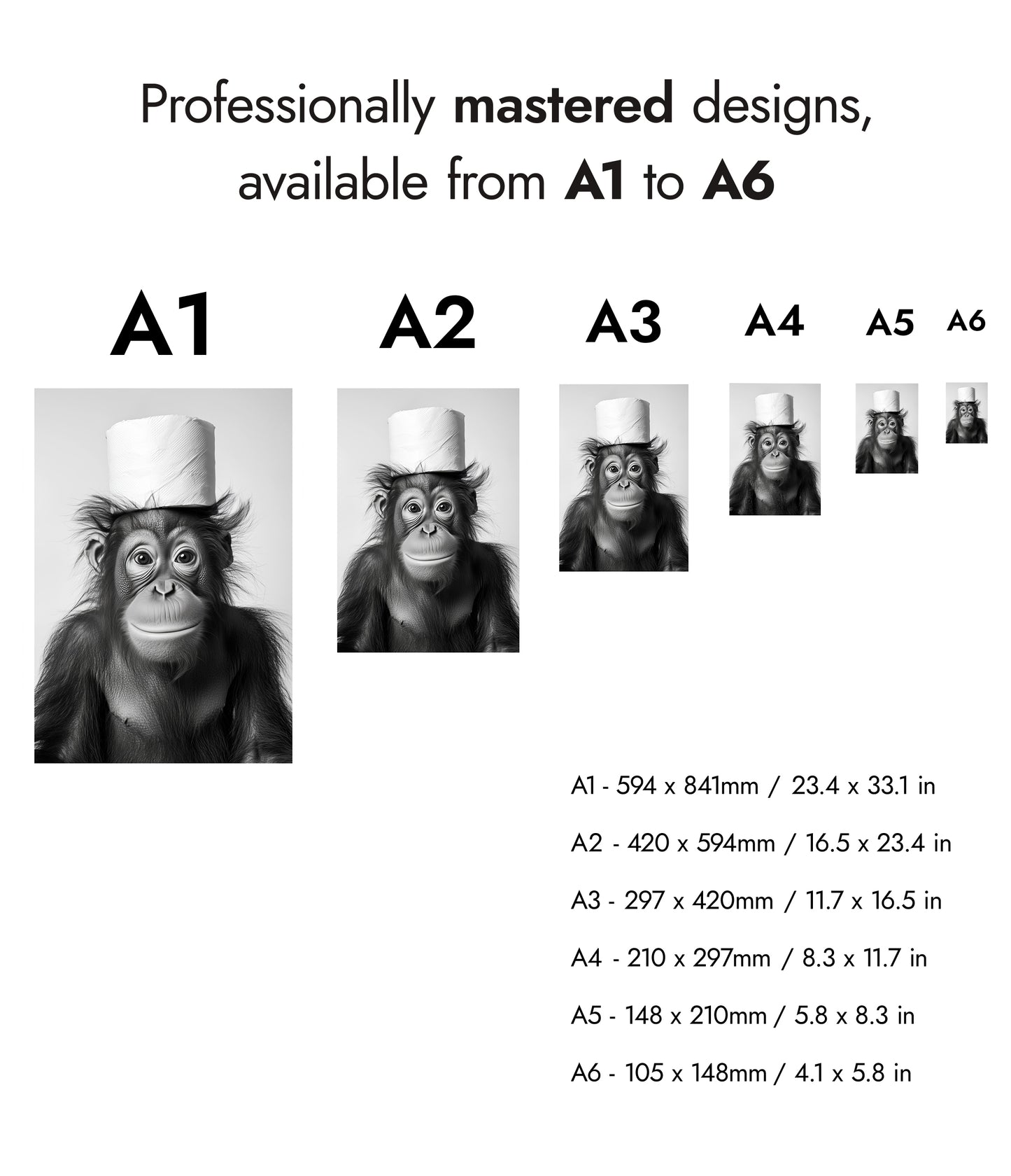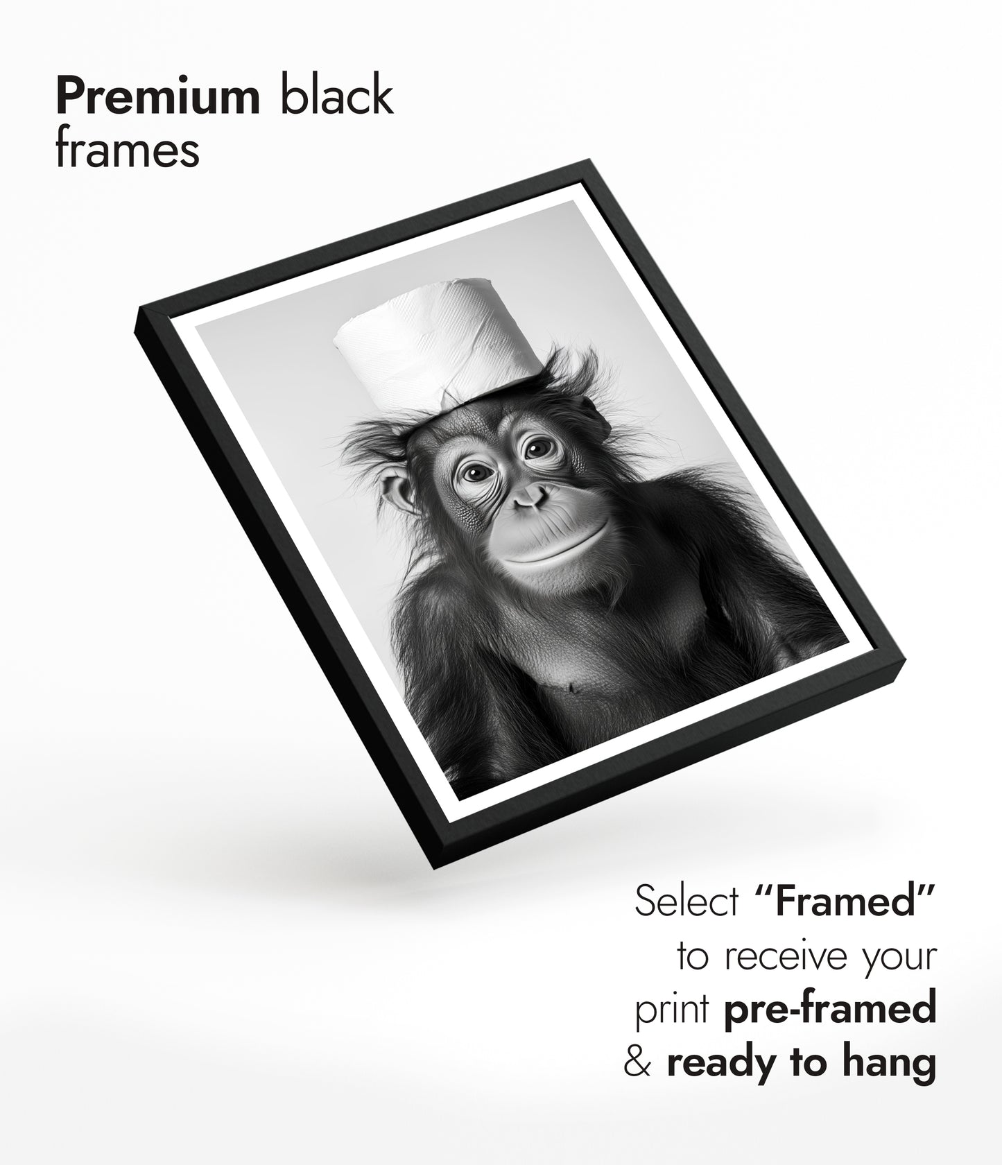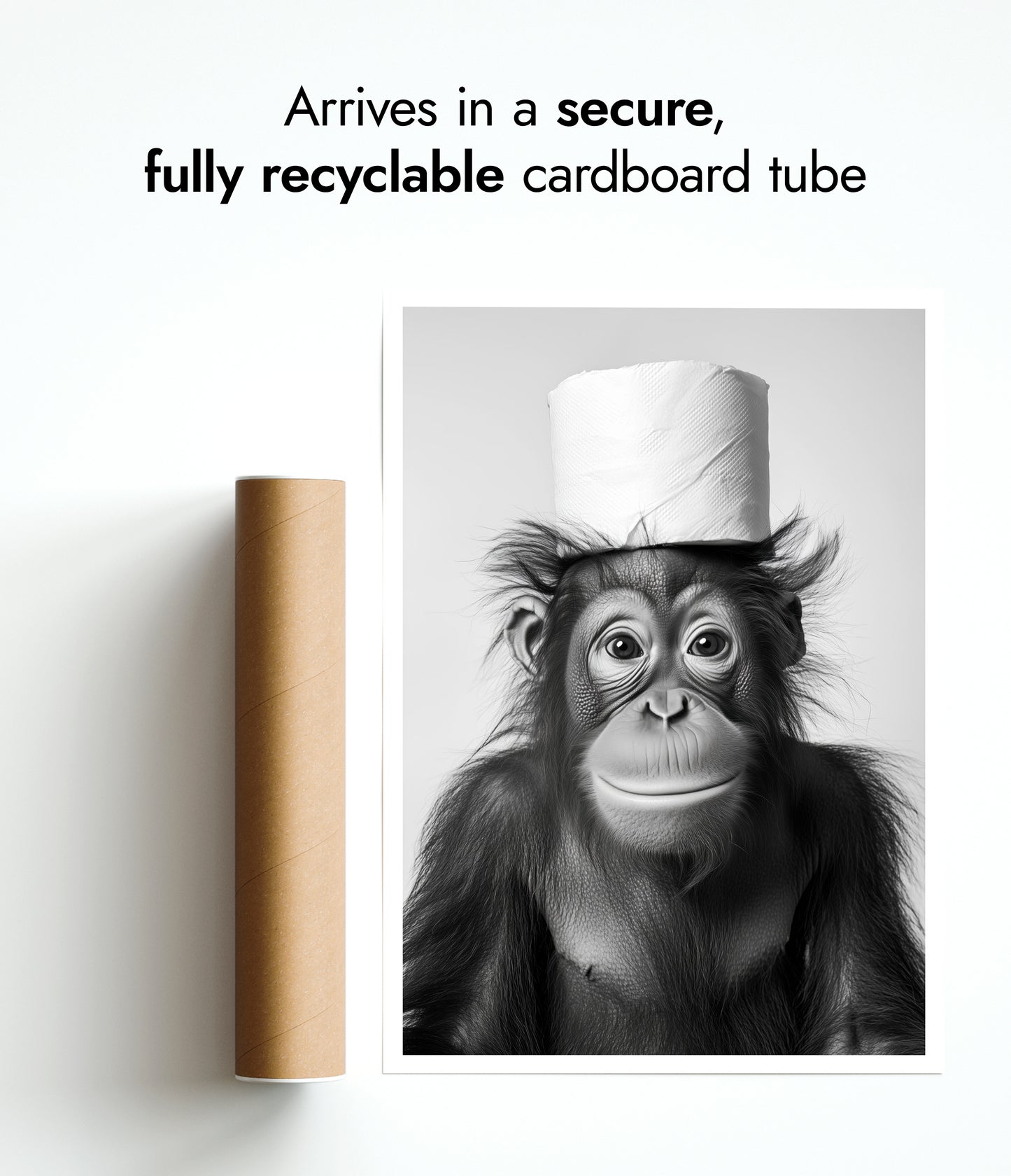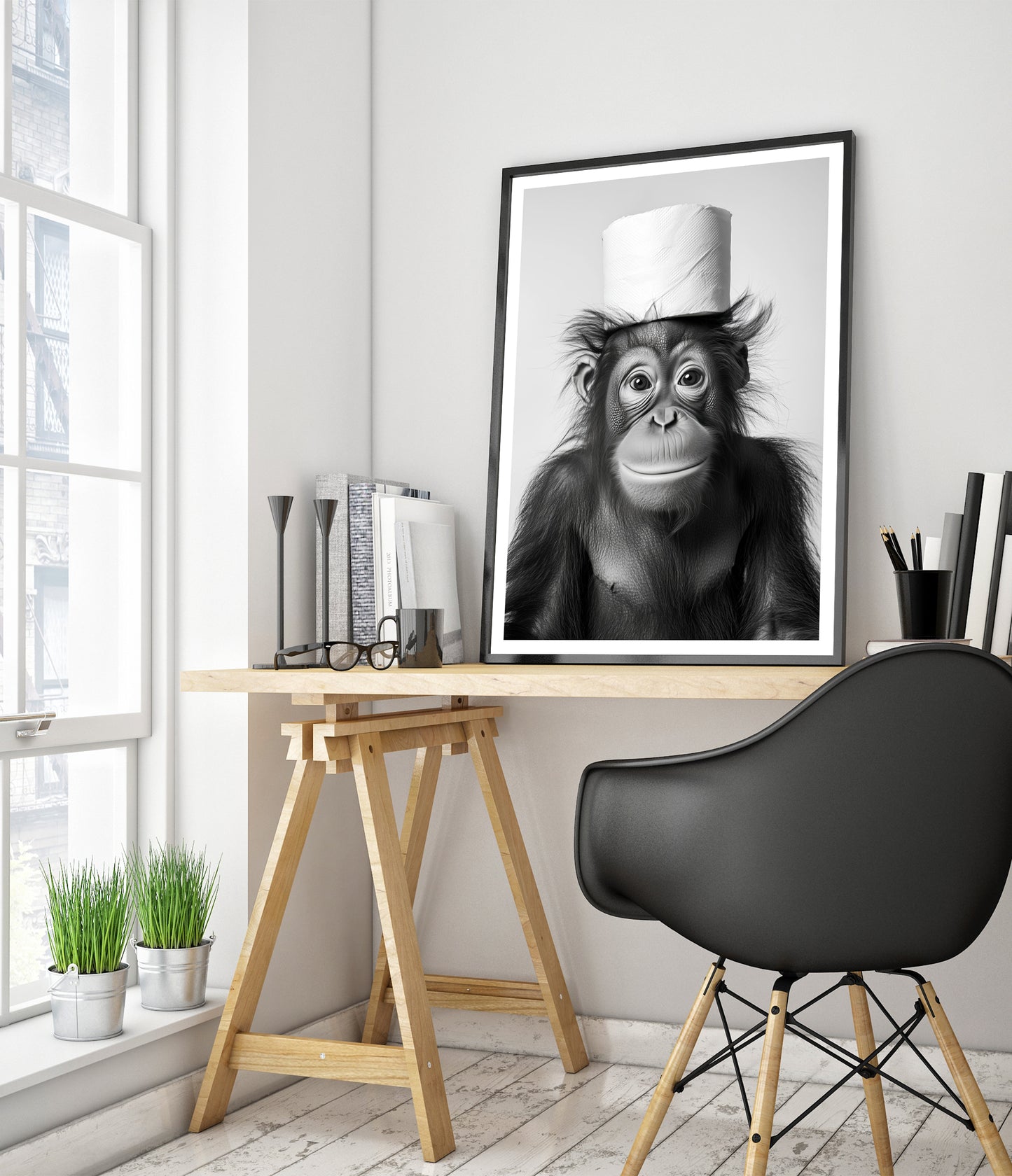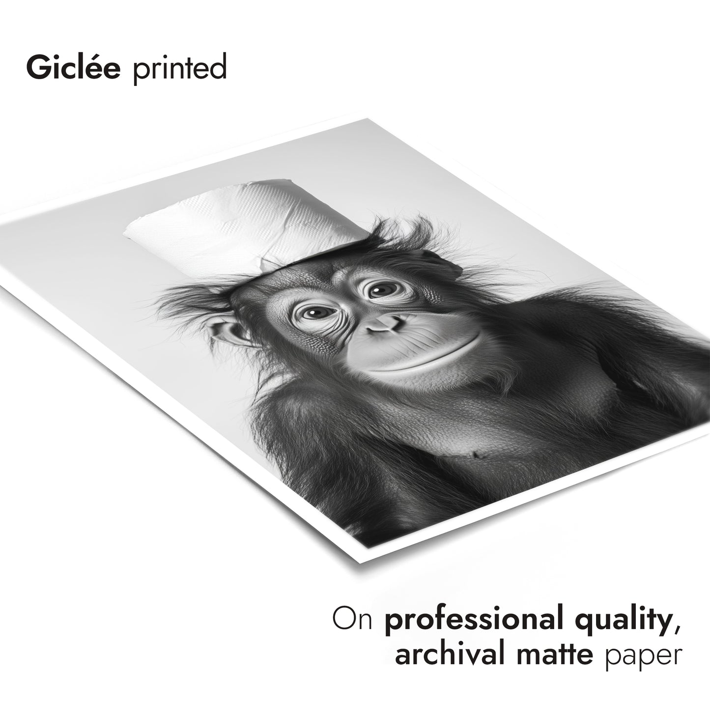 This striking black and white monkey poster, titled "Monkey Business," humorously captures a wide-eyed chimpanzee wearing a toilet paper roll as a hat. The playful thematic elements blend nature with light-hearted bathroom humor, making it an intriguing piece for eclectic decor. Ideal for adding a whimsical touch to any space, this photographic artwork invites smiles through its clever visual narrative.