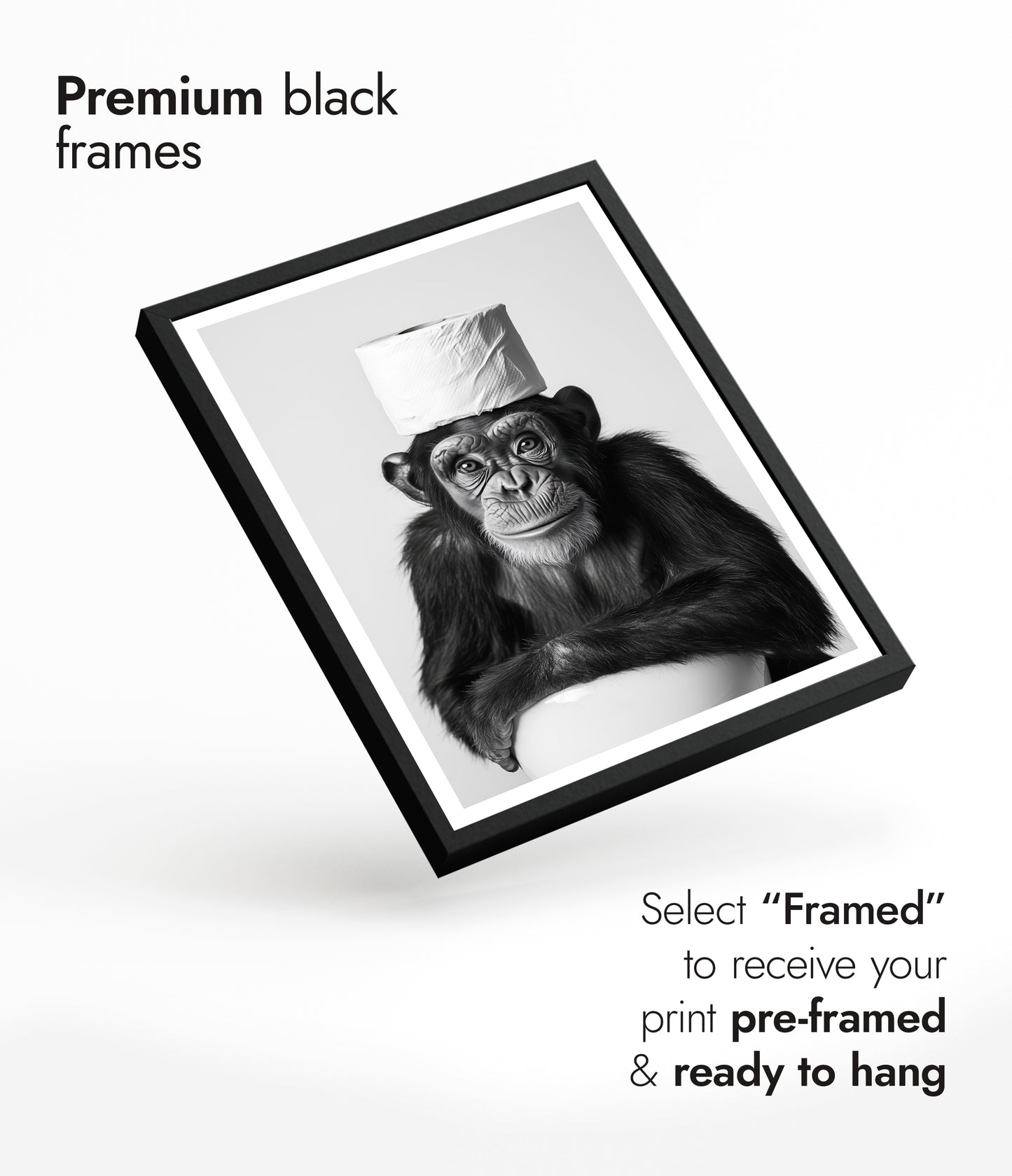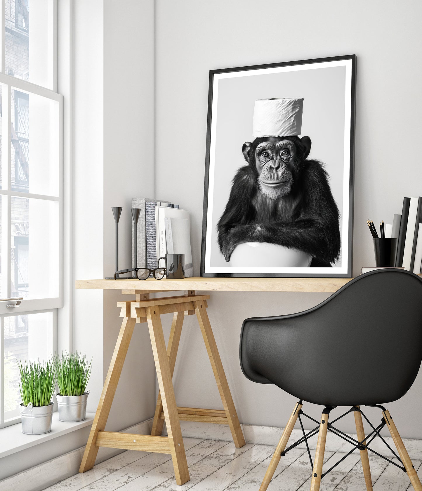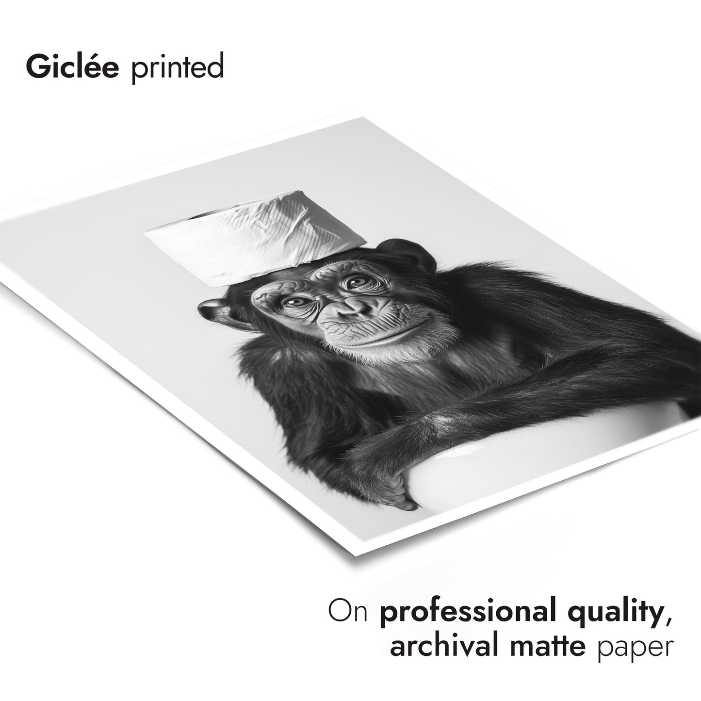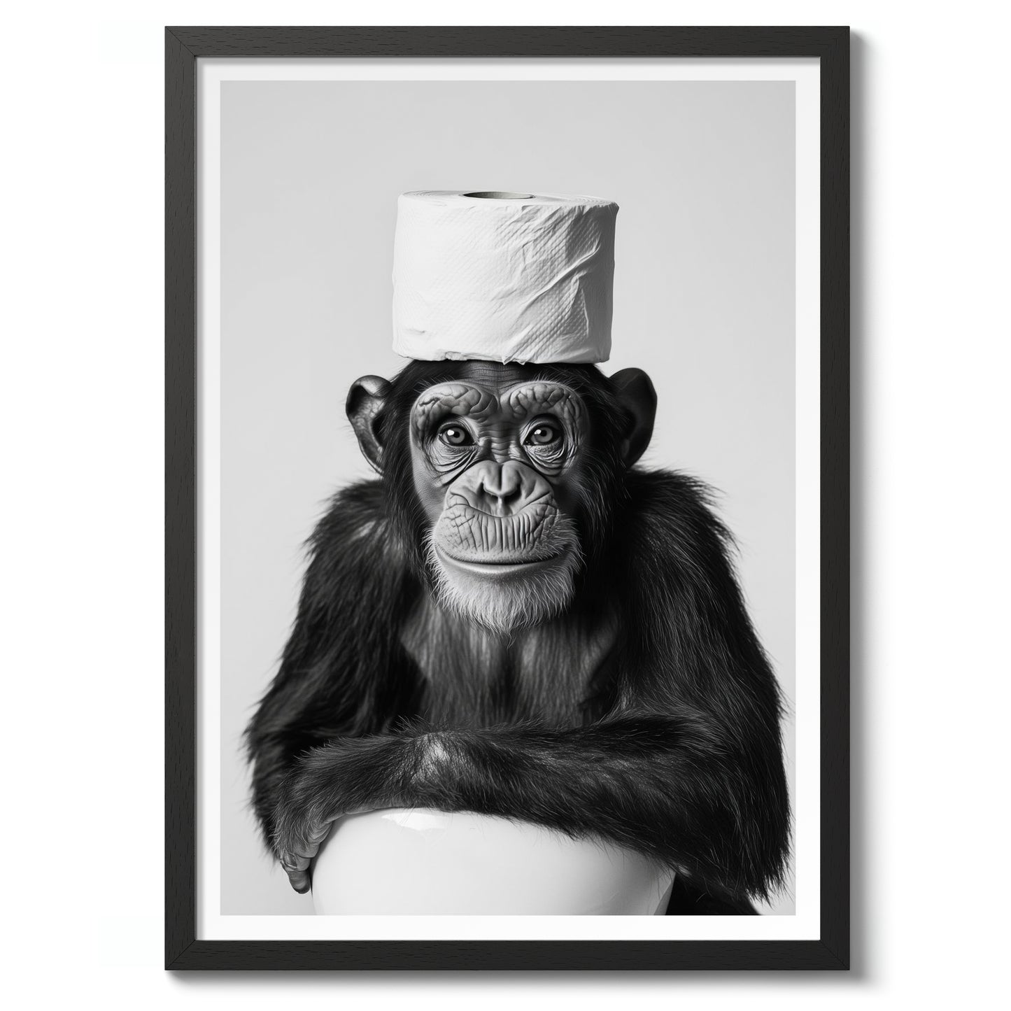The "Monkey See, Monkey Roll" poster captures a humorous black-and-white photograph of a chimpanzee poised with a toilet roll atop its head. Against a minimalist backdrop, the playful scene merges wildlife with unexpected bathroom humor, making it a unique piece for light-hearted decor. Ideal for those with a penchant for quirky and nature-inspired art.