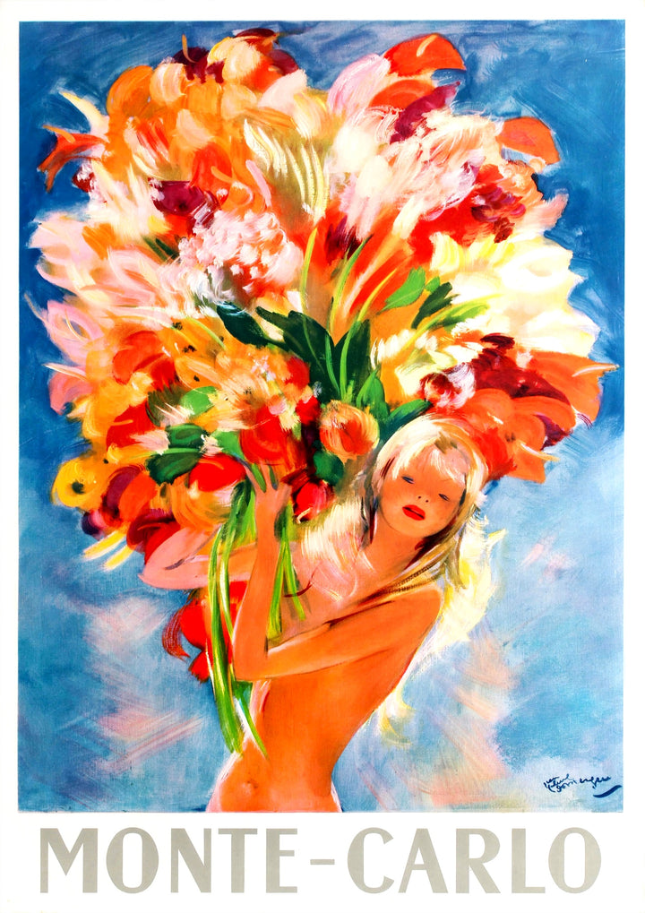 This vibrant Monte Carlo poster captures a stunning illustration of a woman holding an extravagant bouquet of flowers against a brilliant blue sky. The colourful bouquet bursts with warm reds, oranges, and yellows, resonating with the Mediterranean charm of Monaco. Perfect for travel enthusiasts and art lovers alike, this vintage-style portrait adds a lively European touch to any space.
