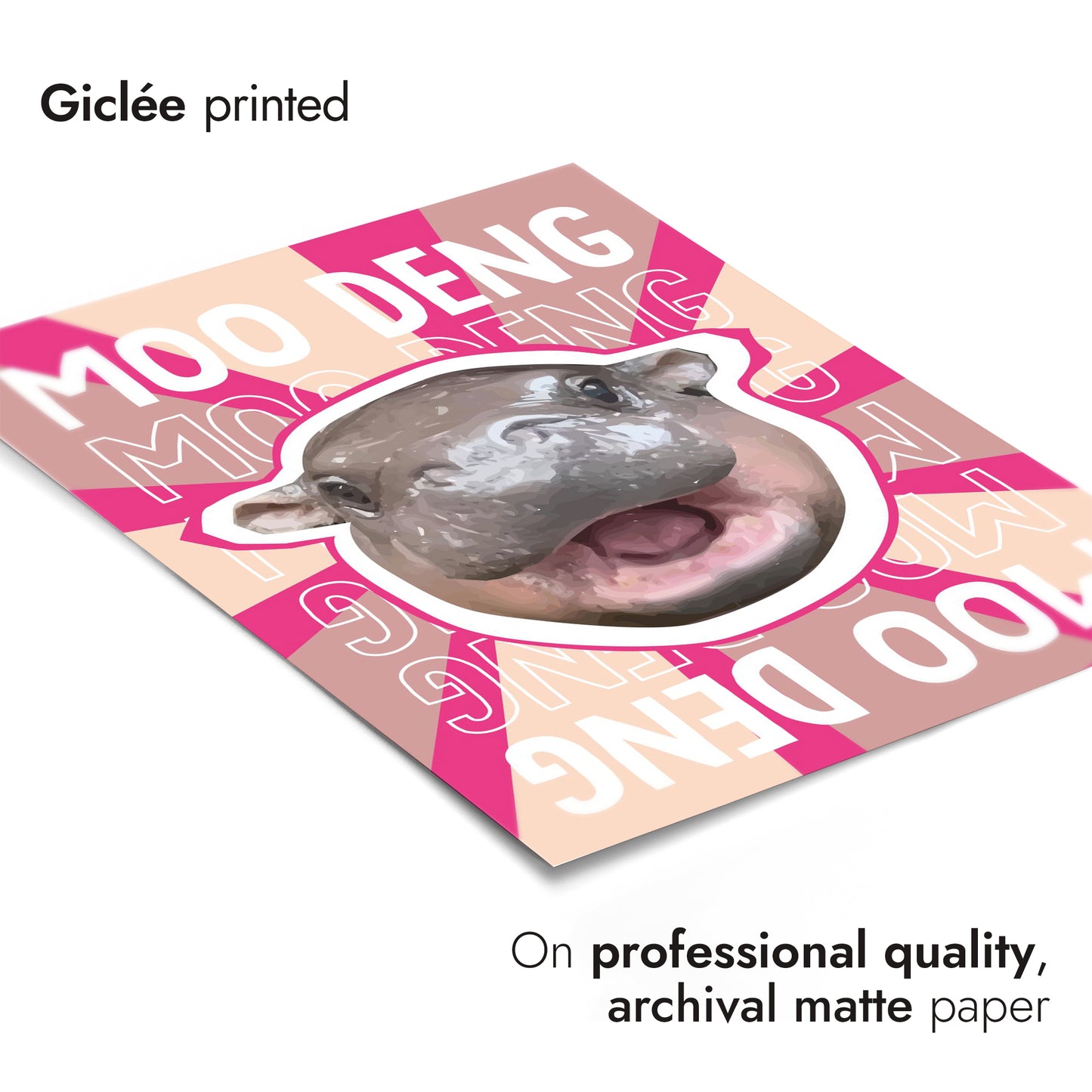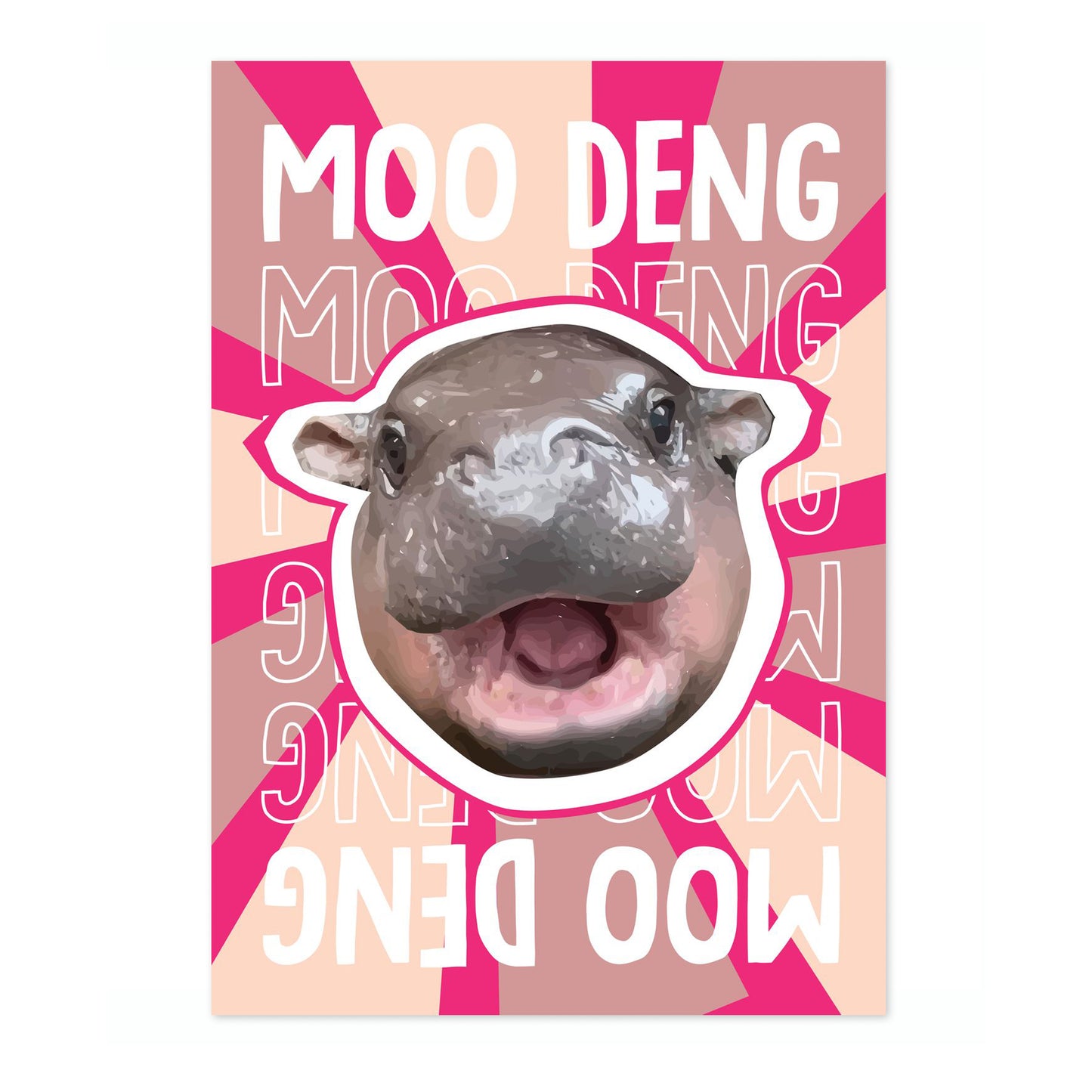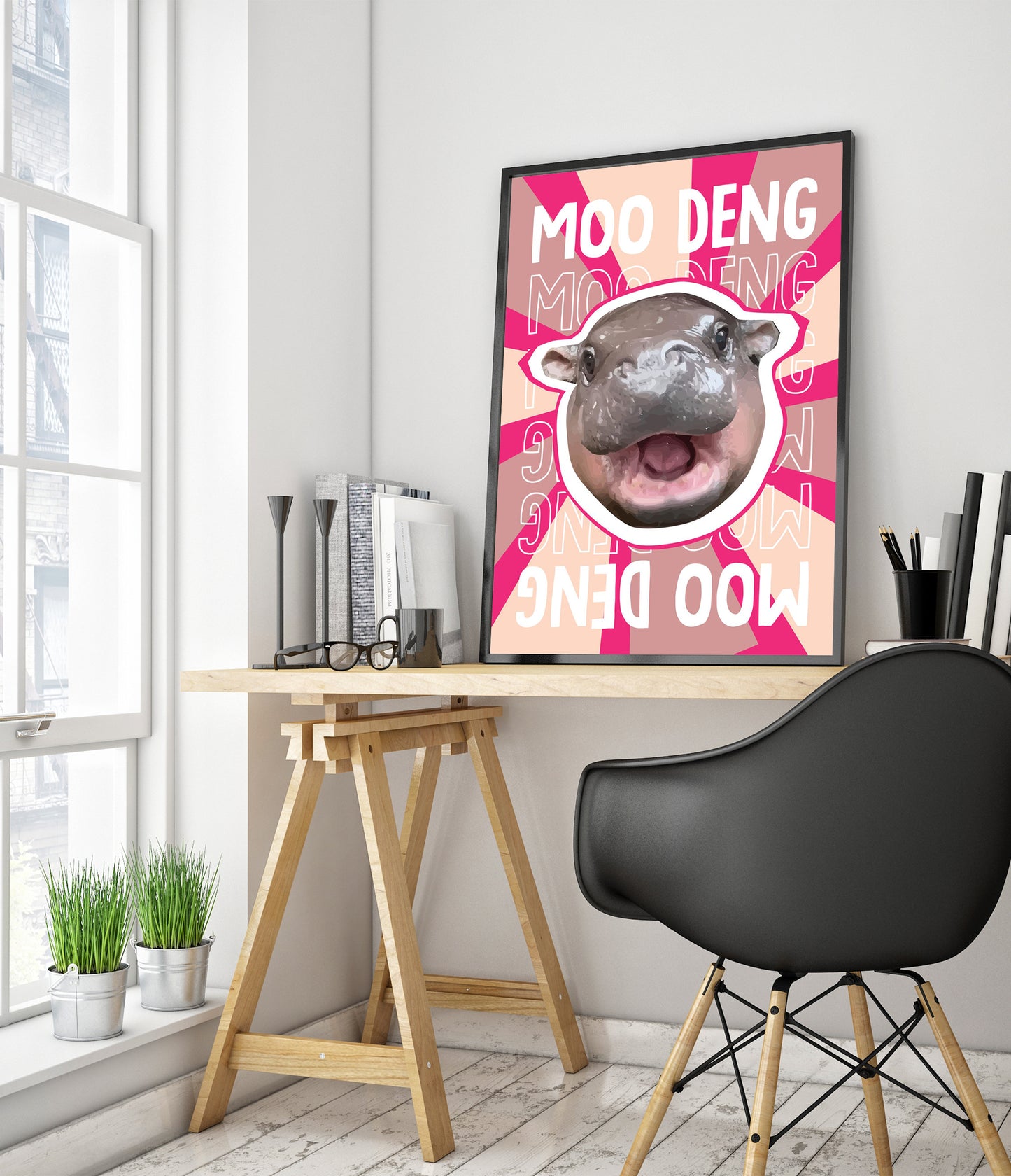 The "Moo Deng" poster features a charming hippo with a humorous expression set against a vibrant pink starburst background. The playful typography echoes the hippo's delightful theme, enhancing the graphic and funny style. Ideal for those seeking cute and humorous animal art, this eye-catching print adds a fun and lively touch to any space.