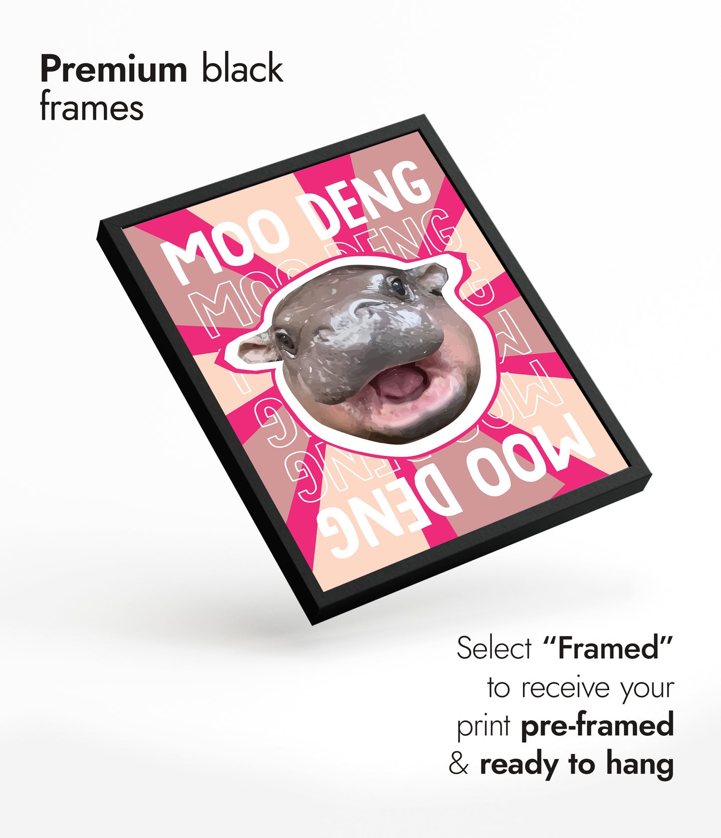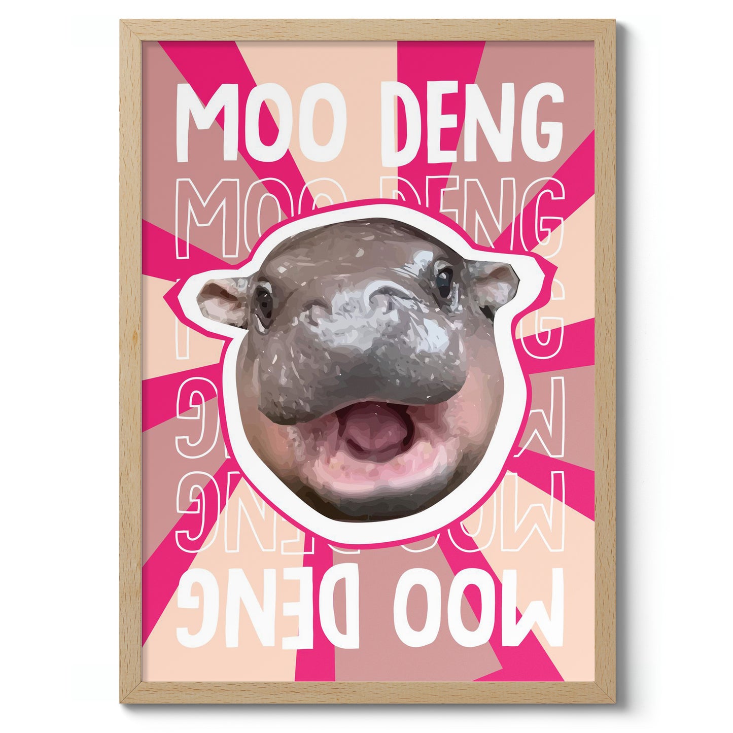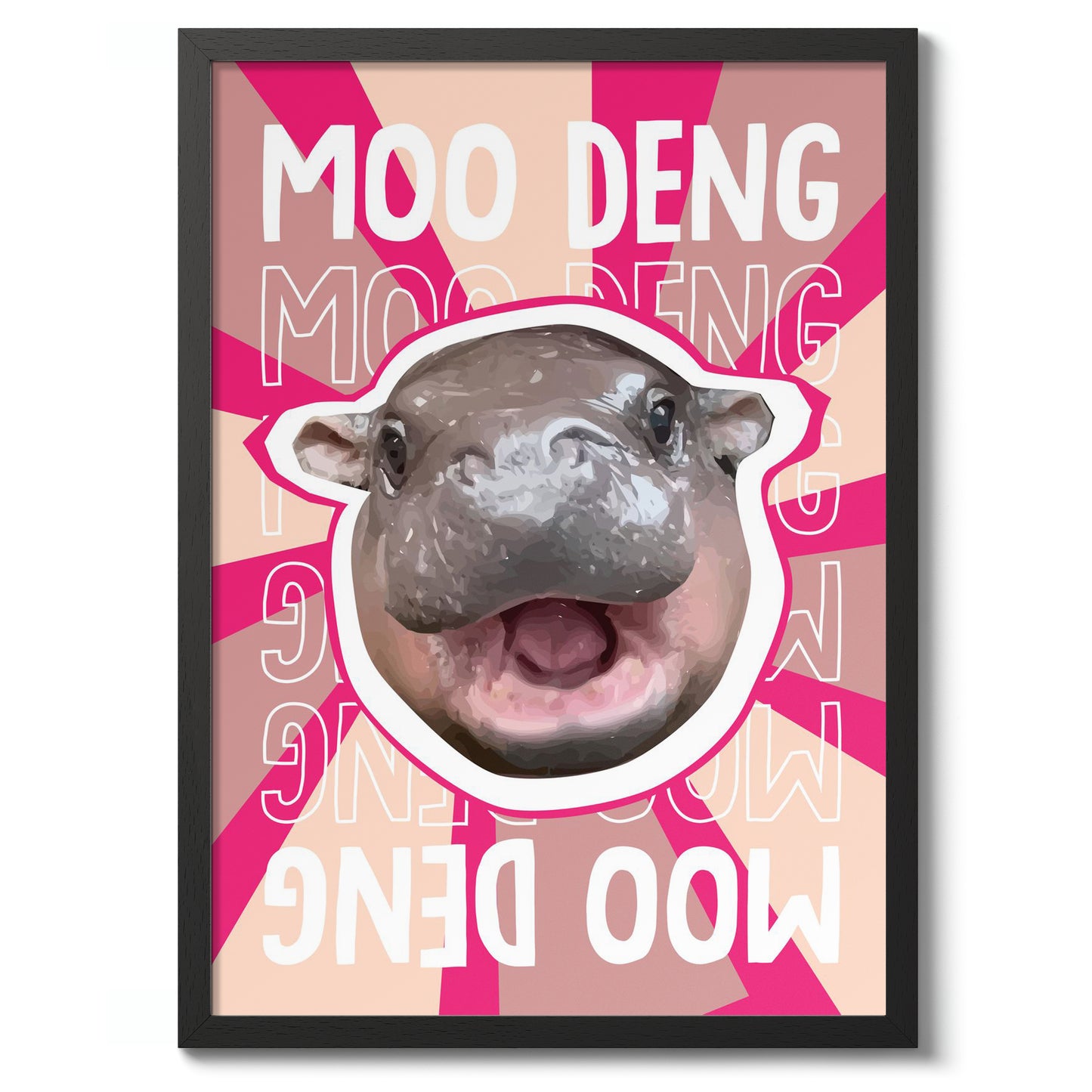 The "Moo Deng" poster features a charming hippo with a humorous expression set against a vibrant pink starburst background. The playful typography echoes the hippo's delightful theme, enhancing the graphic and funny style. Ideal for those seeking cute and humorous animal art, this eye-catching print adds a fun and lively touch to any space.