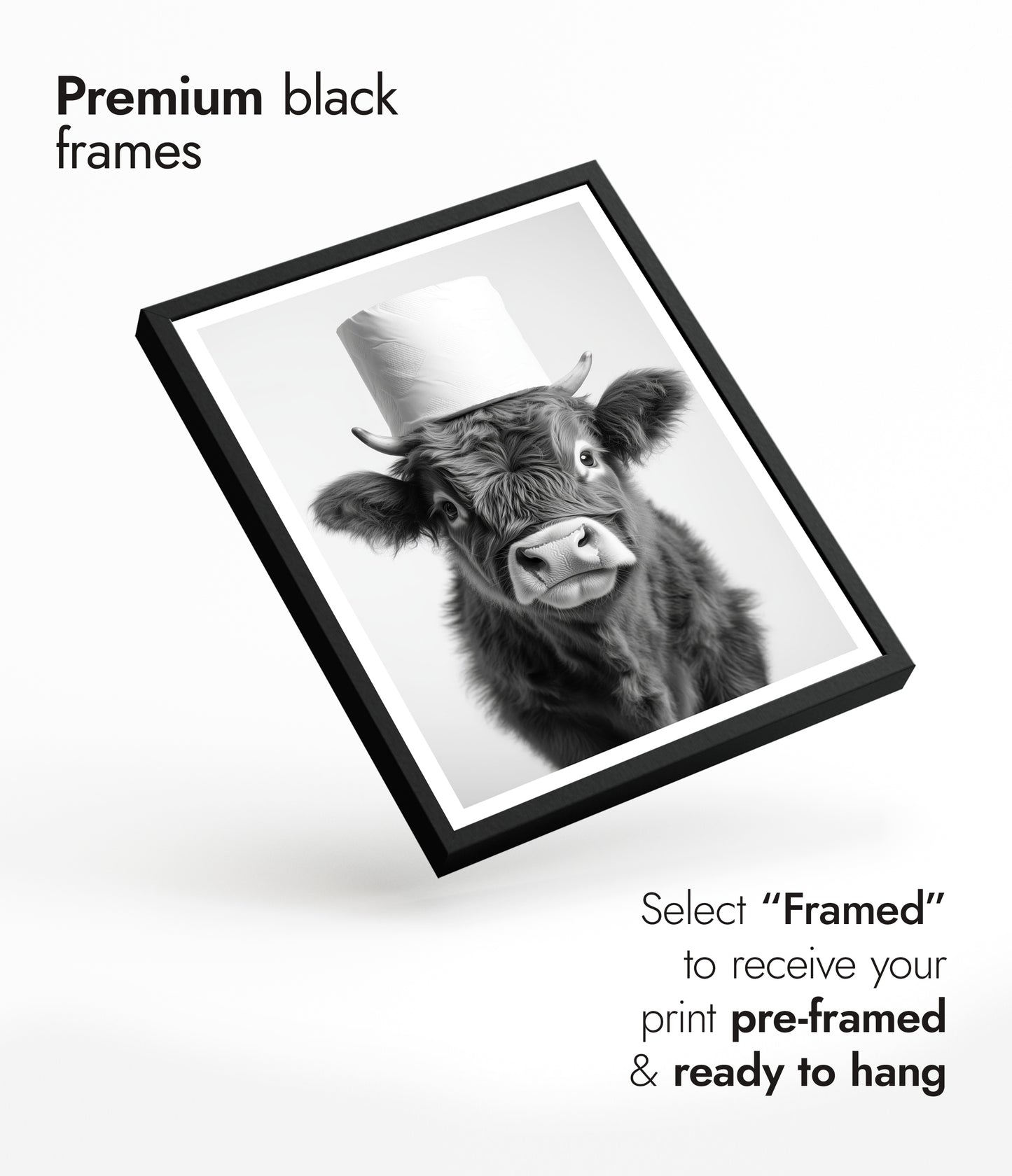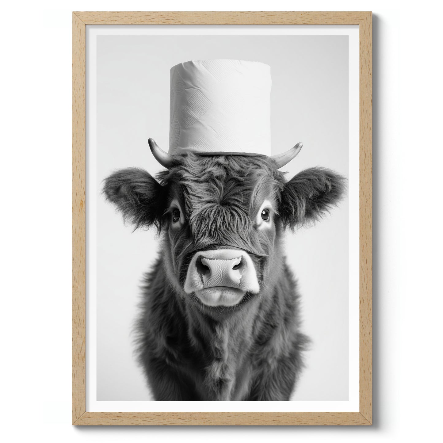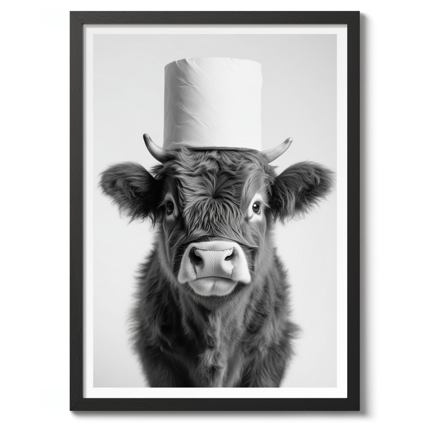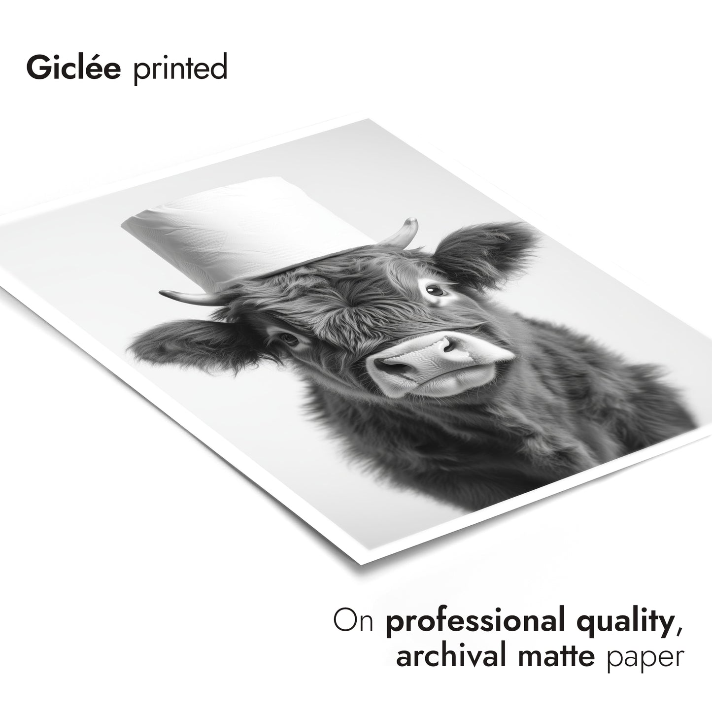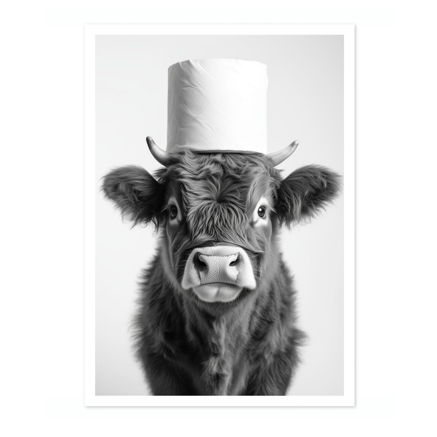 This black and white photographic poster captures a whimsical cow sporting a toilet paper roll as a hat, merging humor with elegance. Titled "Moo-destly Soft," the art piece blends nature and playful bathroom themes, creating a unique visual statement. Perfect for adding character to any space, this poster highlights creativity and charm with its clever juxtaposition of rustic and modern elements.