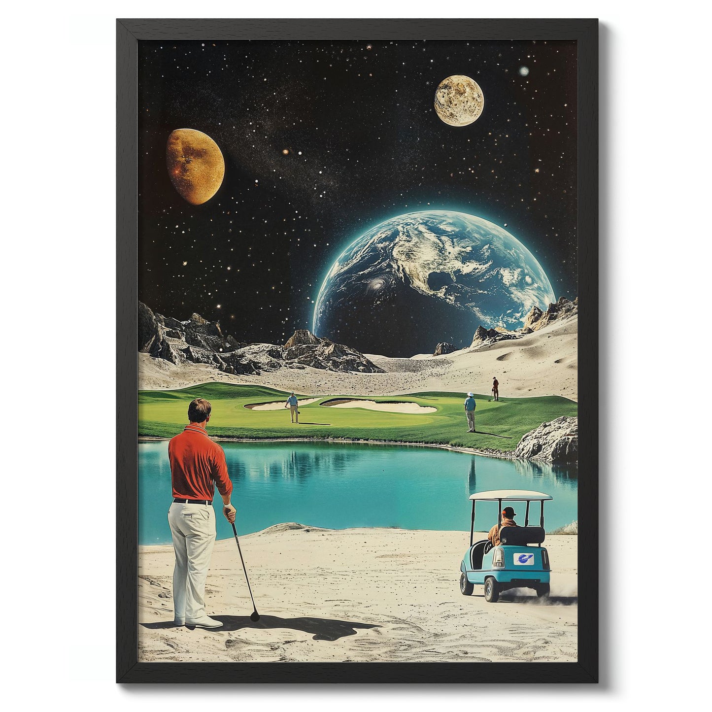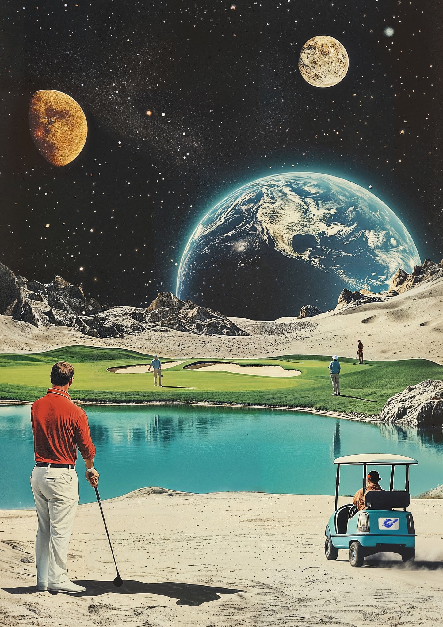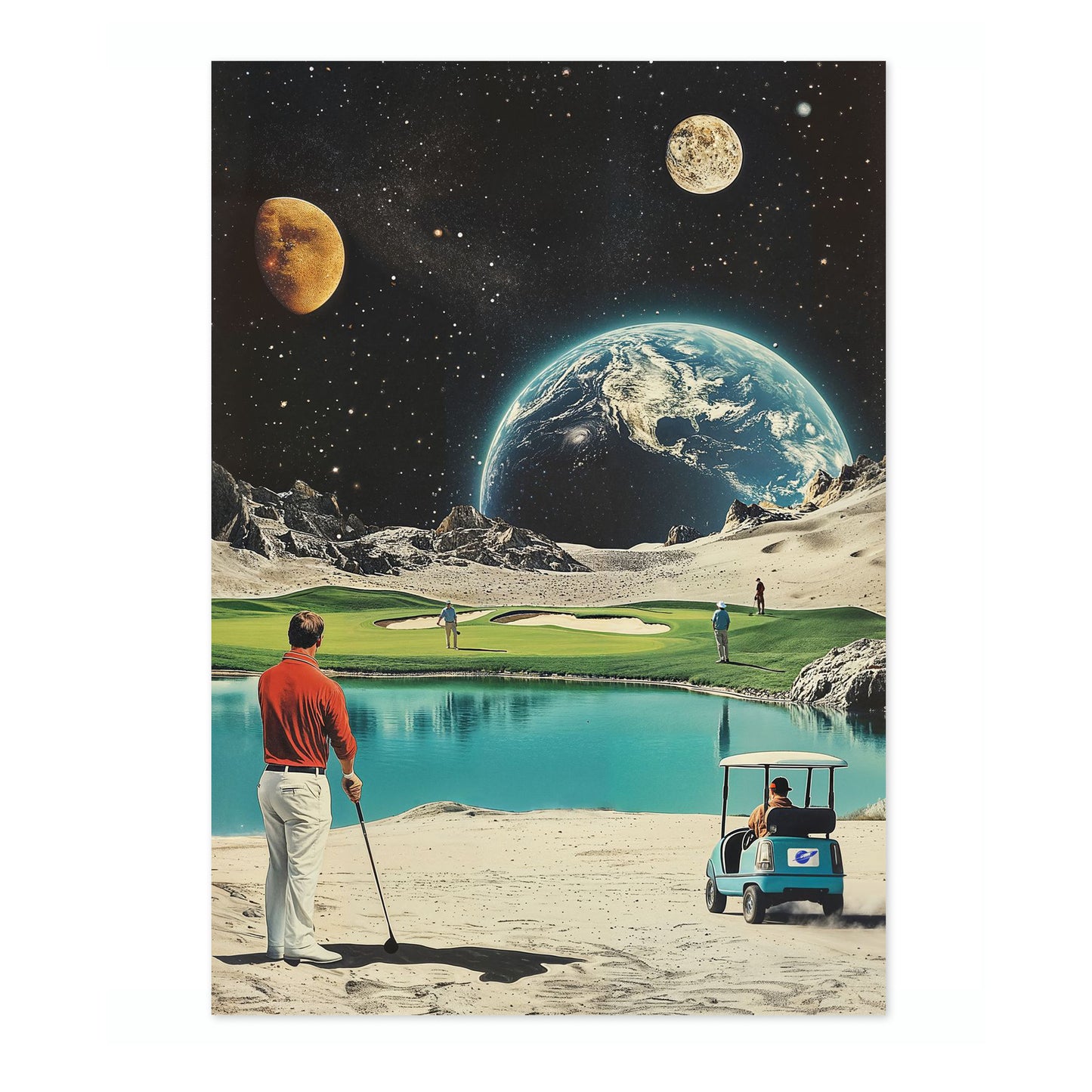 This "Moon Golf" poster artfully blends retro sci-fi with a sporting theme. Featuring Earth and distant planets as a backdrop, it showcases golfers on a moonlit course complete with a serene water hazard. The vintage illustration style and space elements create a unique intersection of sports and the cosmos, perfect for enthusiasts of both golf and space-themed decor.