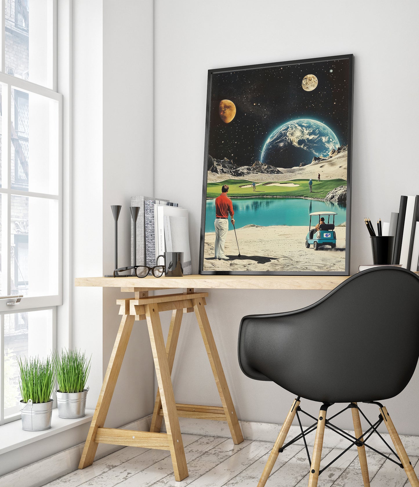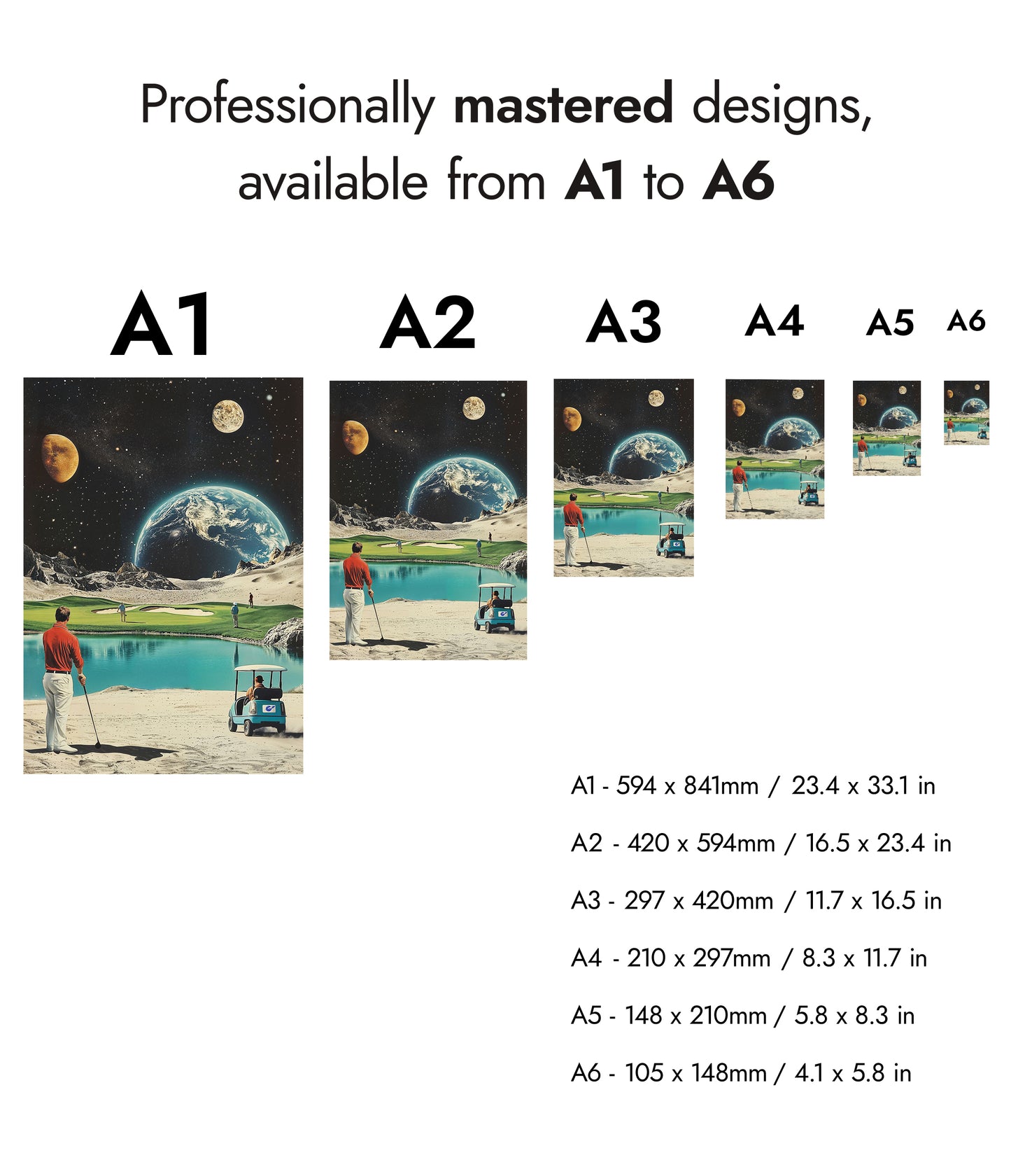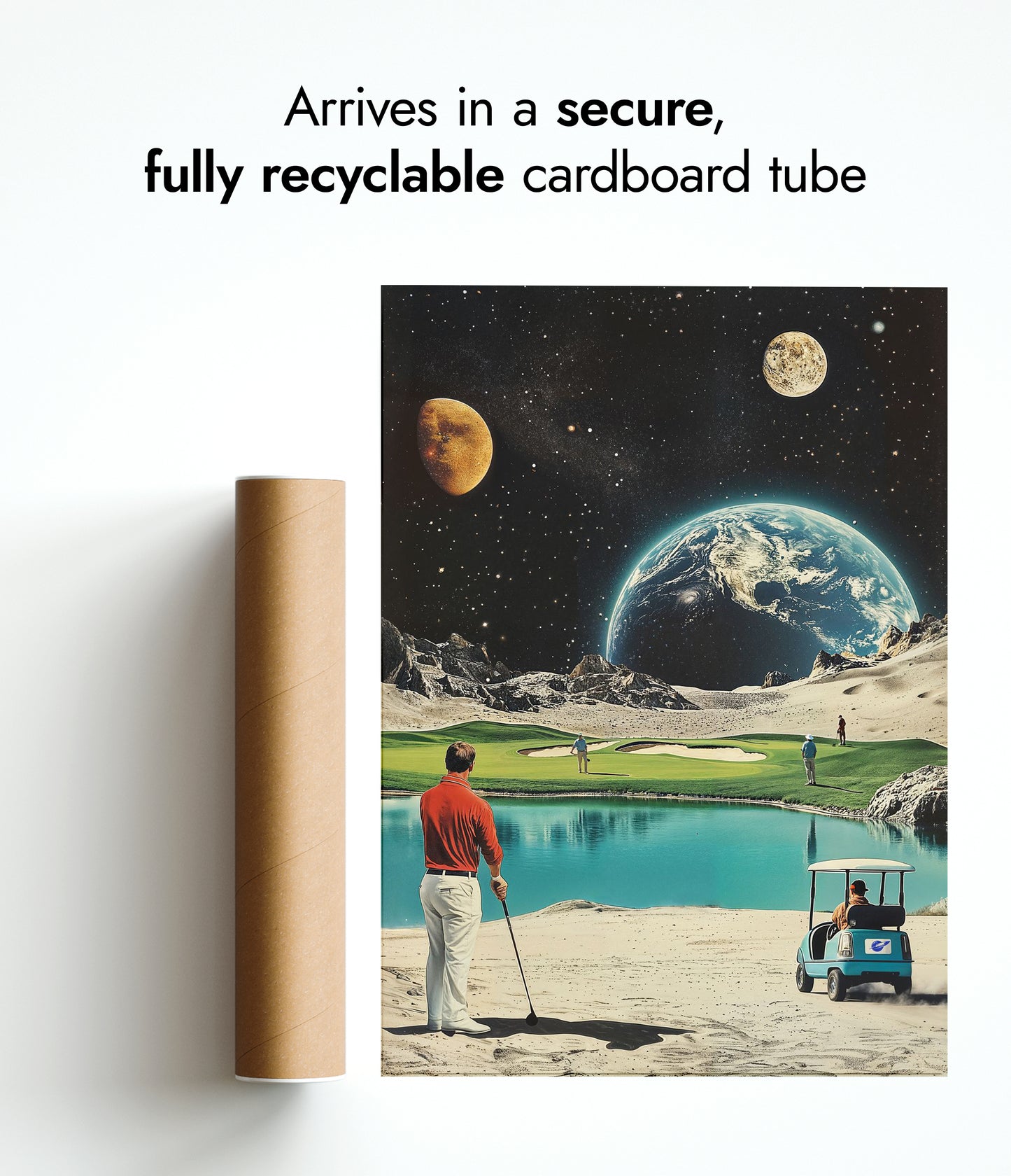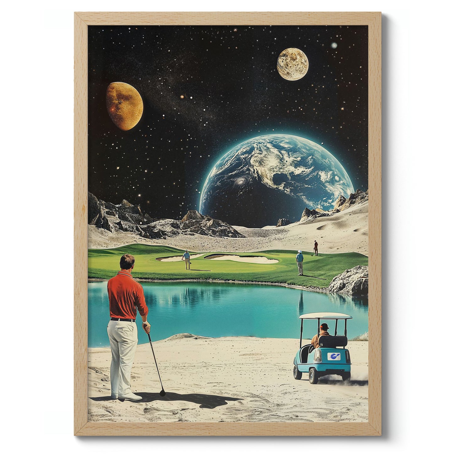 This "Moon Golf" poster artfully blends retro sci-fi with a sporting theme. Featuring Earth and distant planets as a backdrop, it showcases golfers on a moonlit course complete with a serene water hazard. The vintage illustration style and space elements create a unique intersection of sports and the cosmos, perfect for enthusiasts of both golf and space-themed decor.