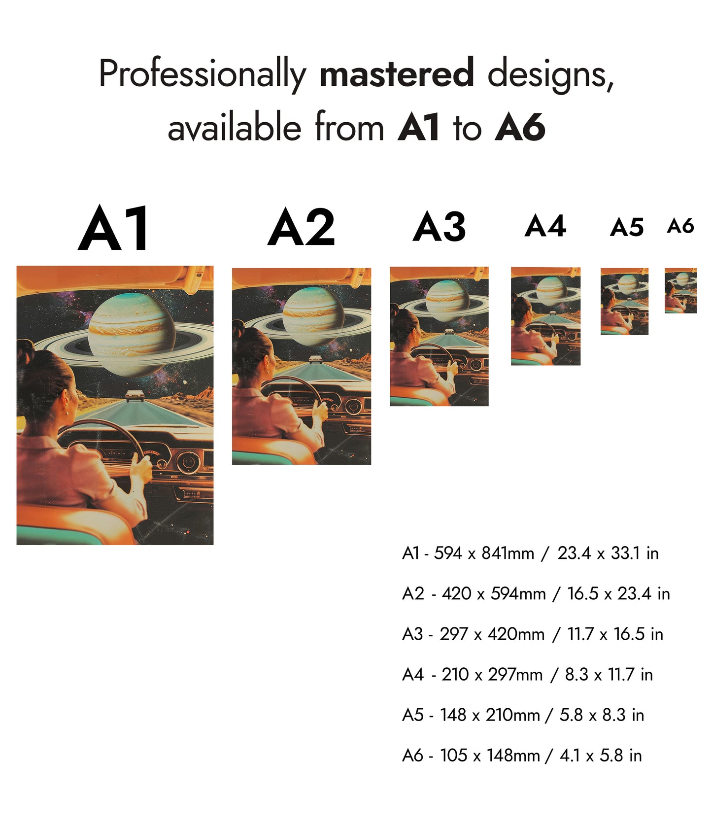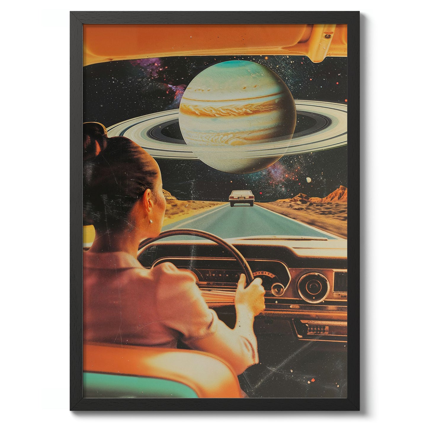 "Moon Highway" is a captivating sci-fi poster that artfully blends vintage aesthetics with cosmic wonder. It features a retro-inspired scene of a woman driving on an endless road, as the majestic Saturn looms large in the celestial sky. This striking illustration combines elements of adventure and space, offering a unique exploration of the universe from a classic era.