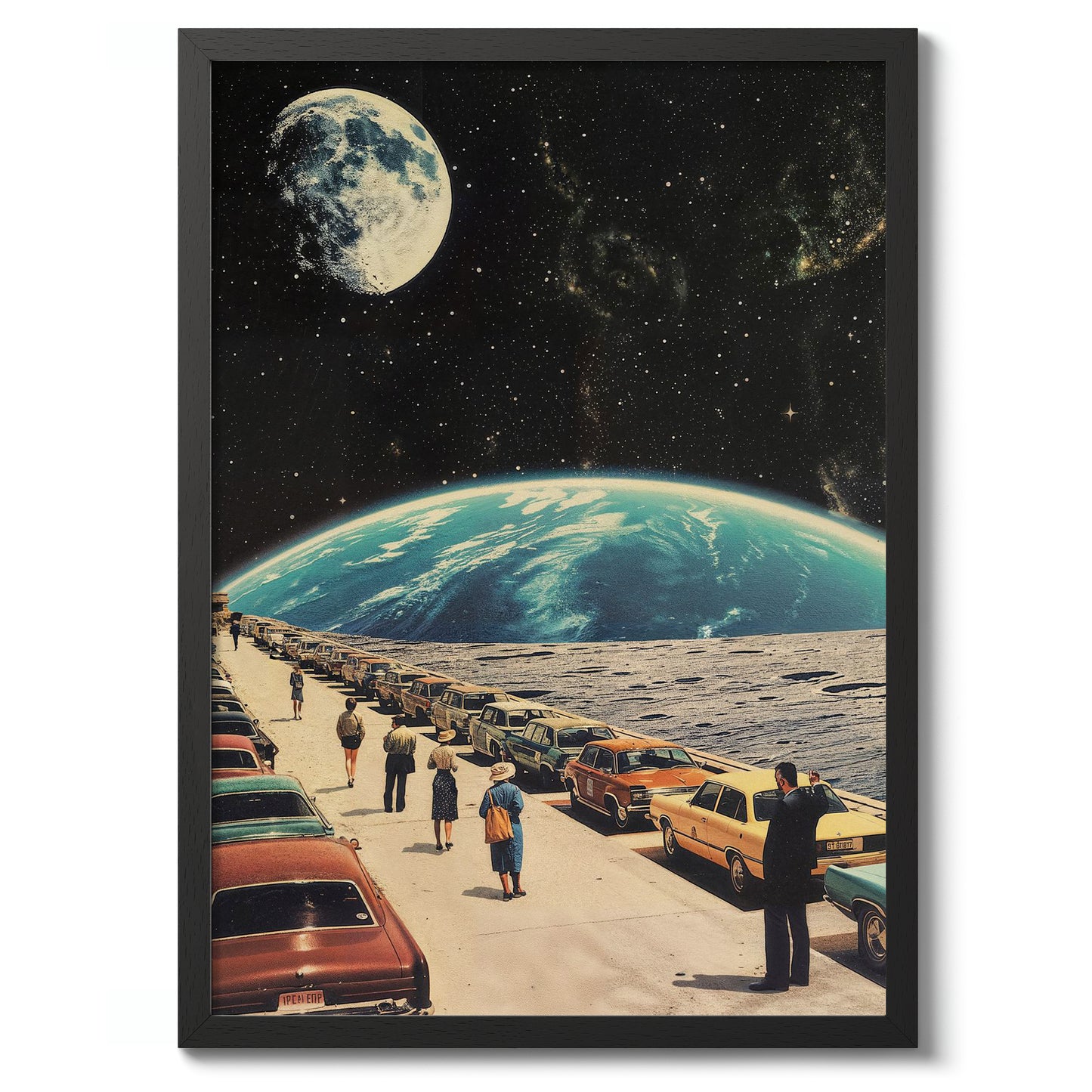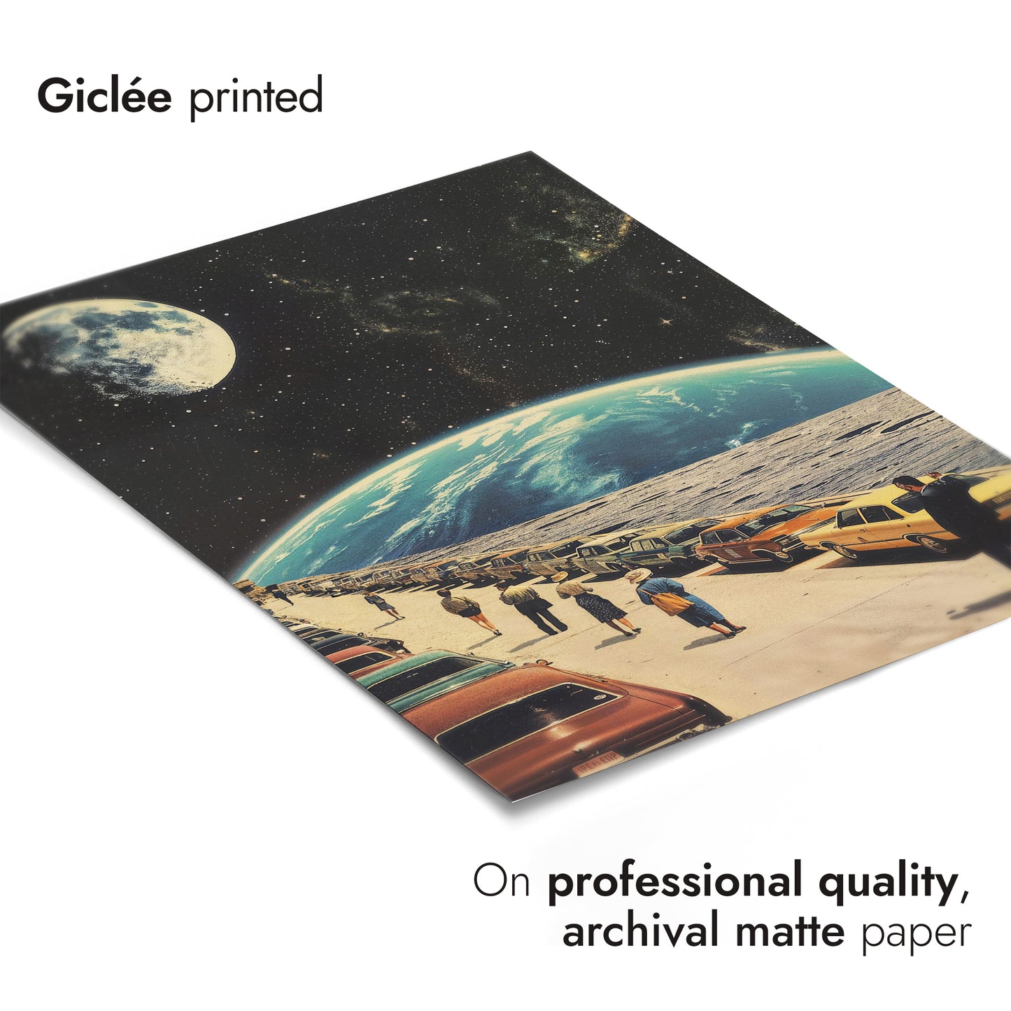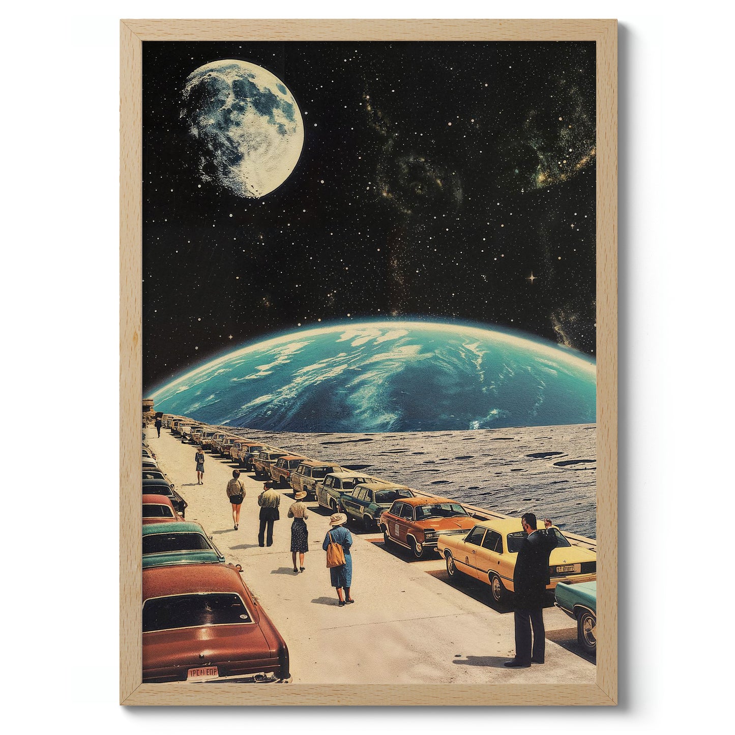 The "Moon Parking" poster presents a surreal, retro-inspired scene with a line of vintage cars parked on the moon's surface. Spectators, Earth, and a prominent crescent moon enhance the sci-fi atmosphere, capturing a unique blend of nostalgia and futuristic imagination. The artwork's juxtaposition of earthly elements with outer space creates a visually striking, thought-provoking illustration ideal for sci-fi and vintage art enthusiasts.