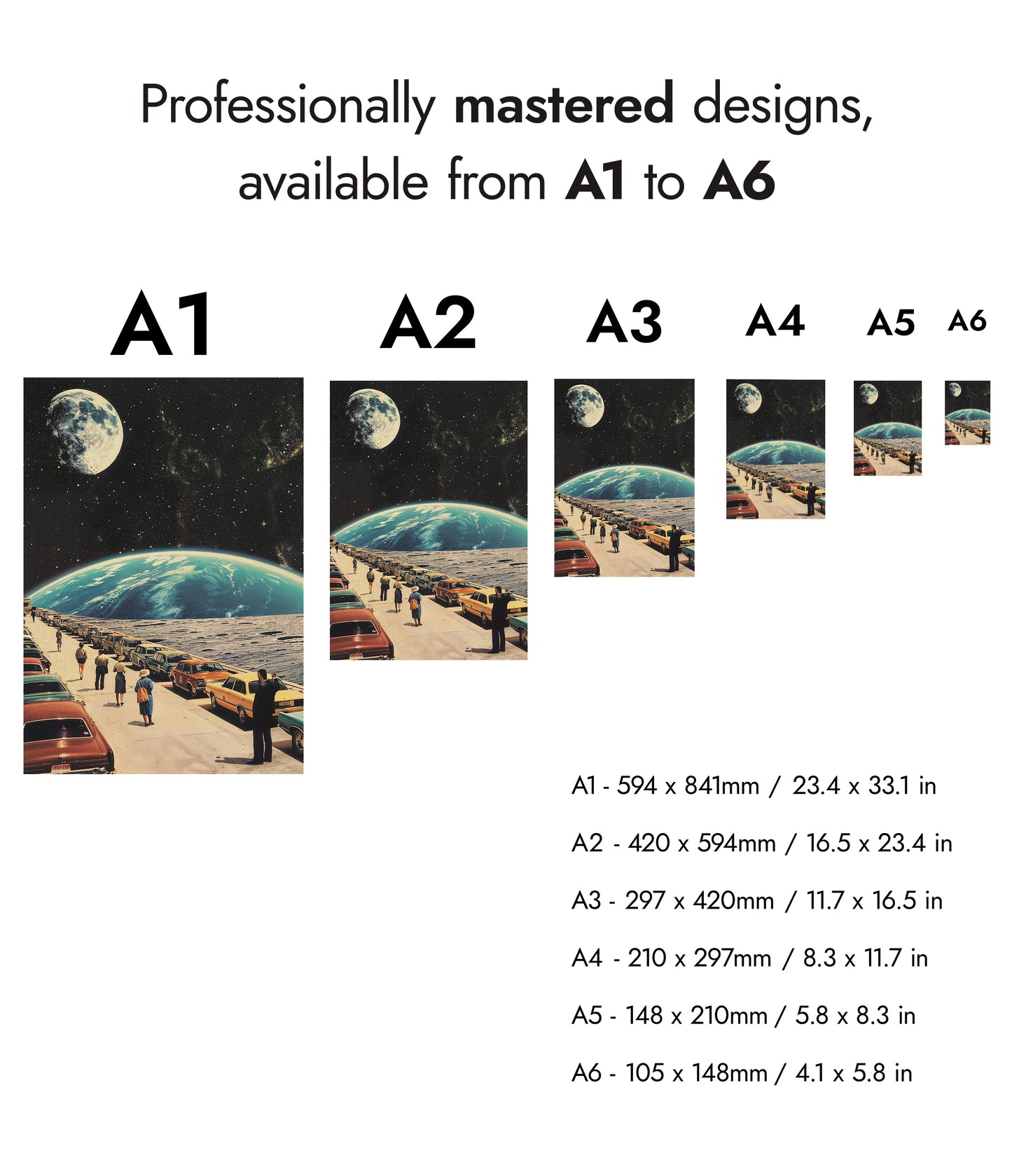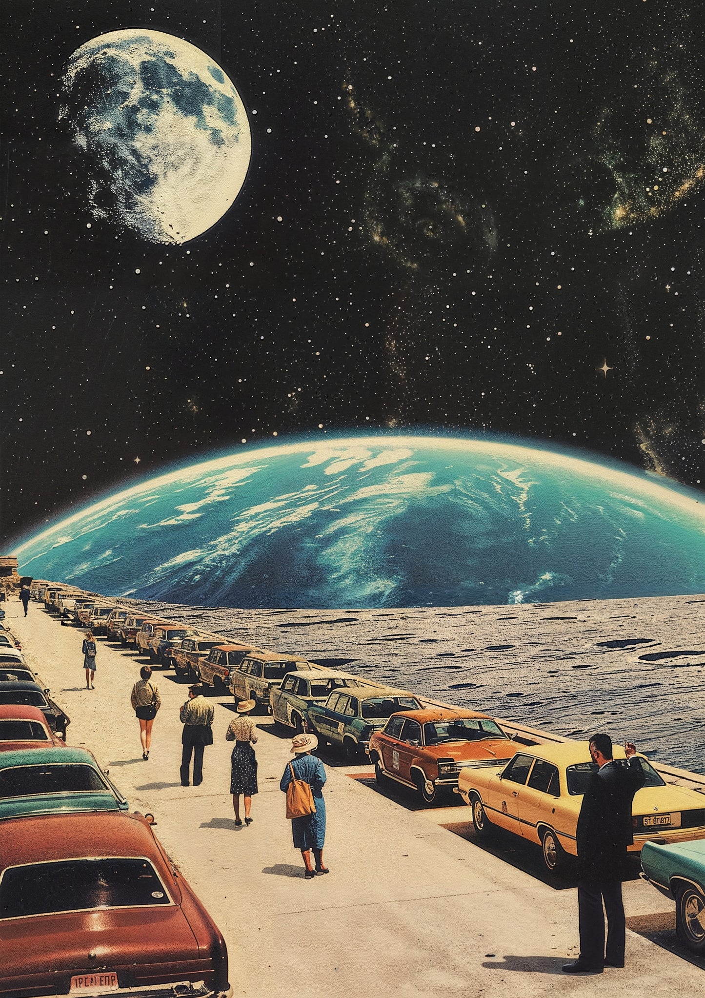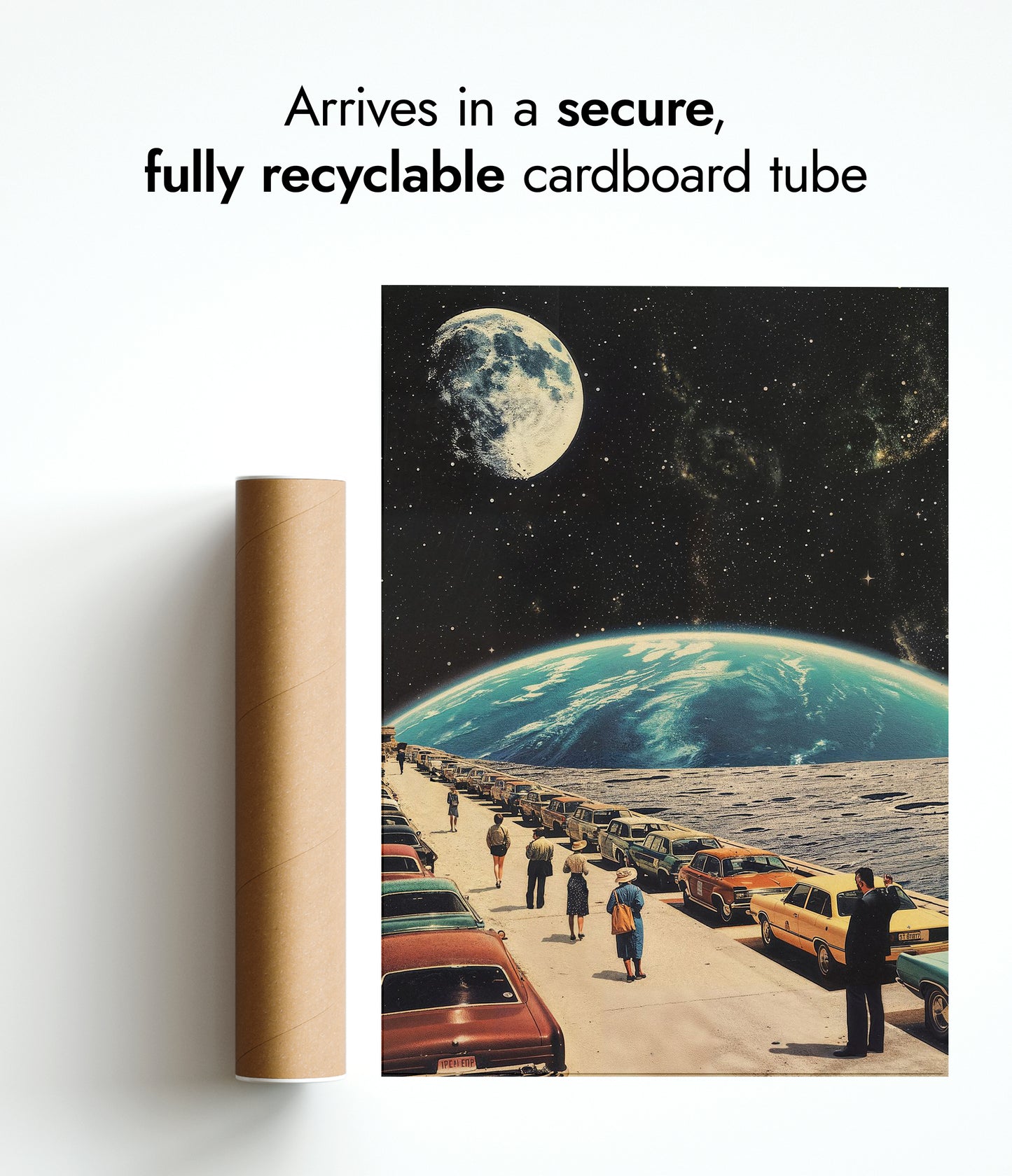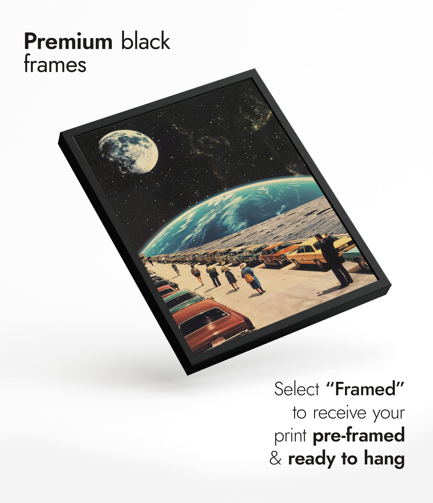 The "Moon Parking" poster presents a surreal, retro-inspired scene with a line of vintage cars parked on the moon's surface. Spectators, Earth, and a prominent crescent moon enhance the sci-fi atmosphere, capturing a unique blend of nostalgia and futuristic imagination. The artwork's juxtaposition of earthly elements with outer space creates a visually striking, thought-provoking illustration ideal for sci-fi and vintage art enthusiasts.