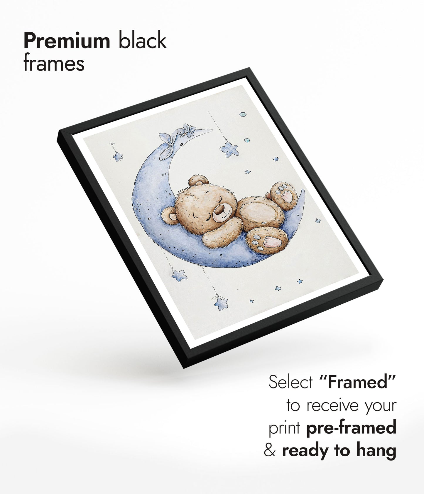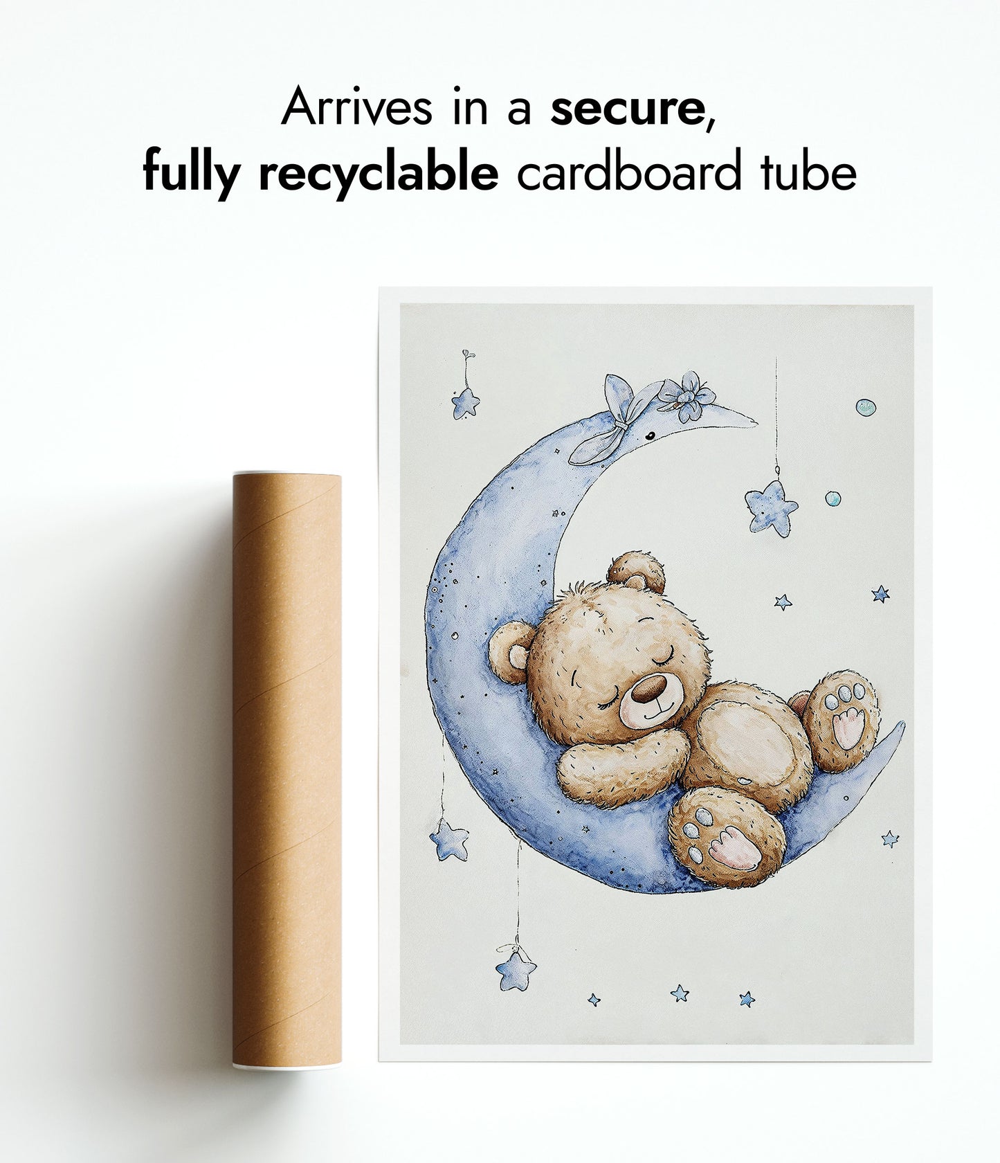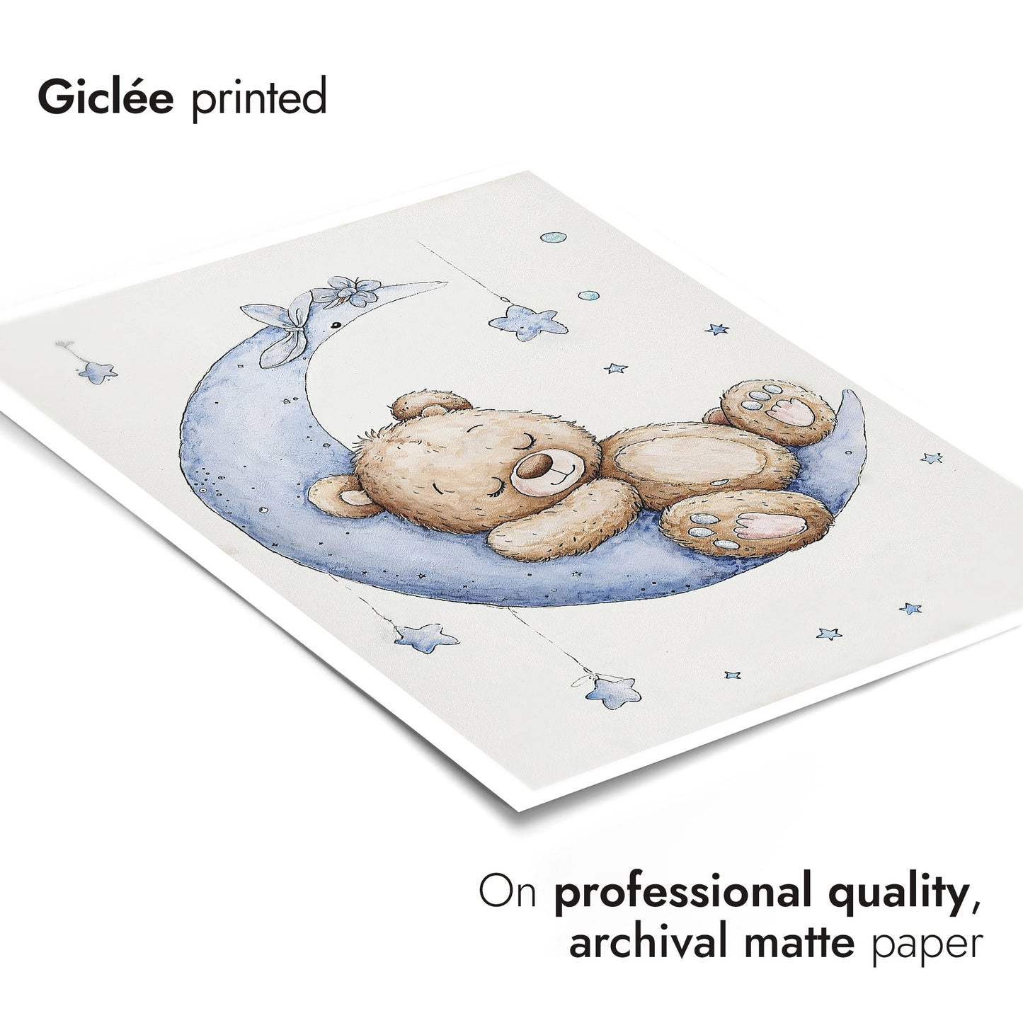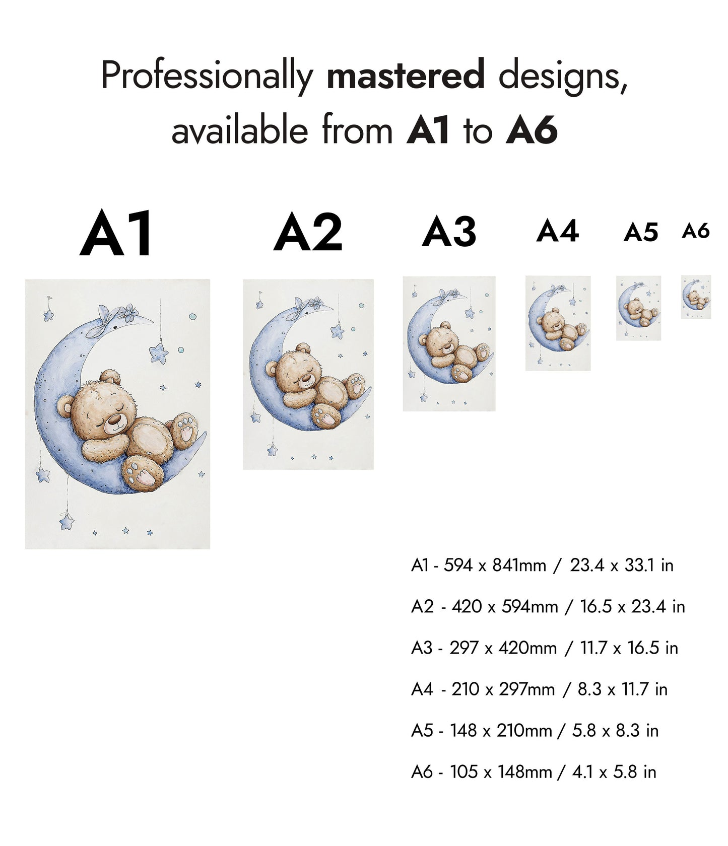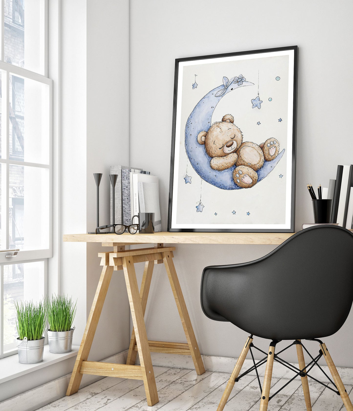 This charming poster features a sleepy teddy bear resting on a crescent moon, surrounded by stars. The soft, pastel illustration captures the innocence and tranquility perfect for a nursery. Ideal for creating a calming environment, this "Moon Teddy Bear" poster adds a whimsical touch to any child's room.