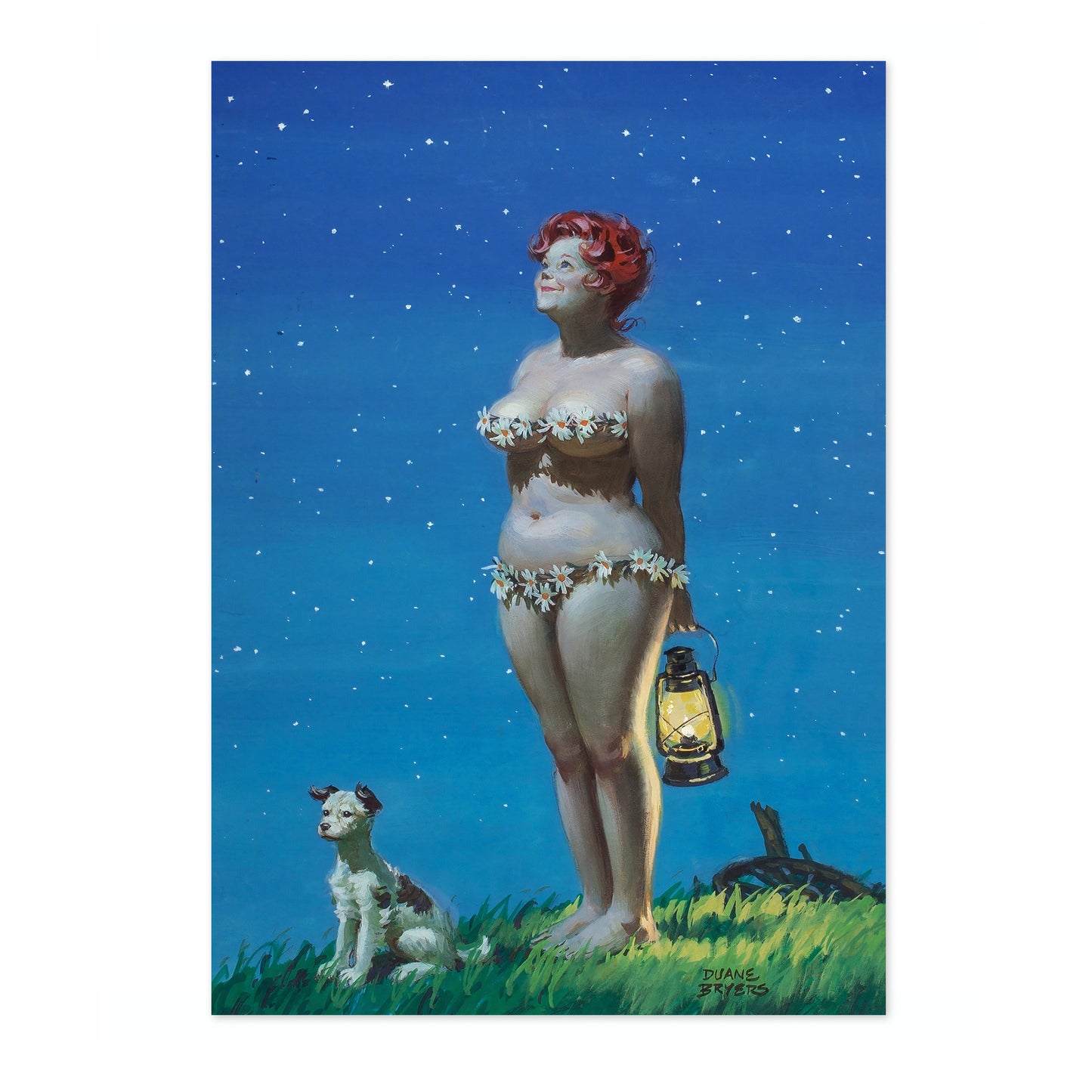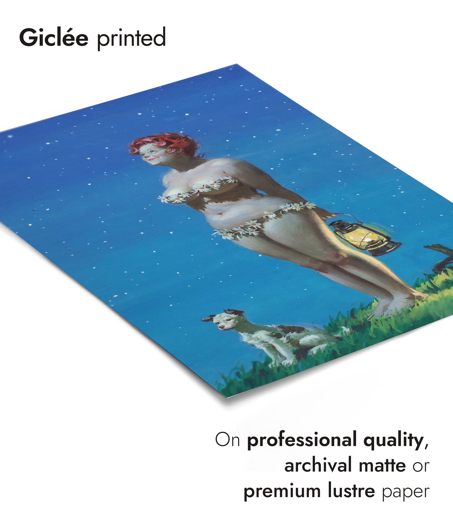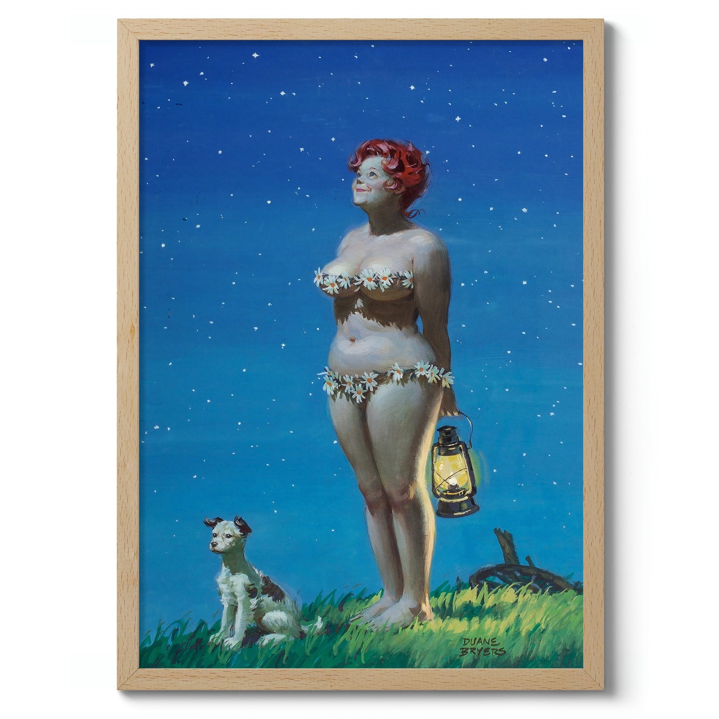 "Moonlit Hilda" is a captivating vintage pin-up poster showcasing a vibrant scene under a starry night sky. The cheerful woman adorned with daisy chains stands confidently, holding a lantern, accompanied by a loyal dog at her feet. The vivid blues and warm hues of the painting make it a stunning and nostalgic piece for art lovers.