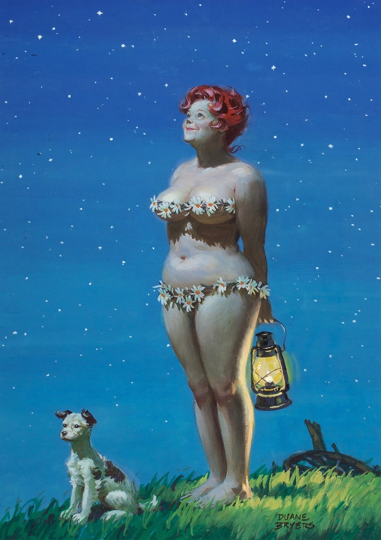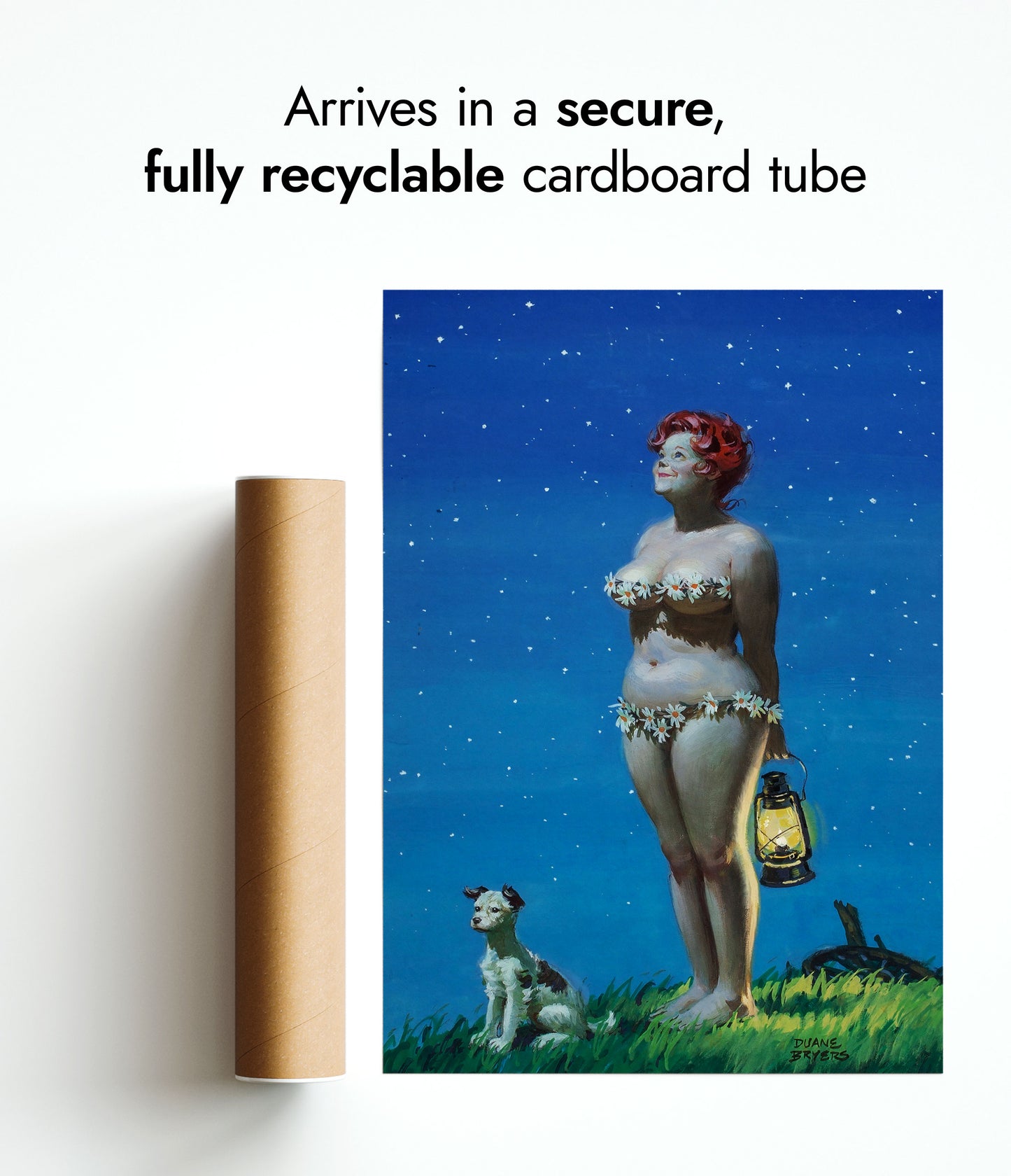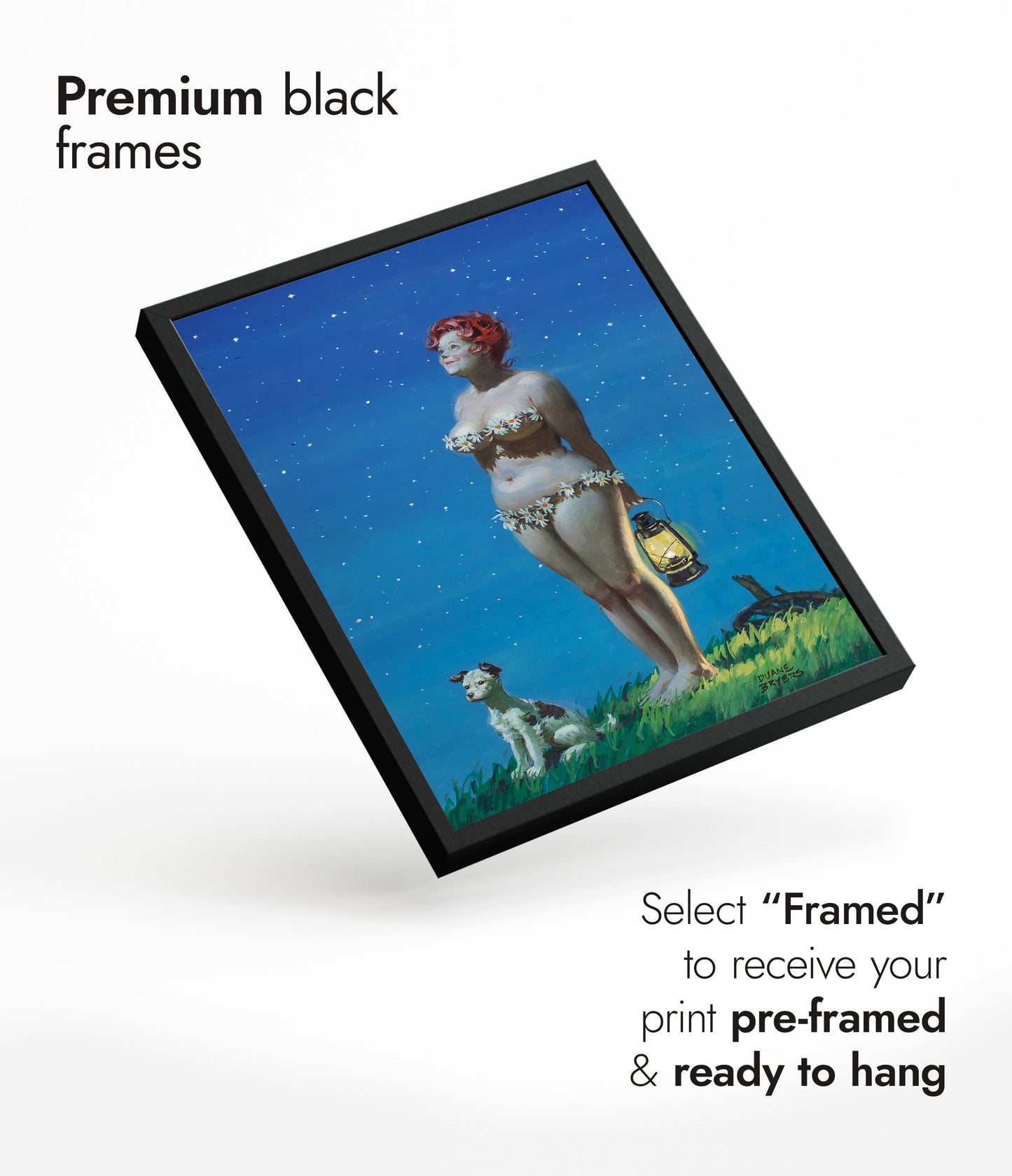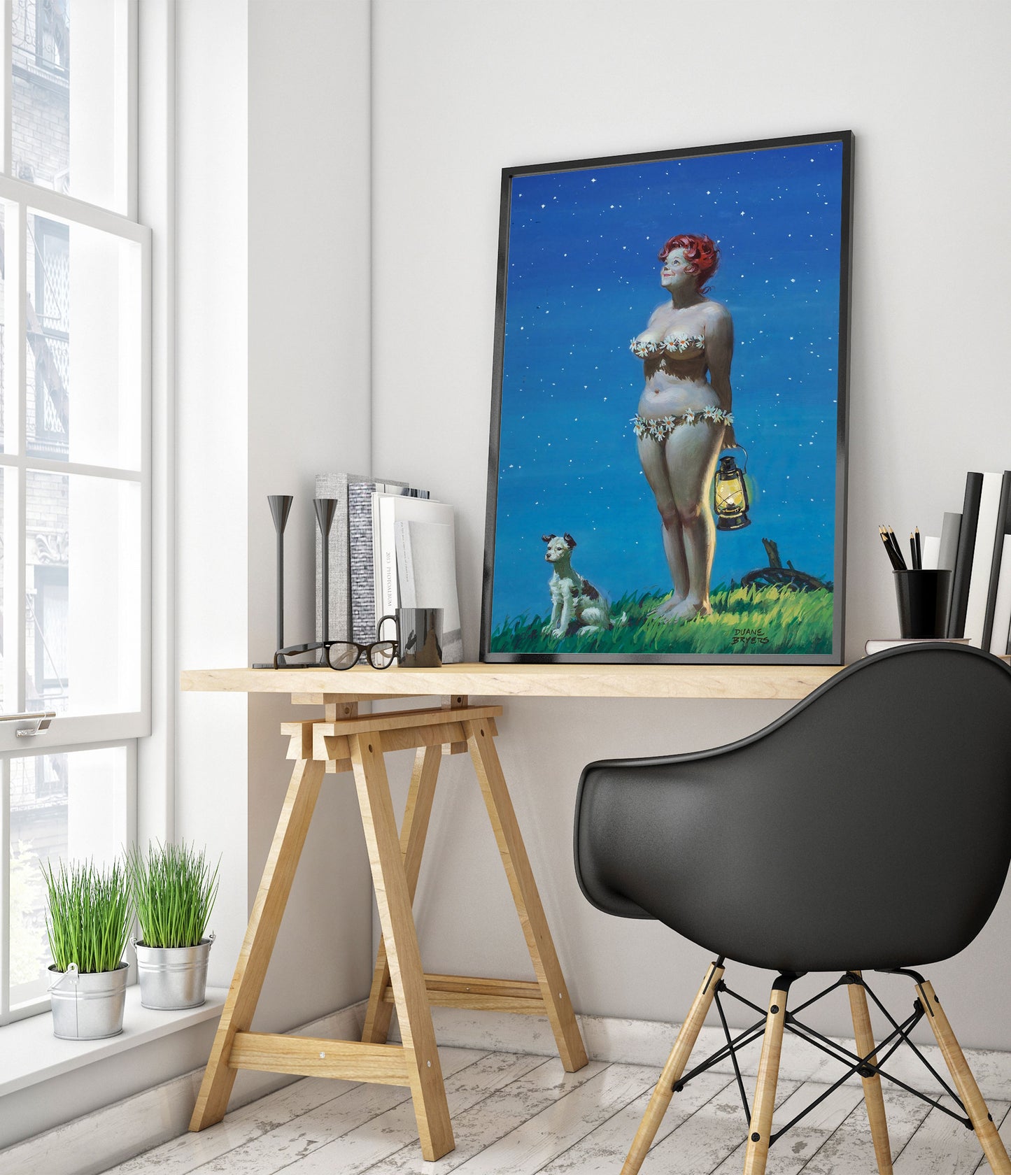 "Moonlit Hilda" is a captivating vintage pin-up poster showcasing a vibrant scene under a starry night sky. The cheerful woman adorned with daisy chains stands confidently, holding a lantern, accompanied by a loyal dog at her feet. The vivid blues and warm hues of the painting make it a stunning and nostalgic piece for art lovers.