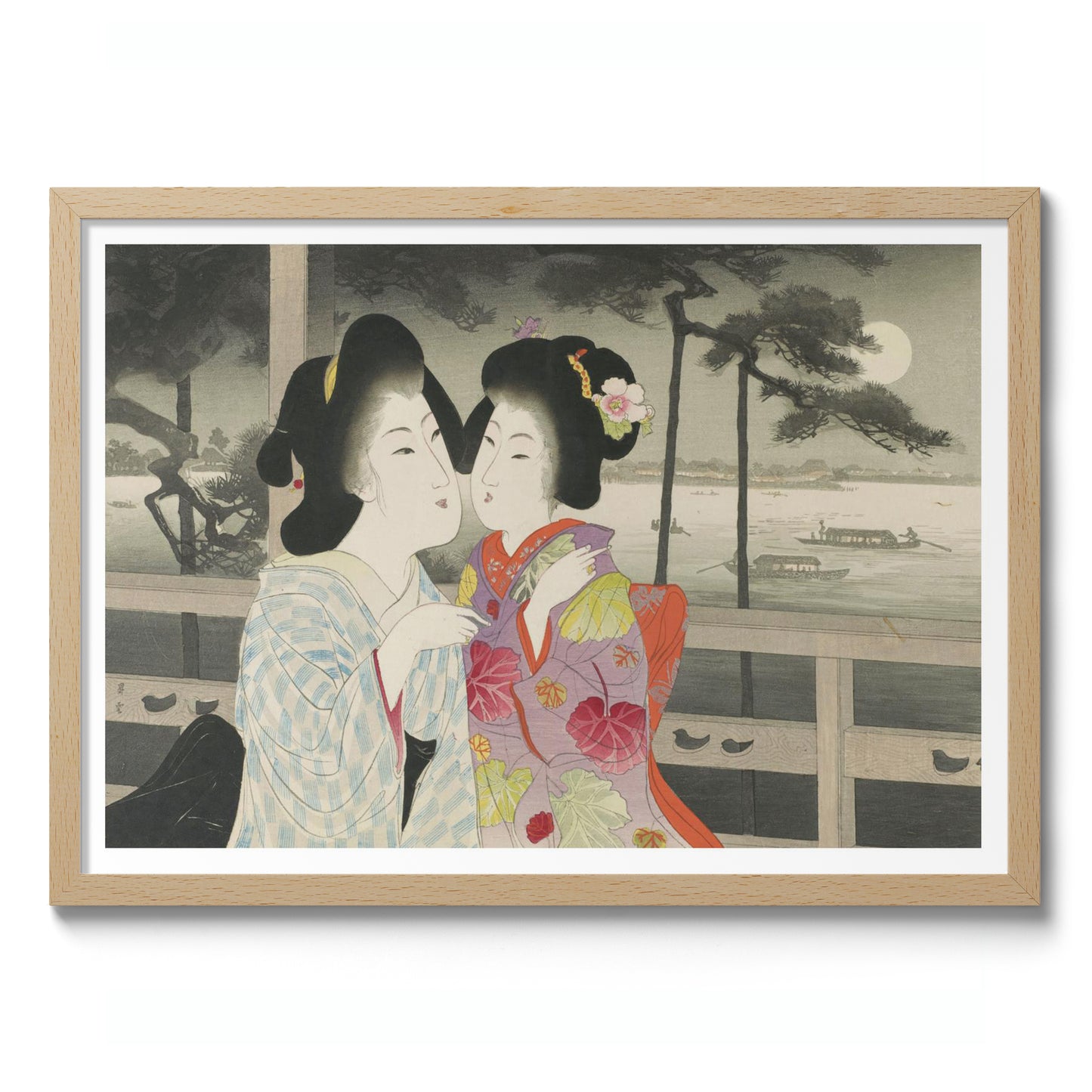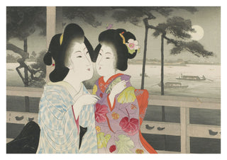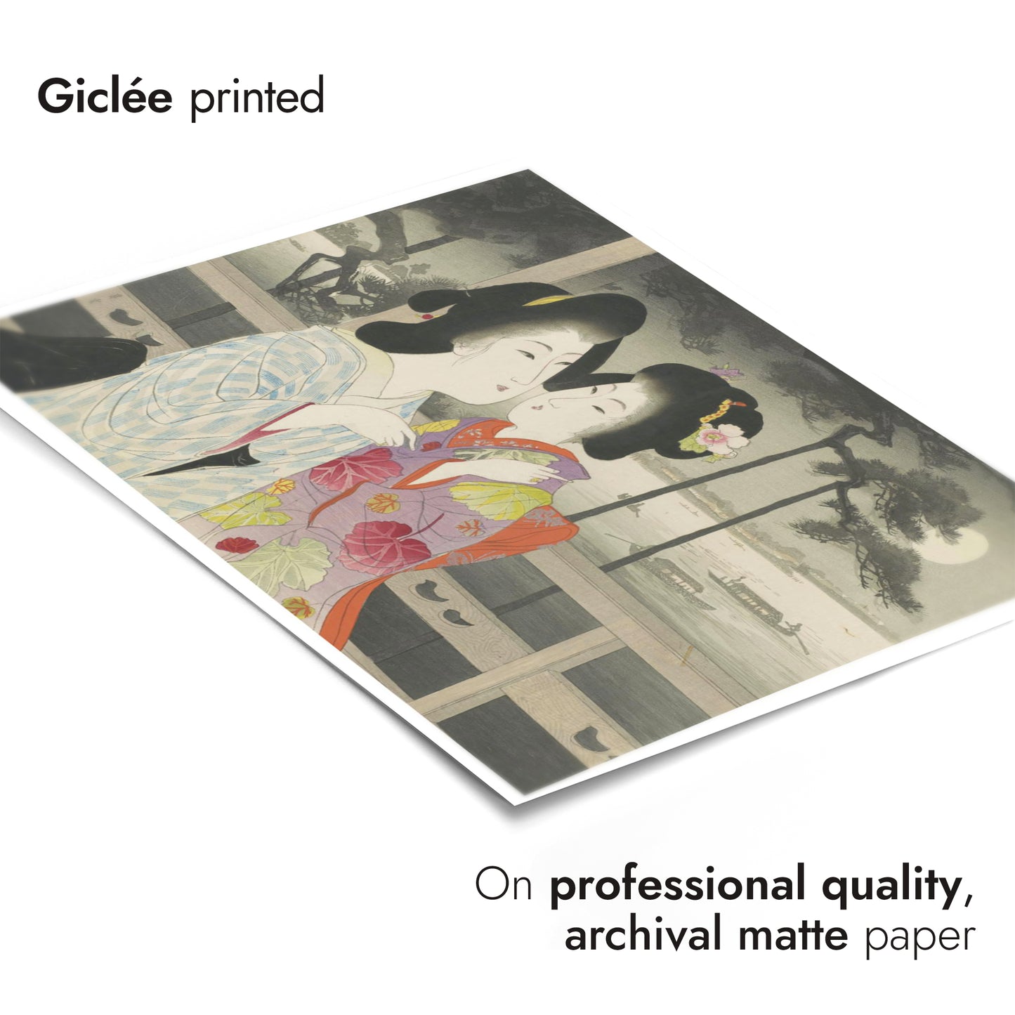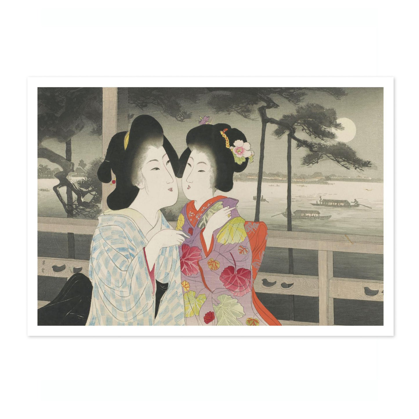 This "Moonlit Night" print by Yamamoto Shoun, created in 1906, beautifully captures a serene evening scene in traditional Japanese woodblock style. The poster features two elegantly dressed women in vibrant kimonos sharing an intimate moment by a tranquil lakeside. The grey and pink hues highlight the moonlit serenity, complemented by the presence of boats and distant trees.